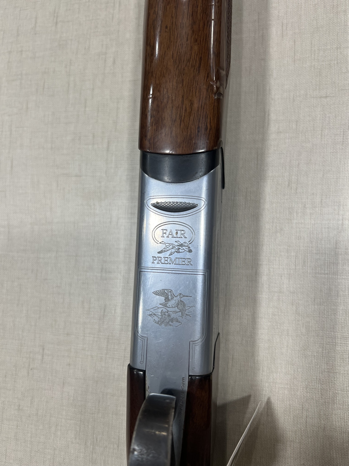 Espingarda de madeira e metal com gravações e texto FAIR PREMIER