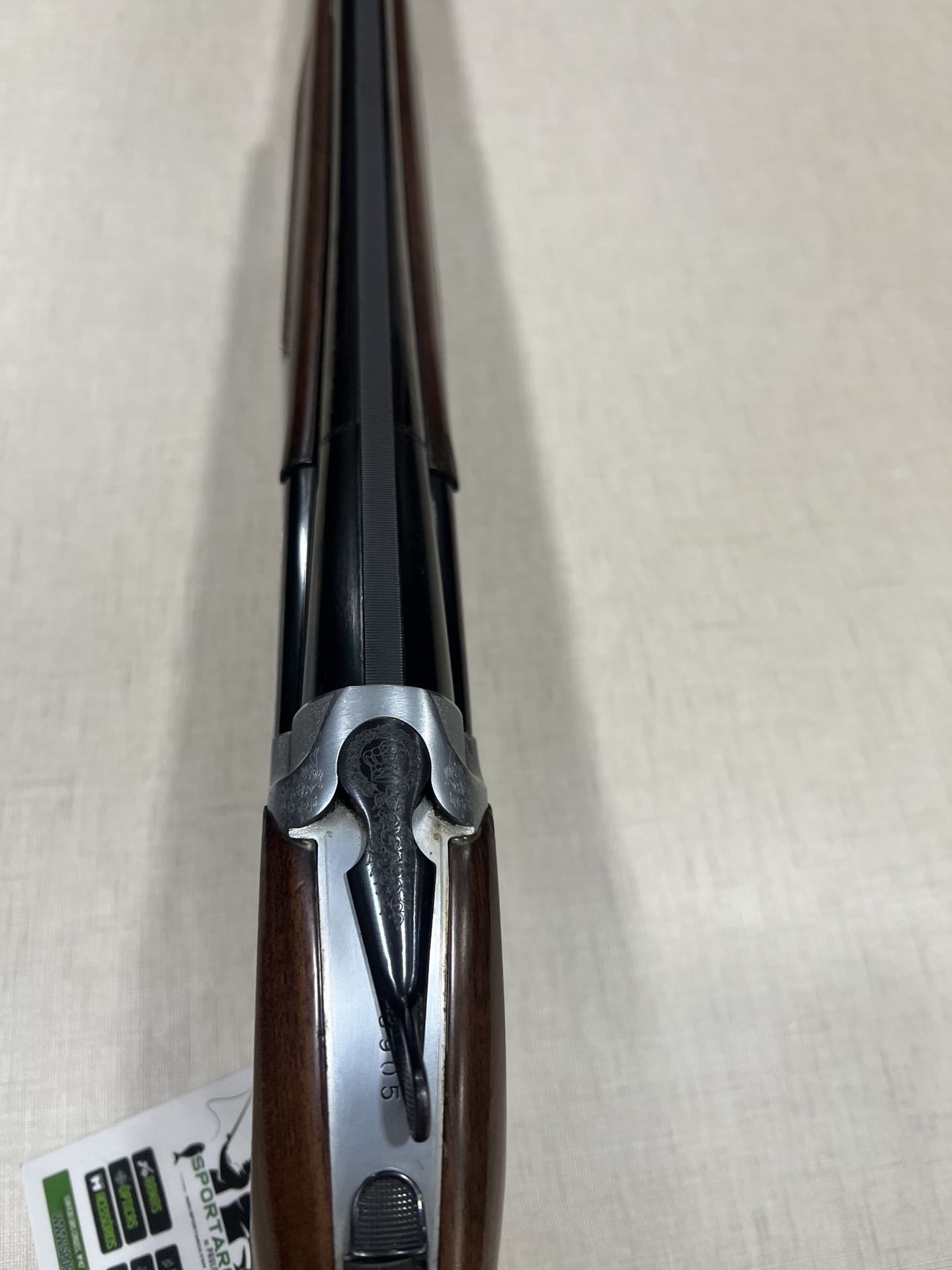 Espingarda de cano duplo em metal preto e madeira castanha vista de cima