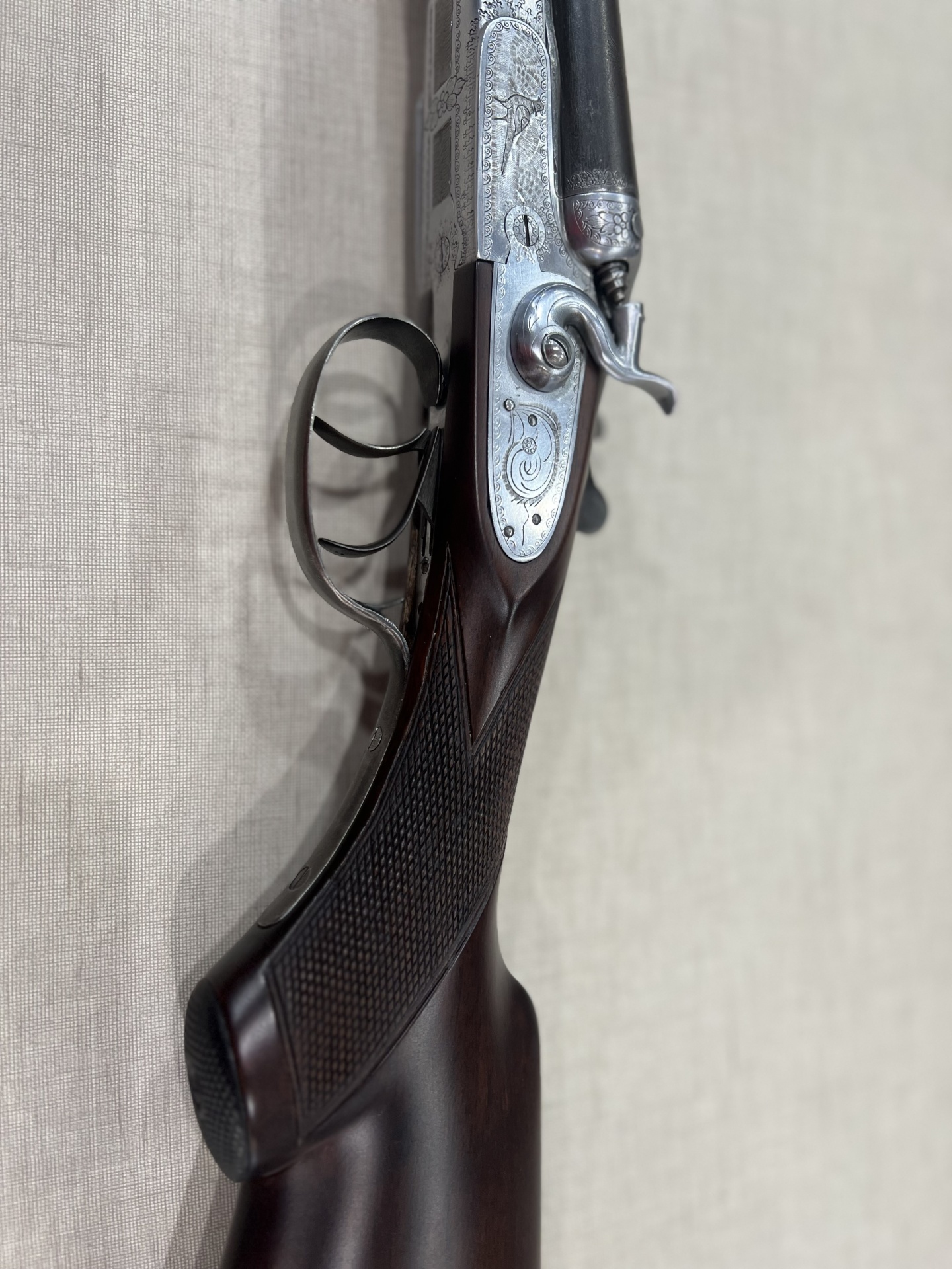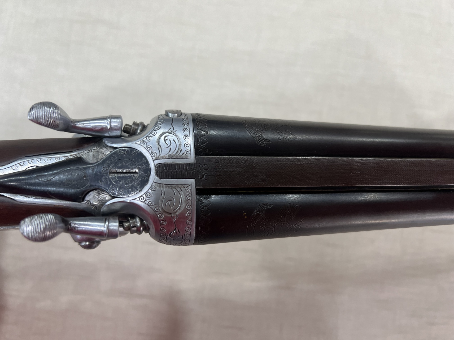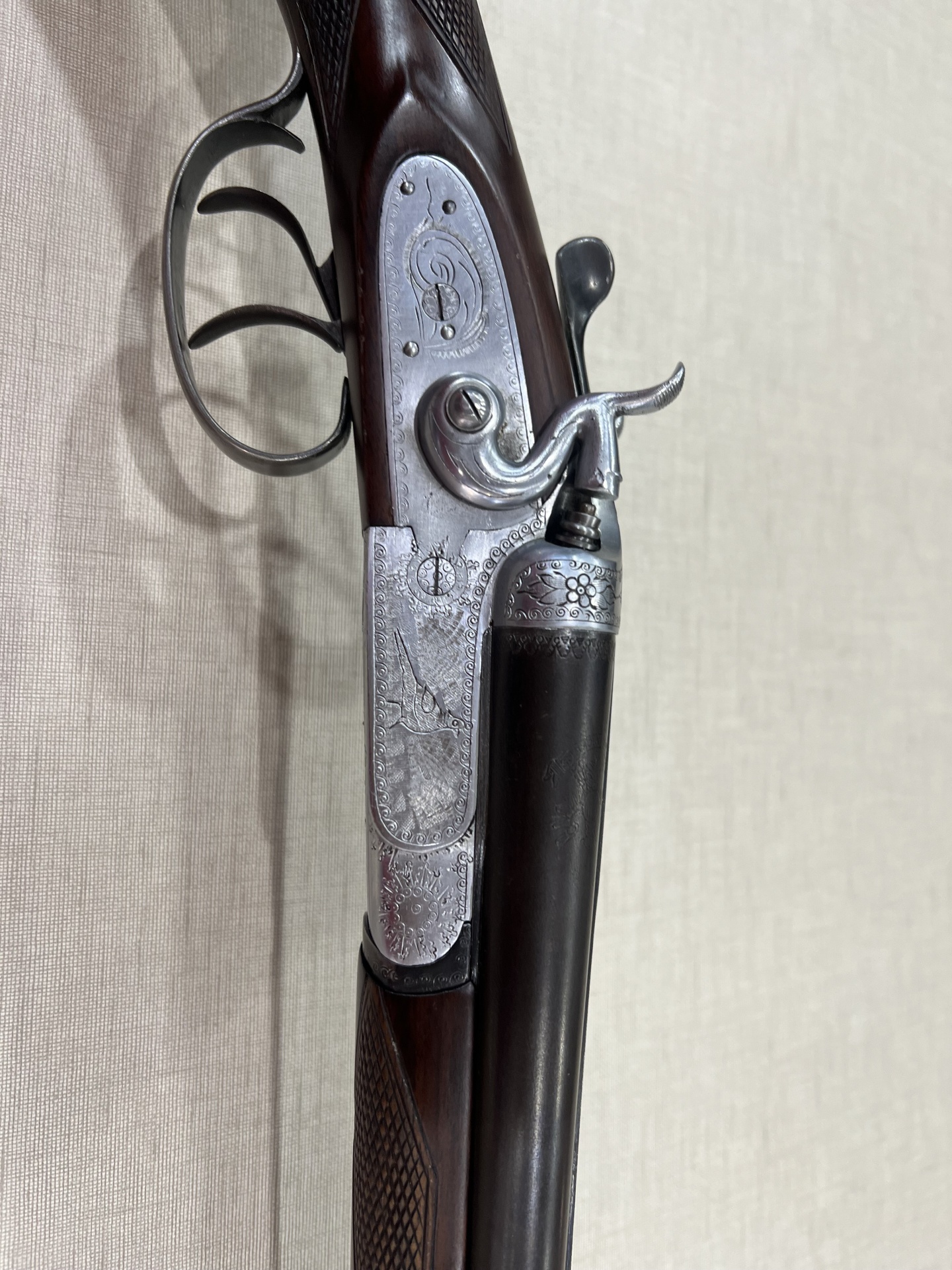 Espingarda de canos paralelos com empunhadura de madeira castanha trabalhada e detalhes metálicos prateados