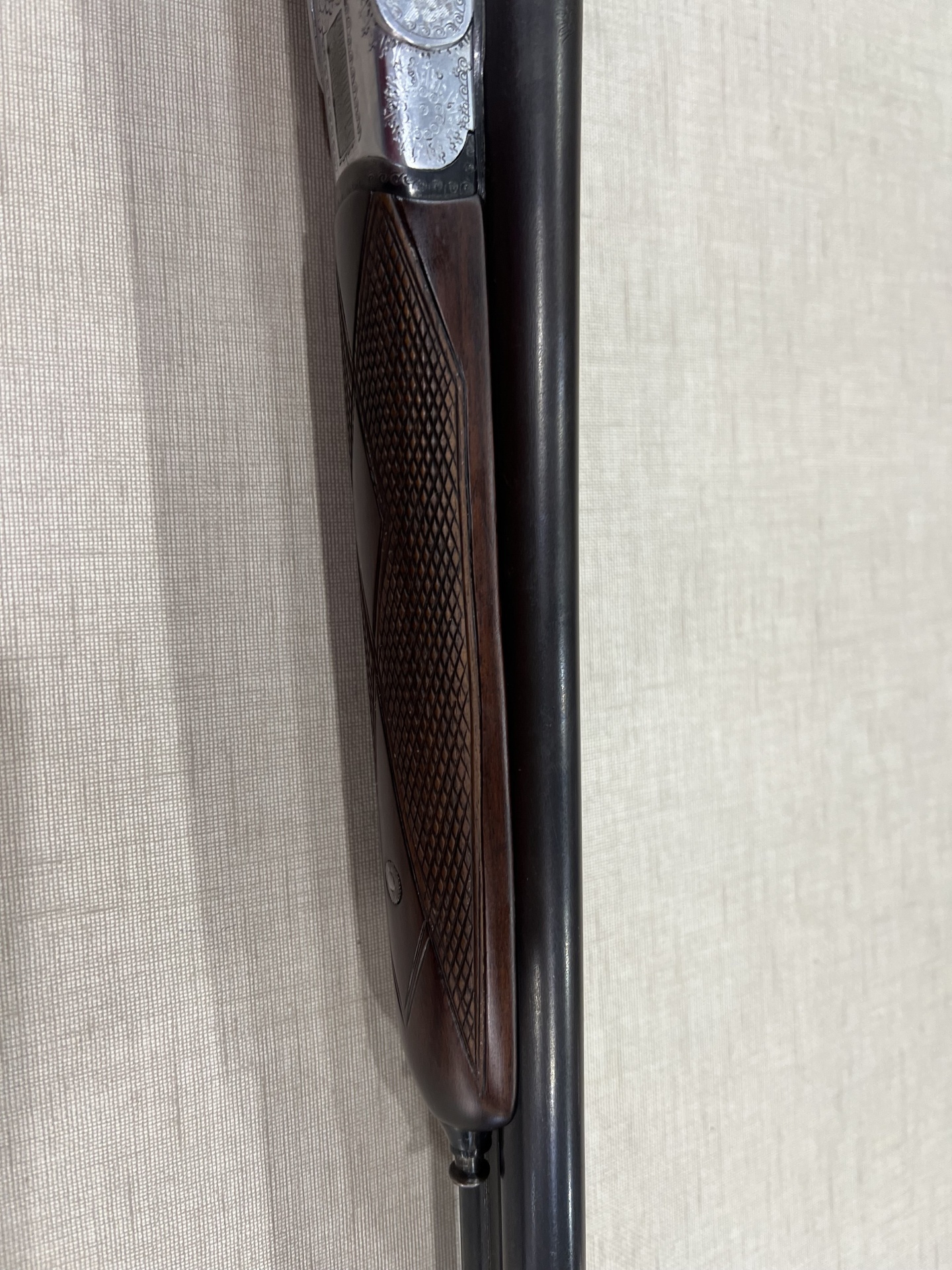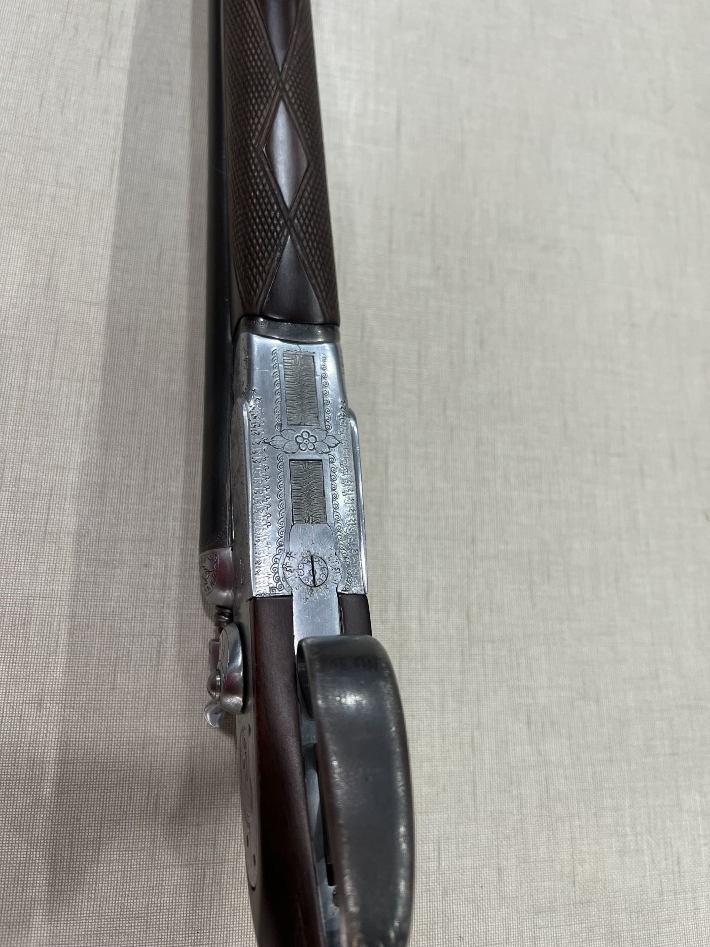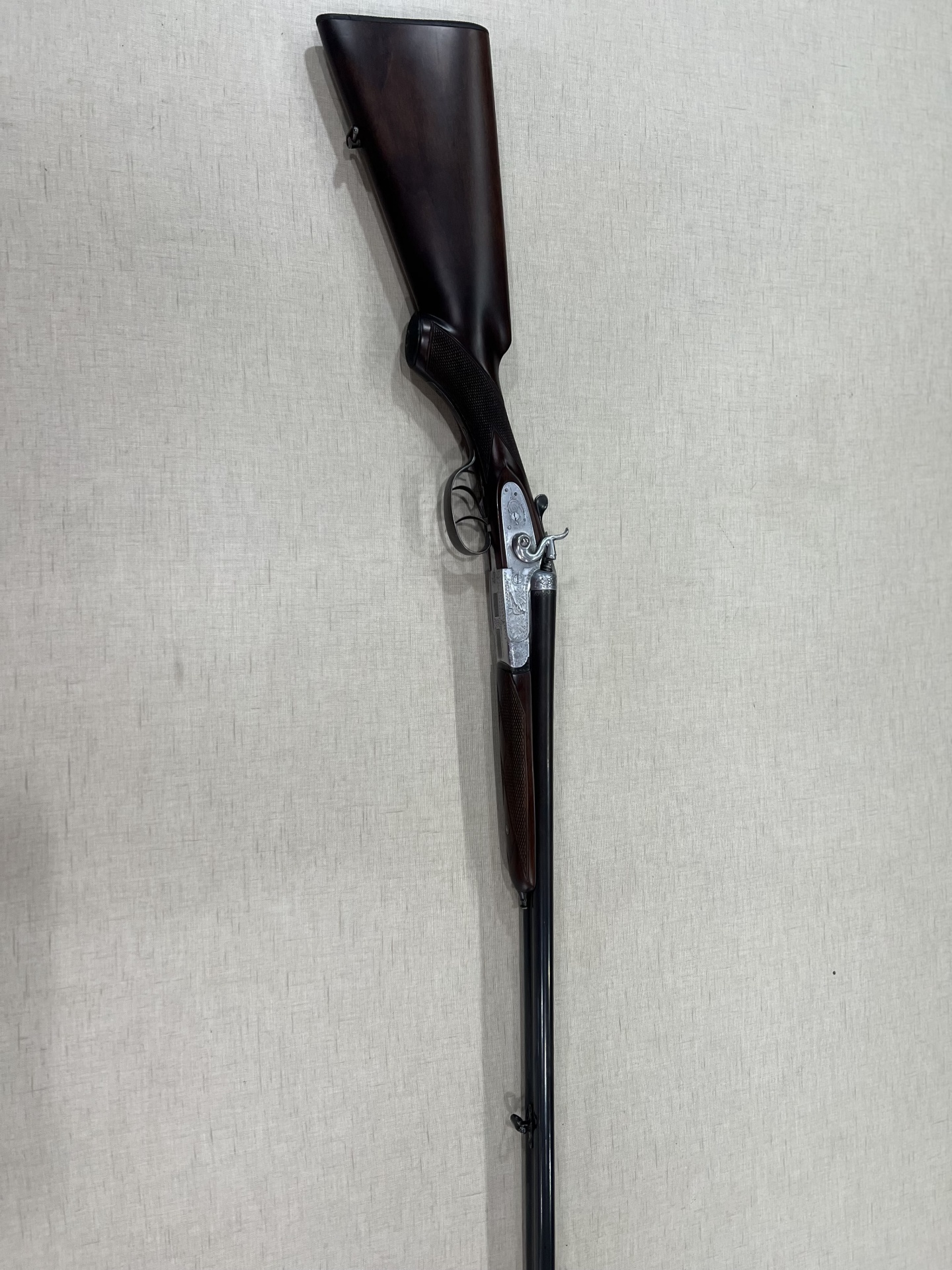 Espingarda de canos paralelos com empunhadura de madeira castanha trabalhada e detalhes metálicos prateados