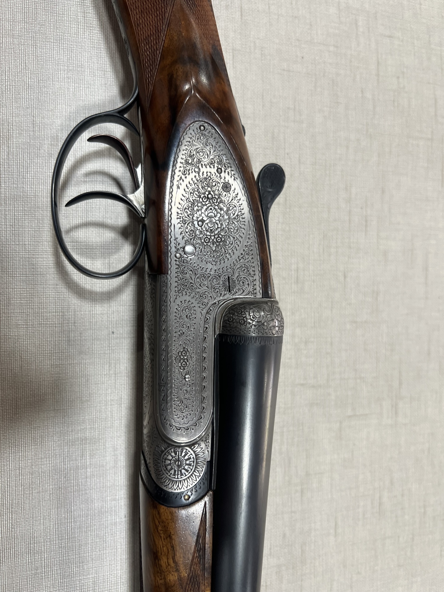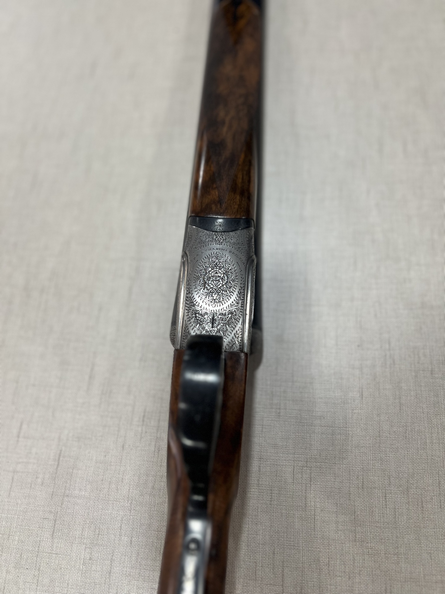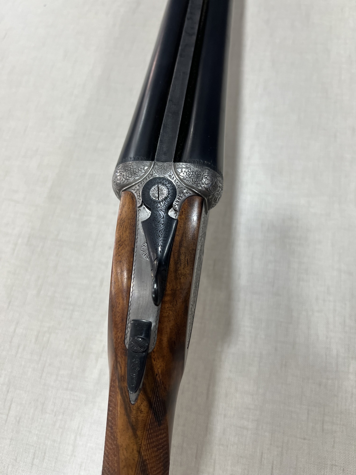 Espingarda de canos basculantes com madeira escura e acabamento metálico gravado sobre tecido cinza