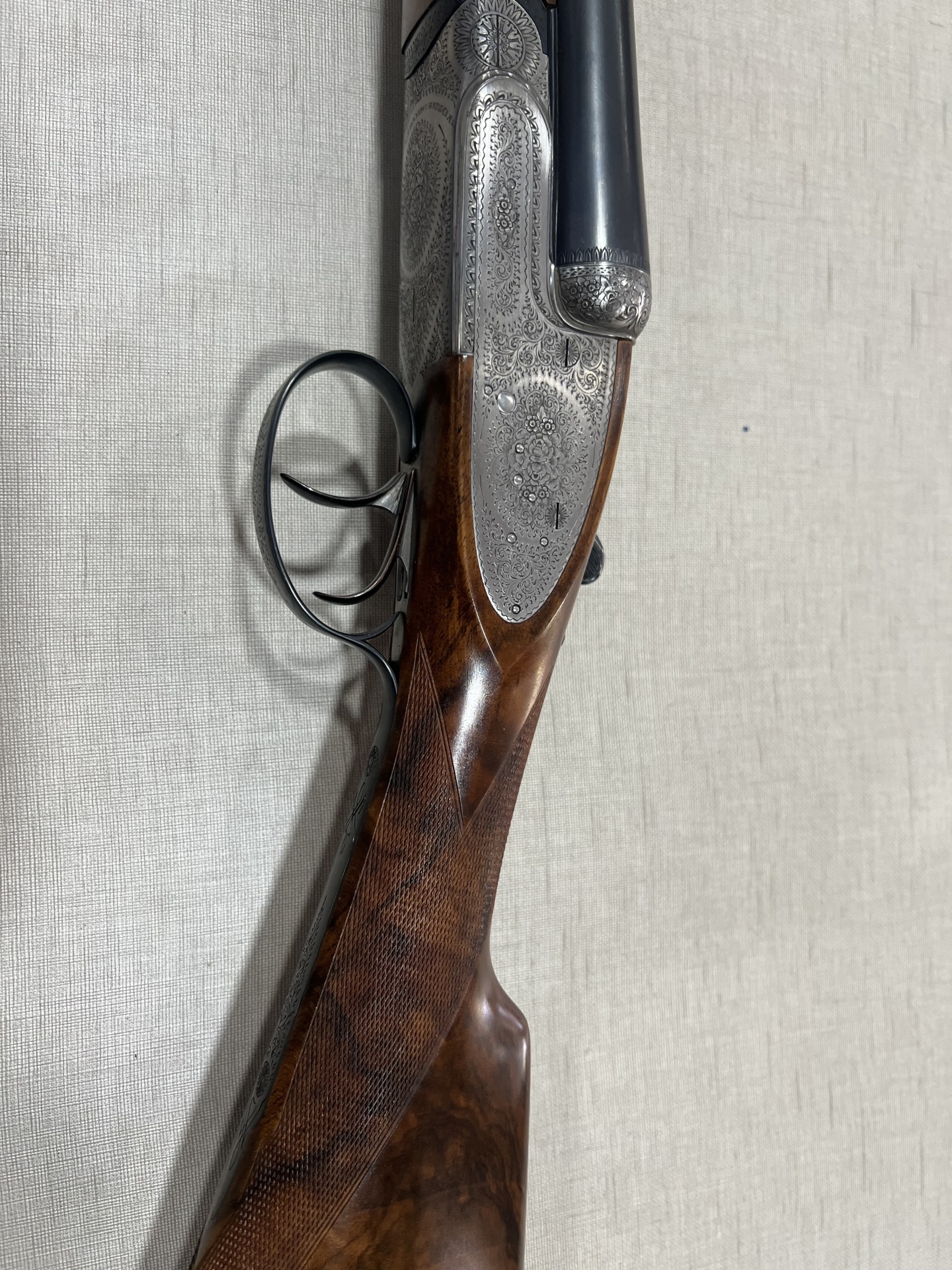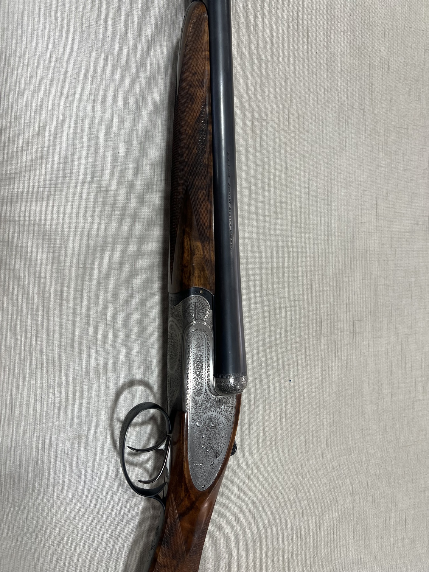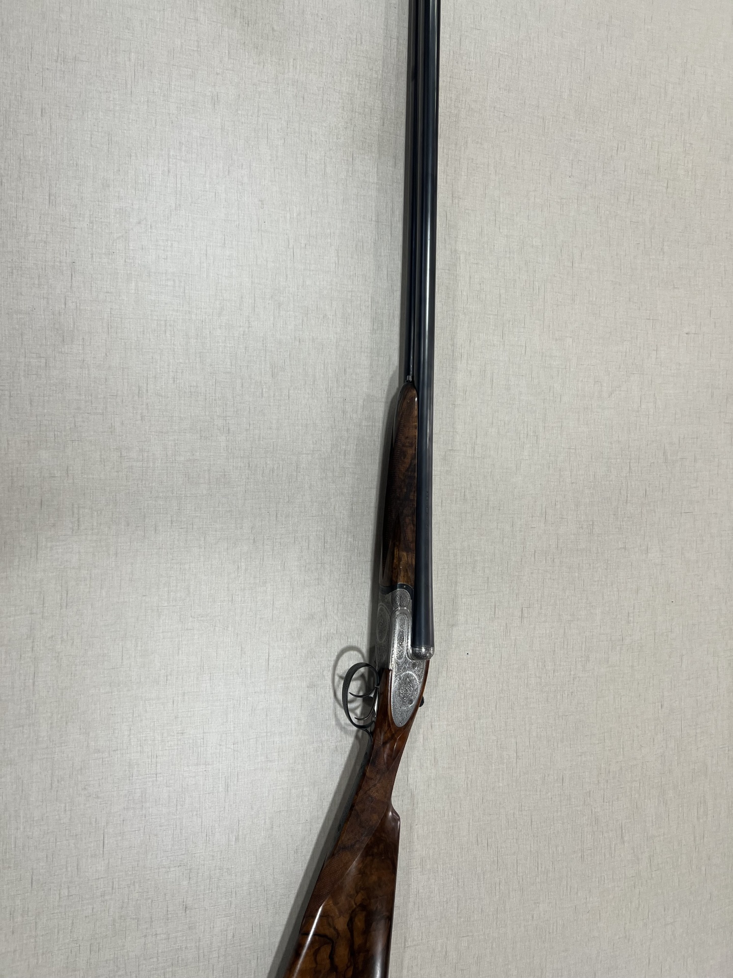 Espingarda de canos basculantes com madeira escura e acabamento metálico gravado sobre tecido cinza