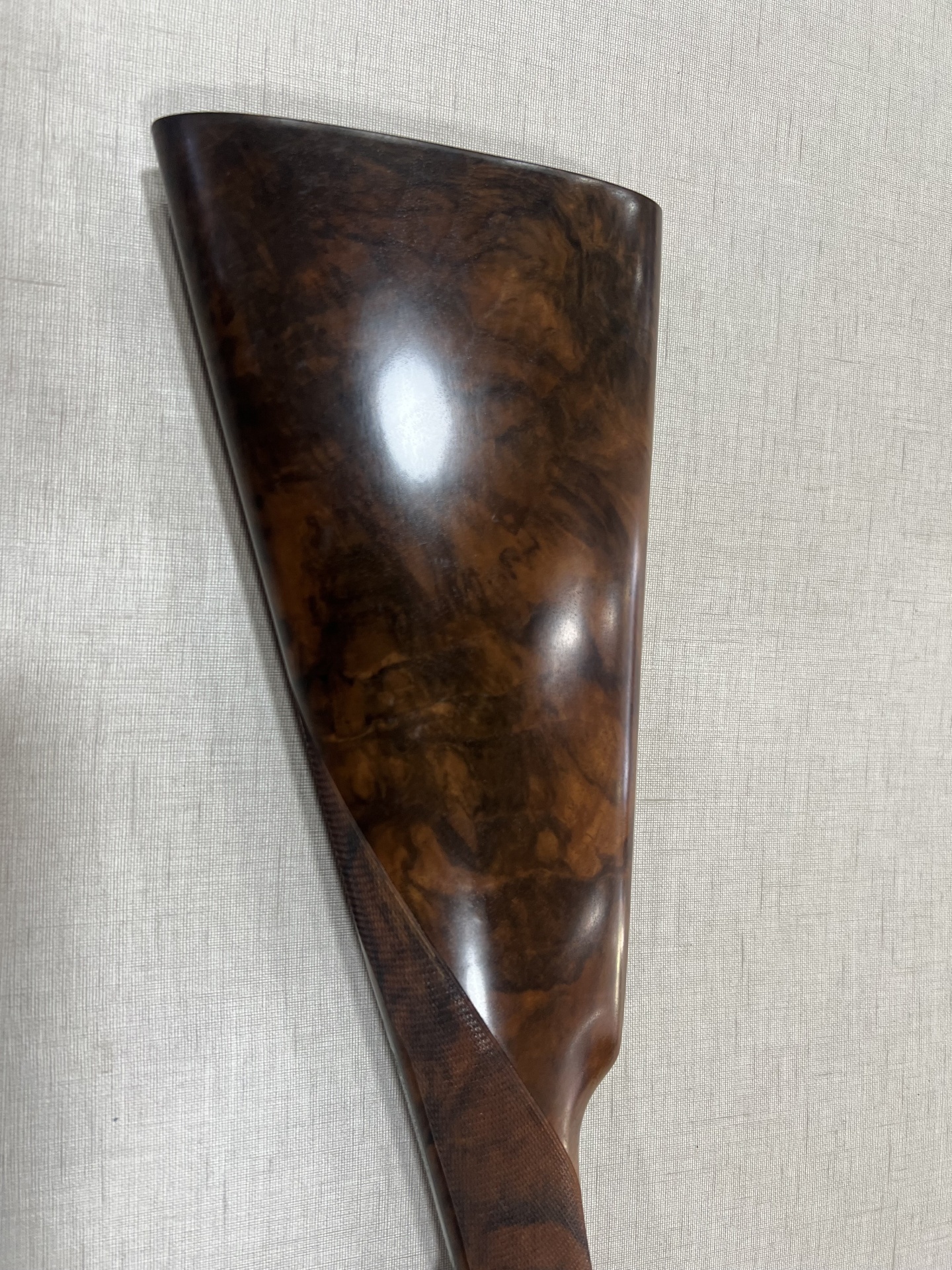 Coronha de madeira brilhante sobre tecido claro