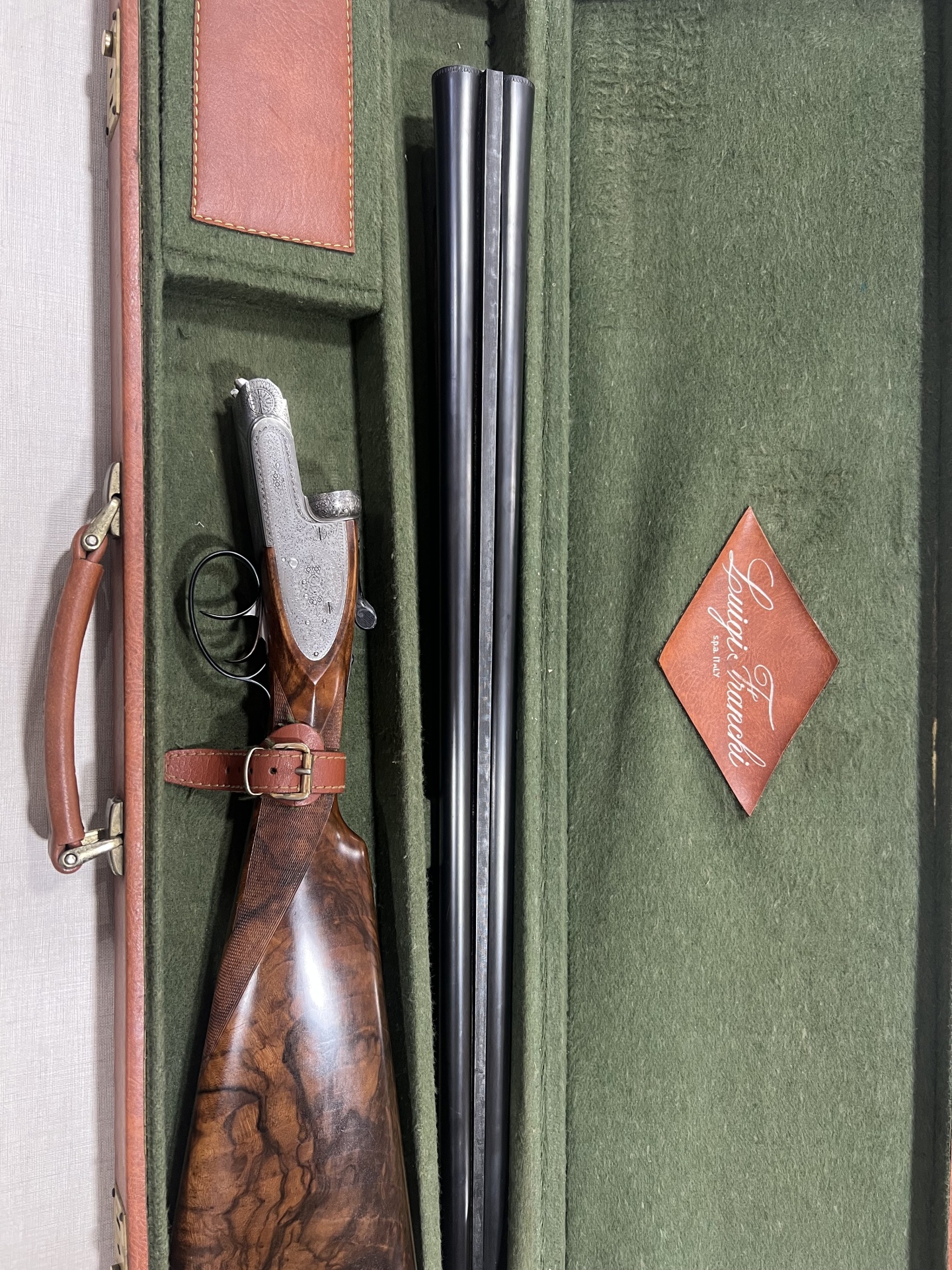 Espingarda de canos duplos com coronha em madeira dentro de estojo verde almofadado com etiqueta 'Luigi Fausti'