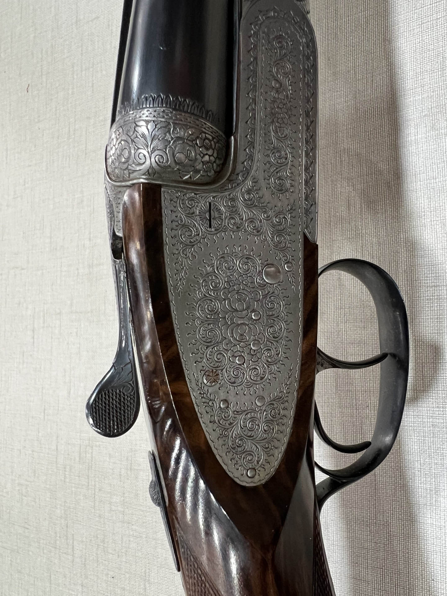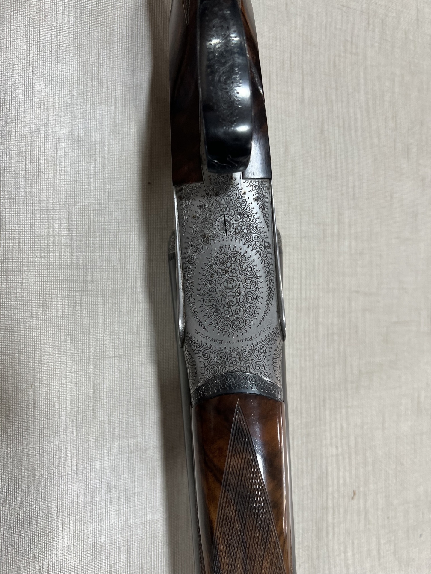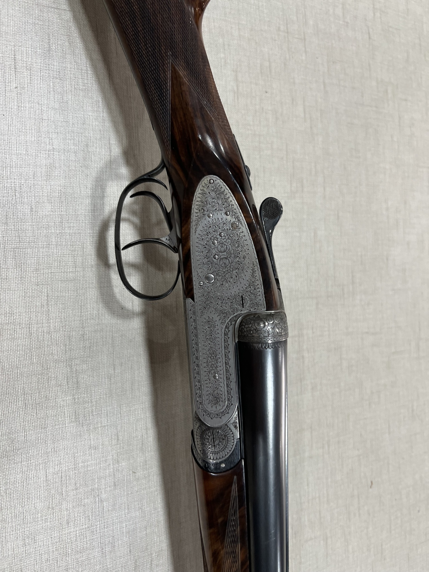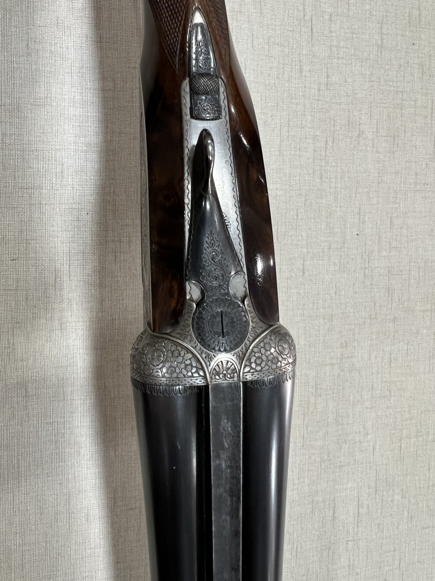 Detalhe de espingarda dupla com gravações florais e cabo em madeira castanha