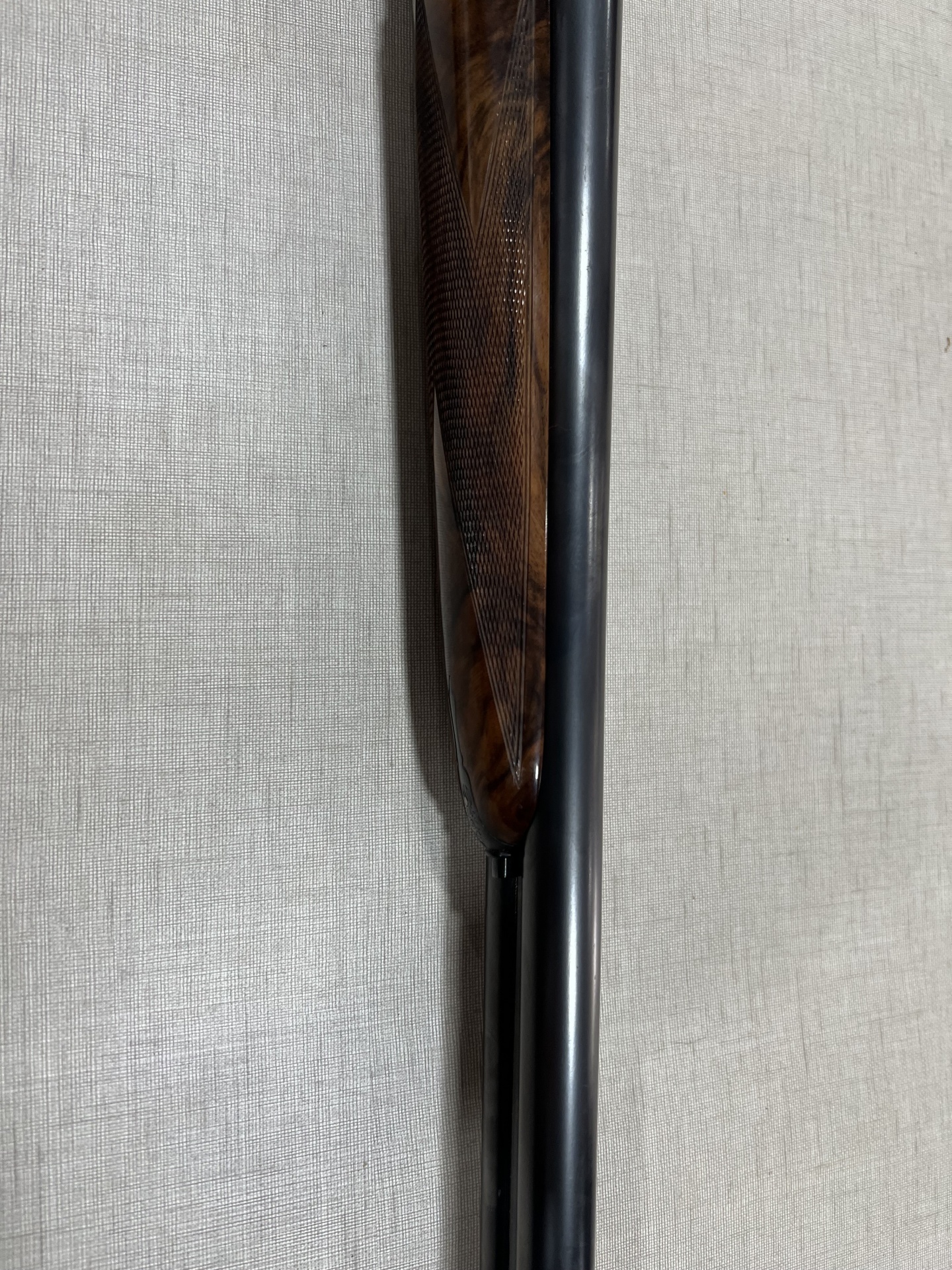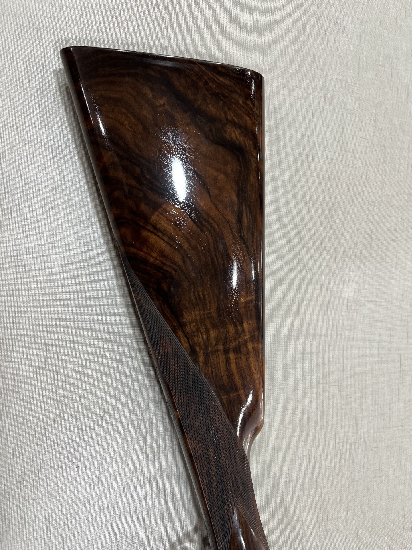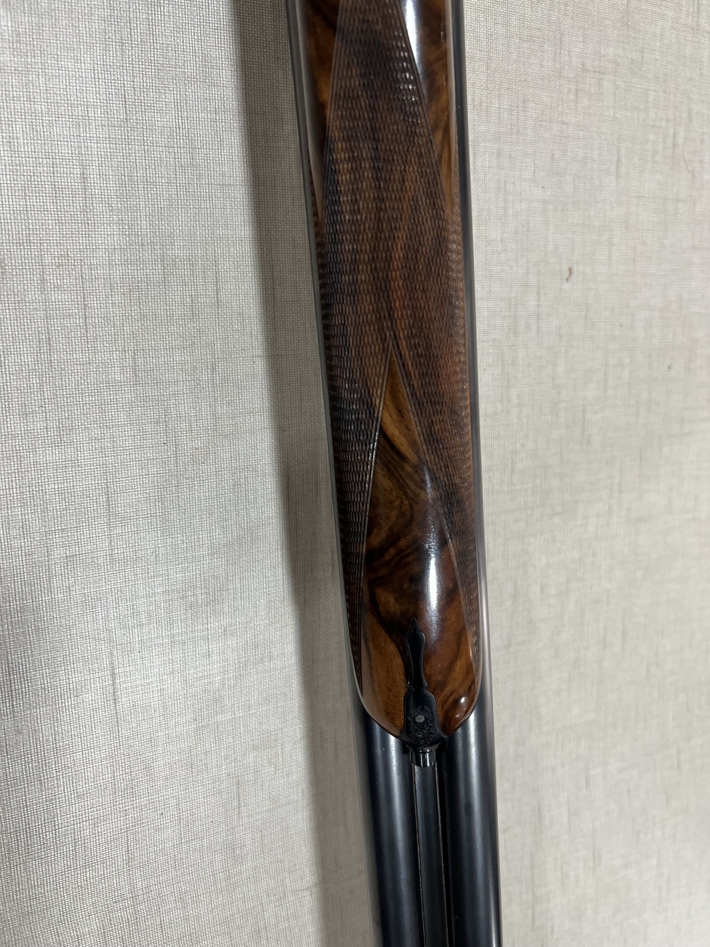 Mira de arma de fogo em madeira polida sobre tecido cinza claro