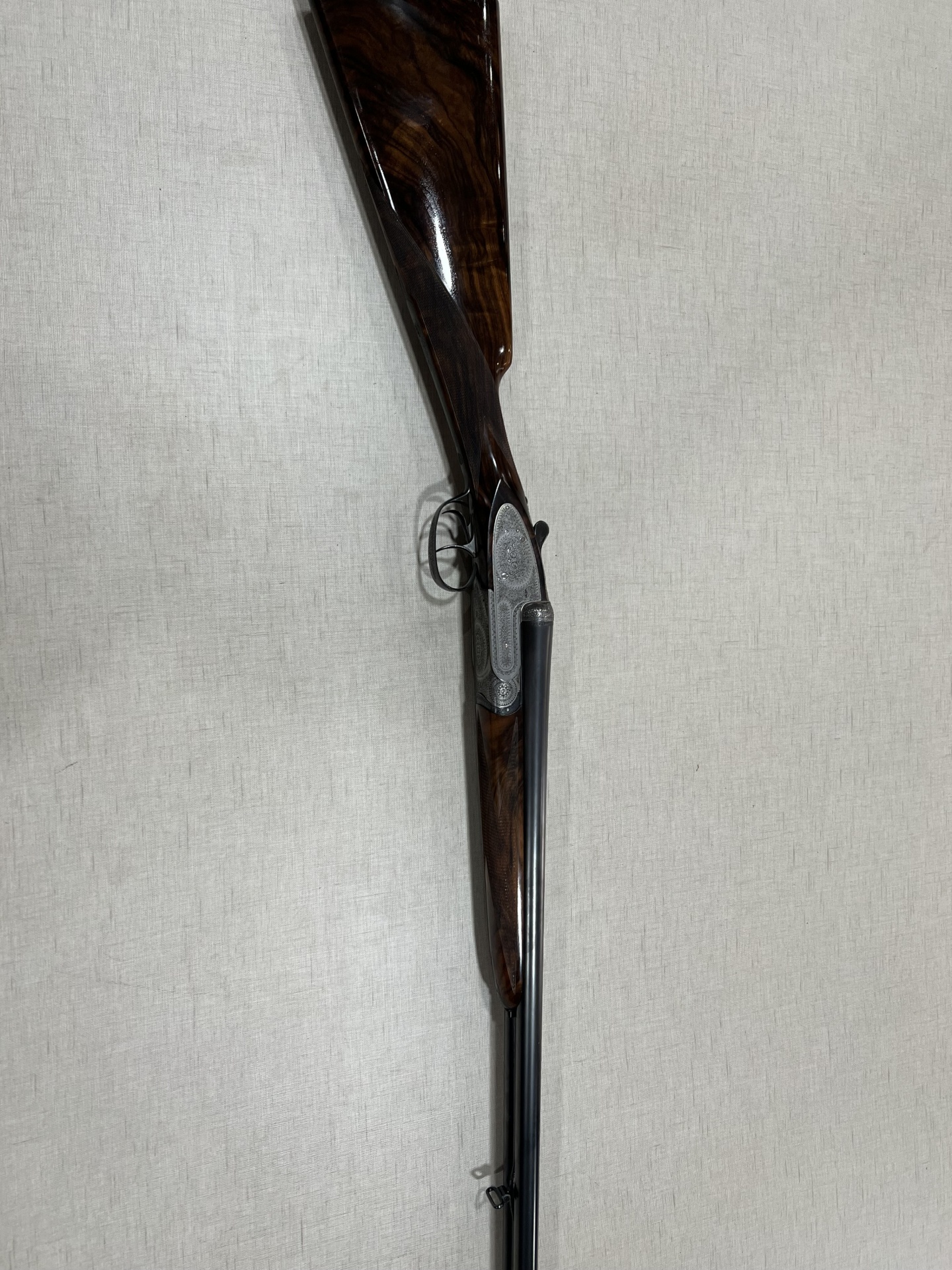 Espingarda de canos duplos com gravações ornamentais e madeira polida