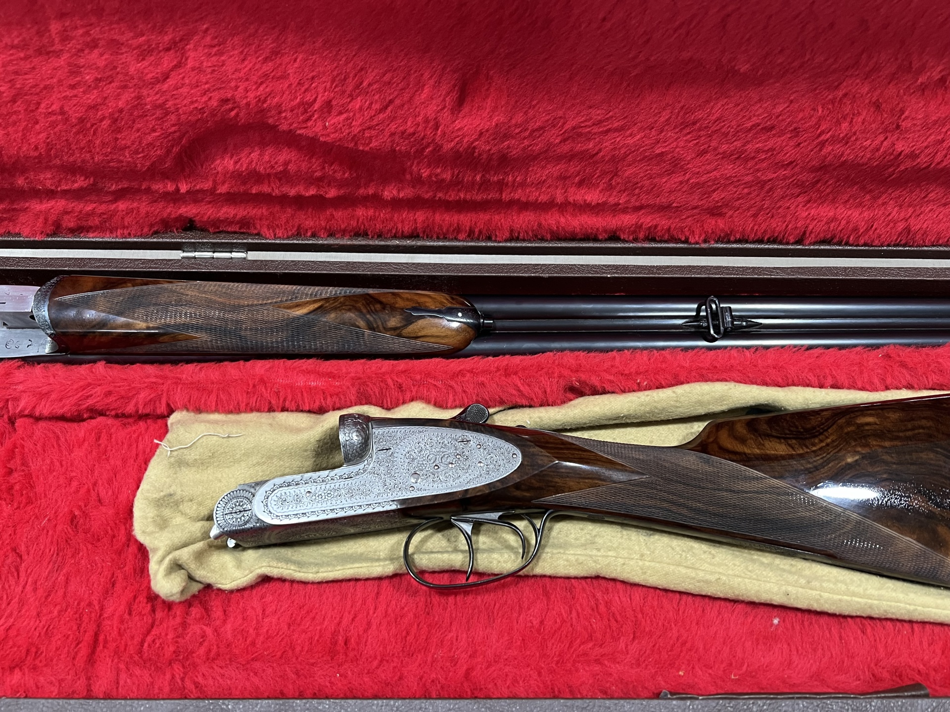 Espingarda de caça com coronha de madeira e caixa forrada a tecido vermelho