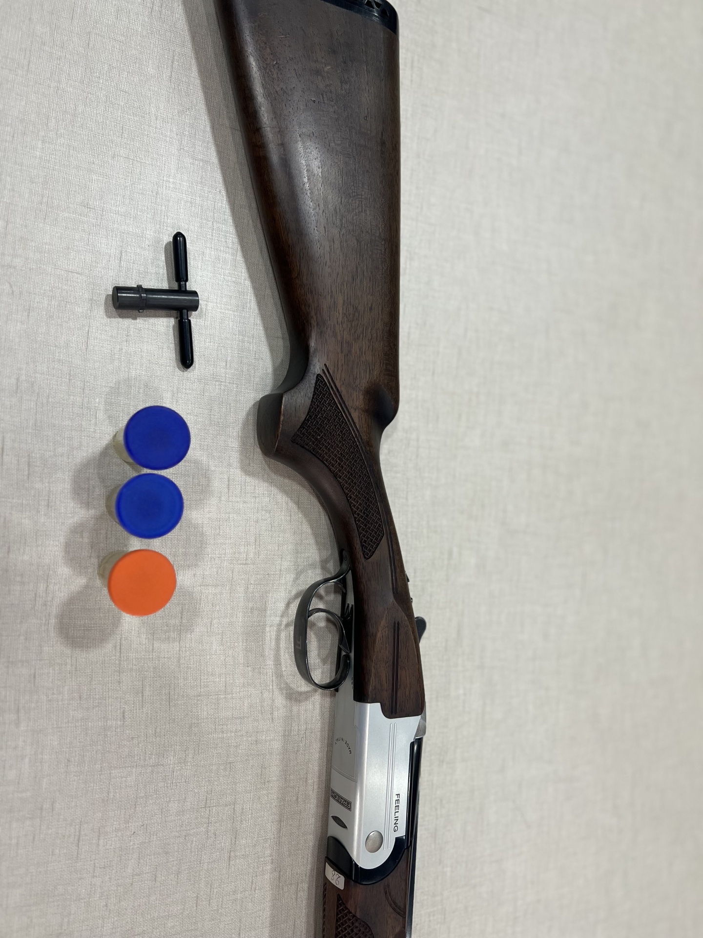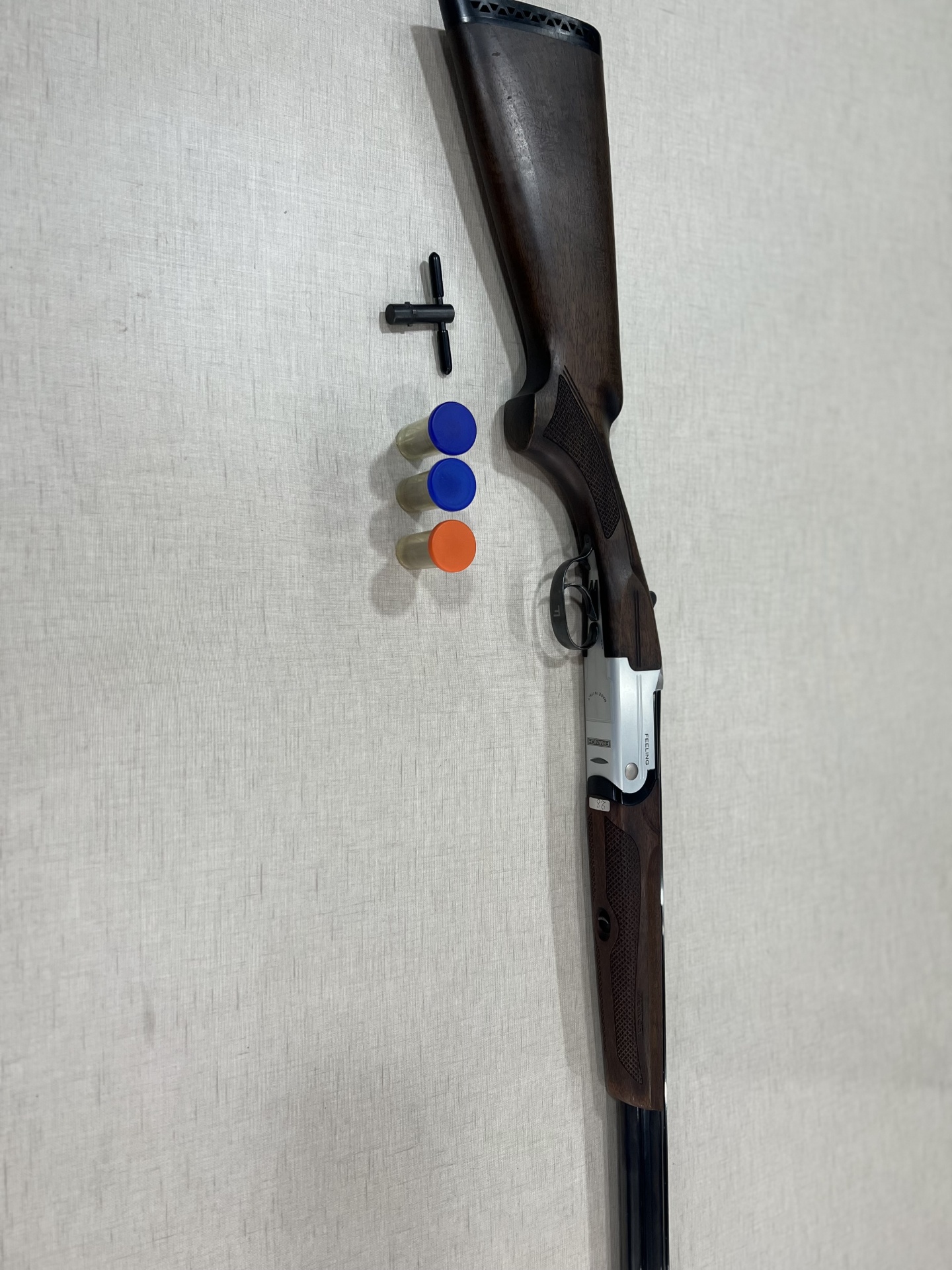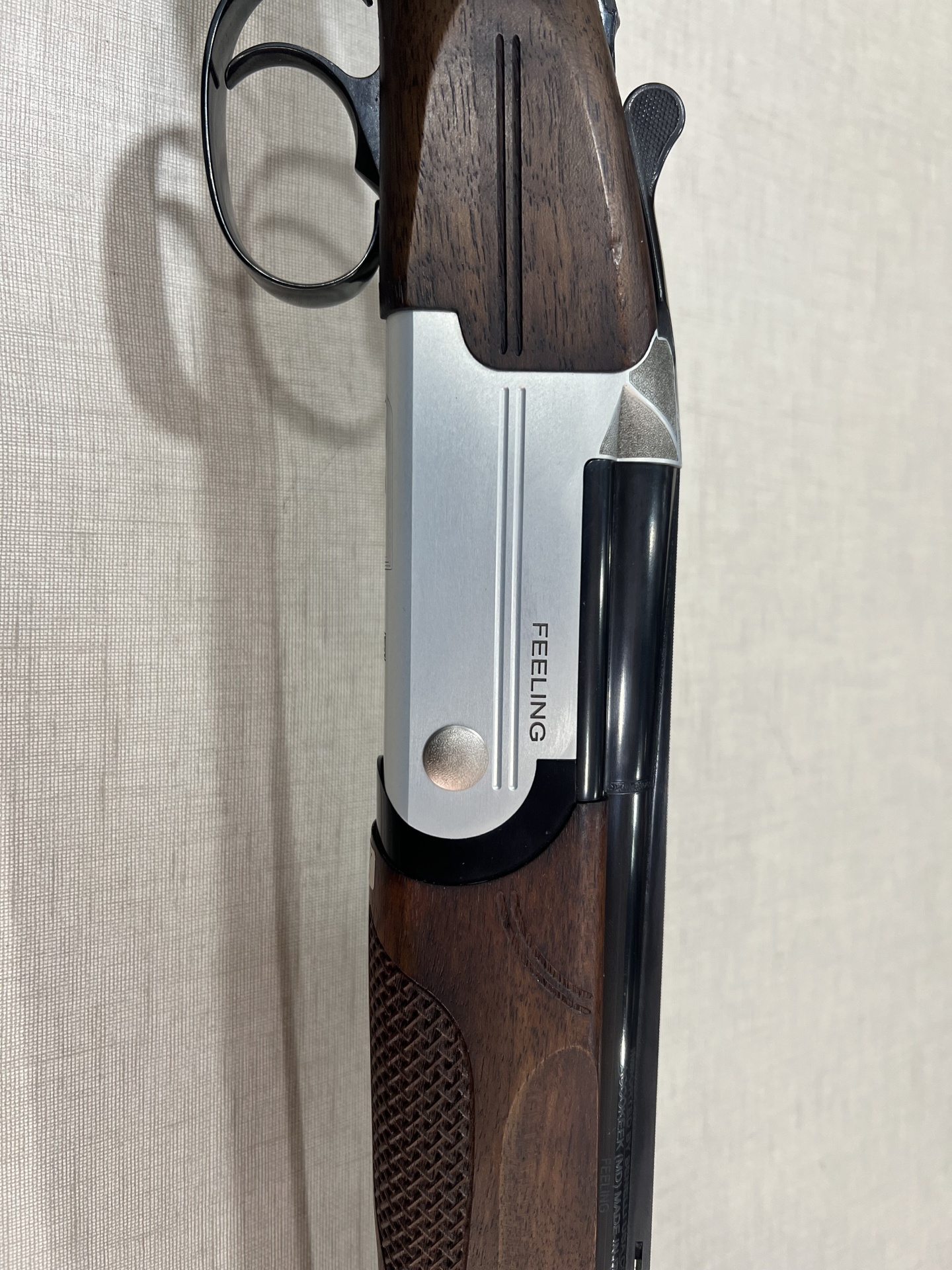 Espingarda com madeira escura e metal prateado com a palavra FEELING