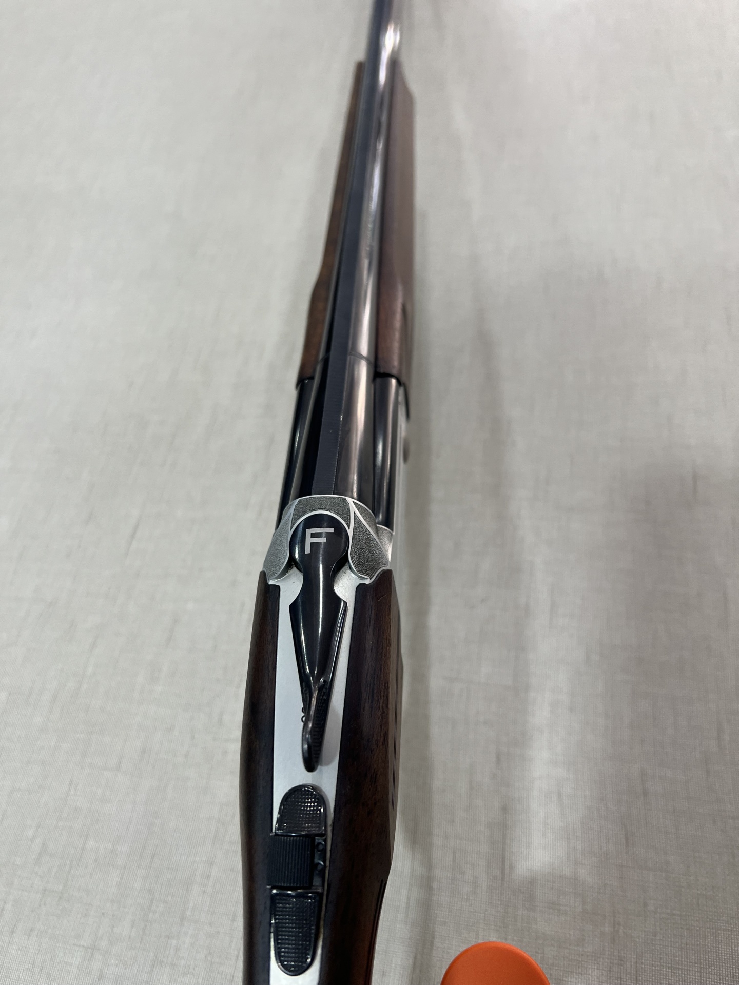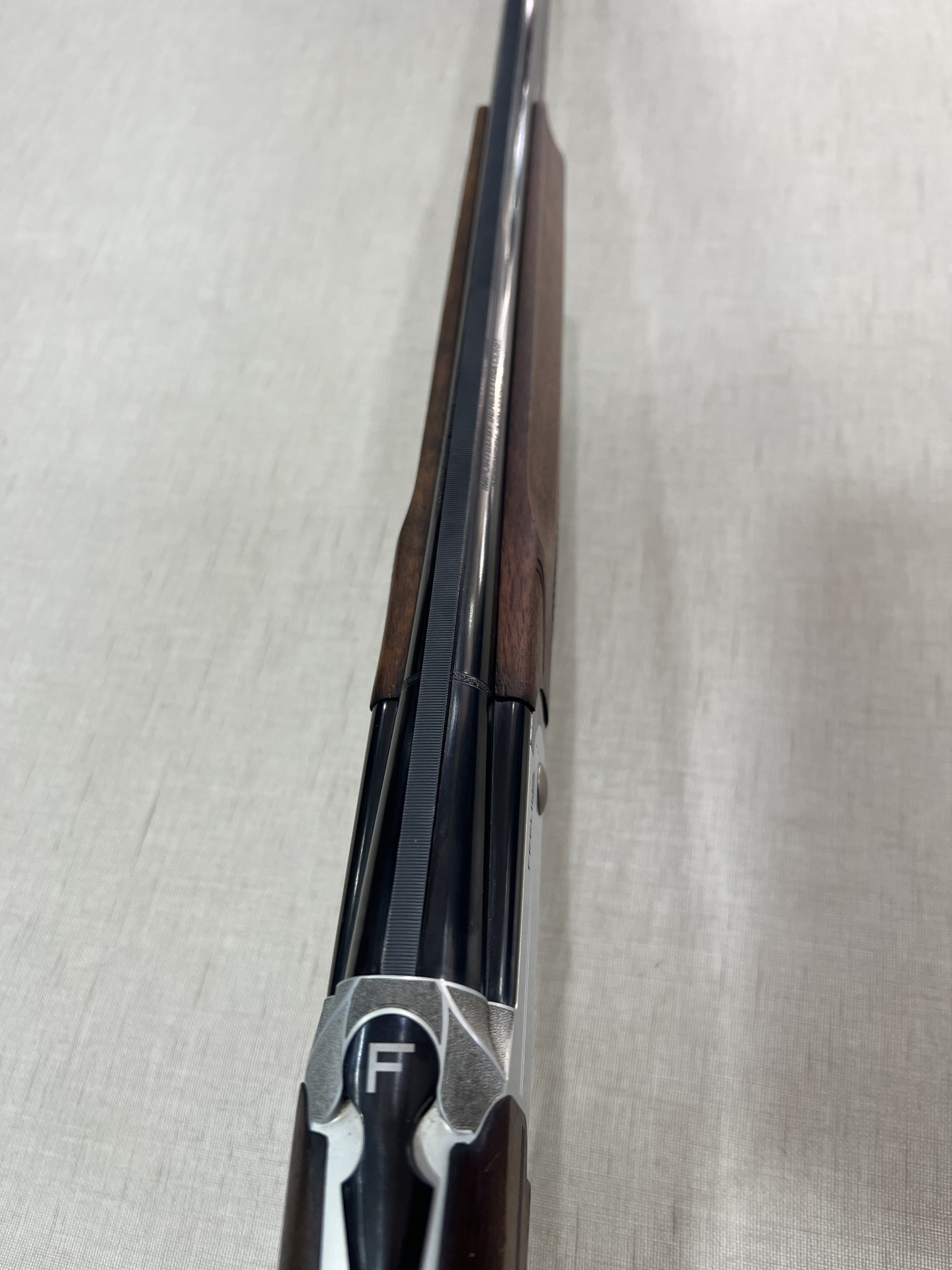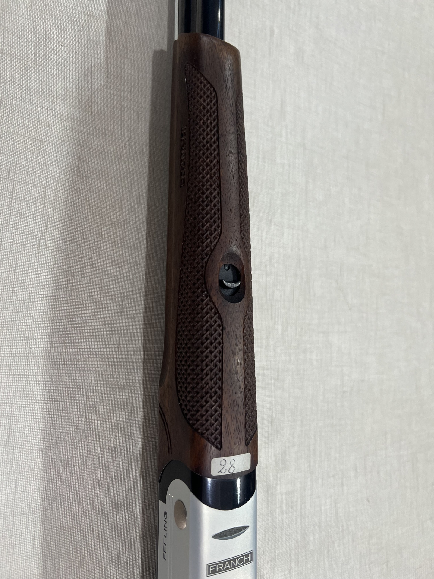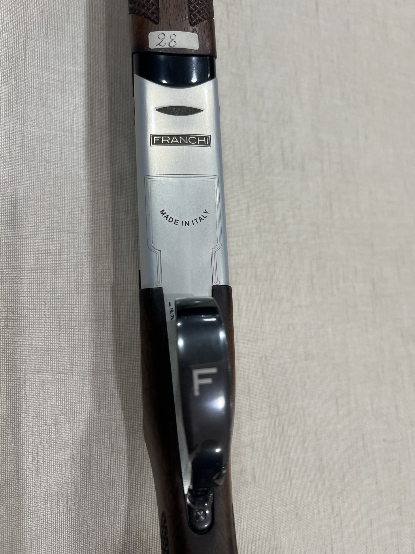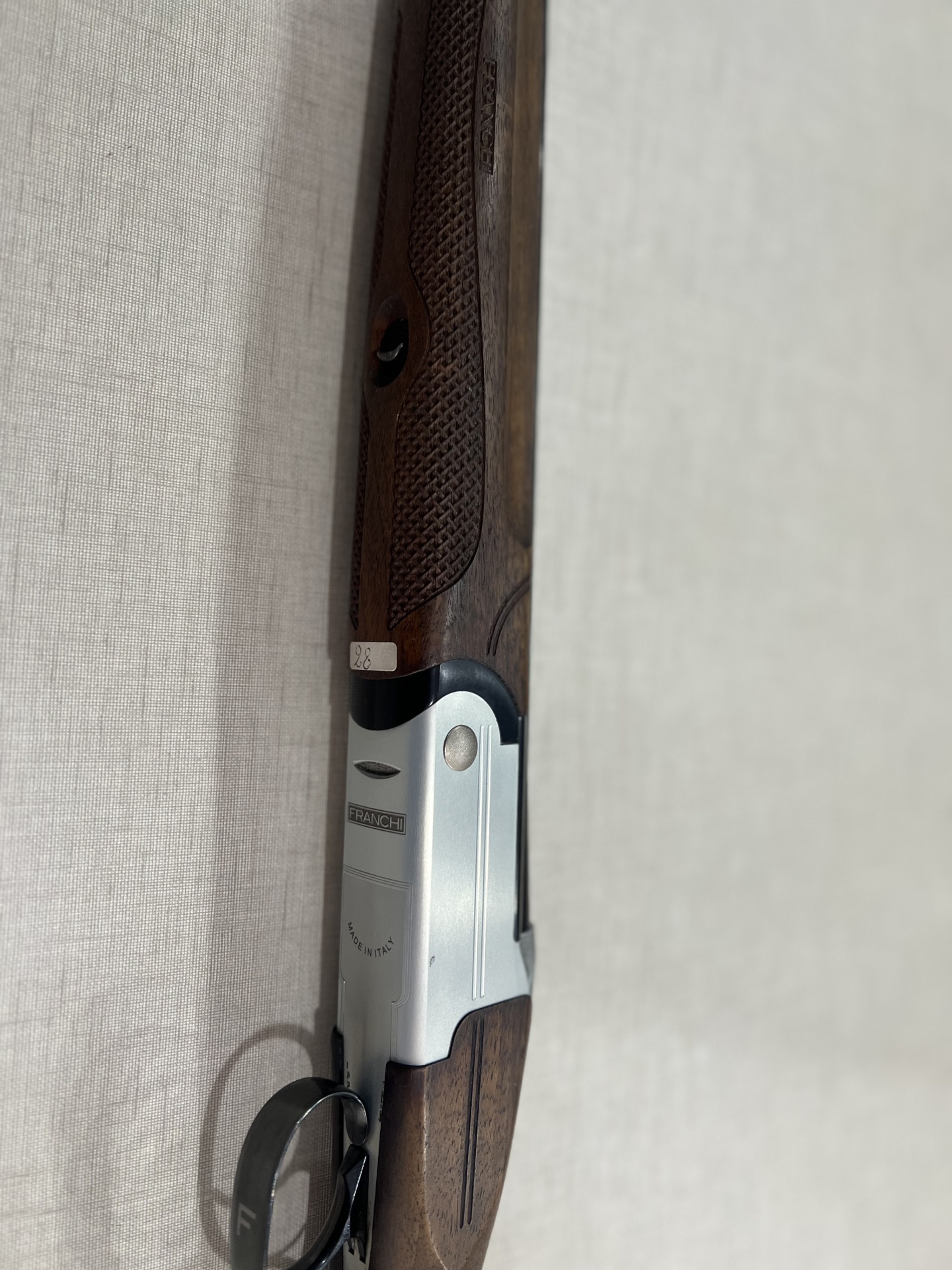 Detalhe do corpo de uma espingarda em madeira e metal com inscrições FRANCHI e MADE IN ITALY.