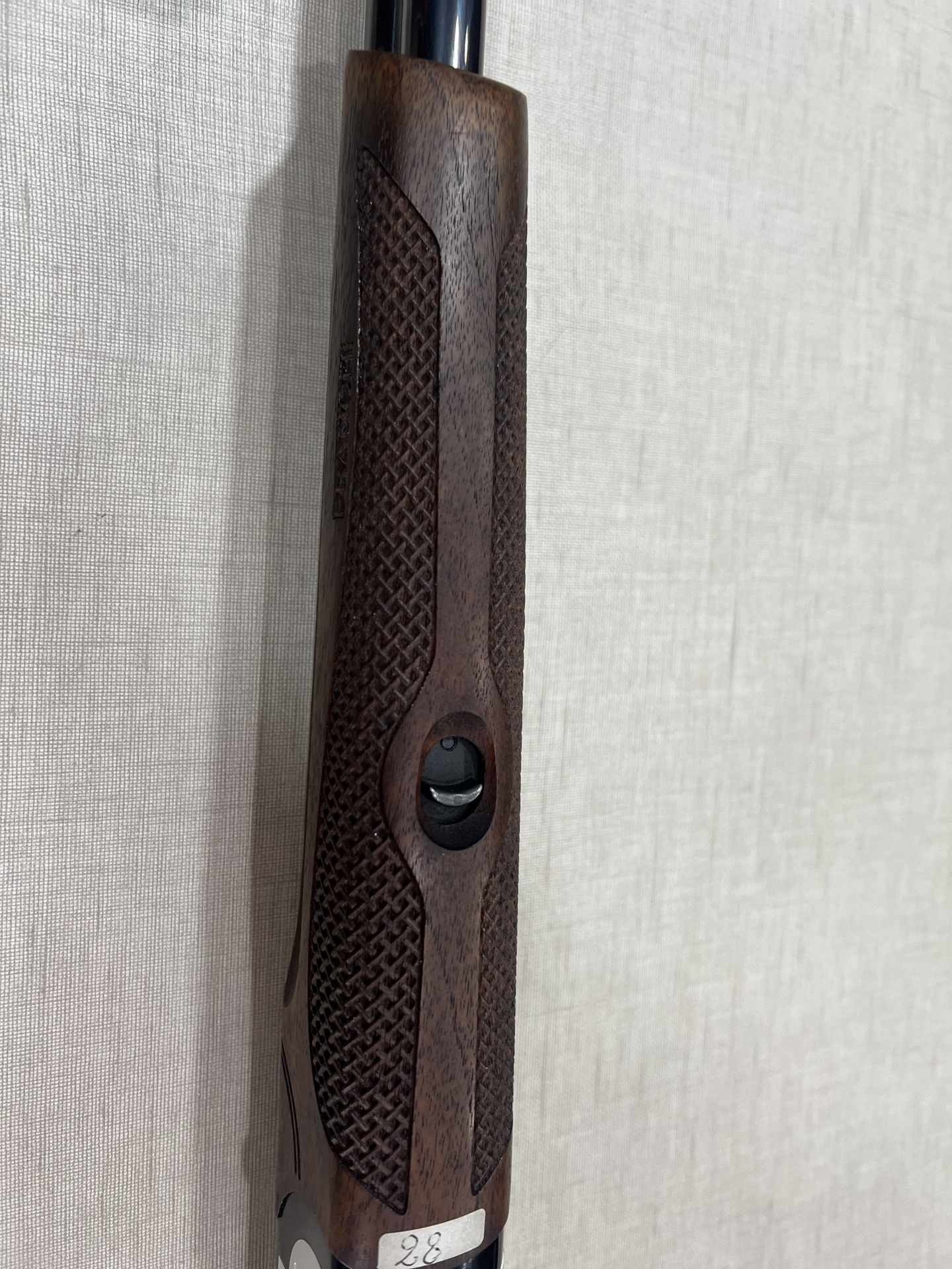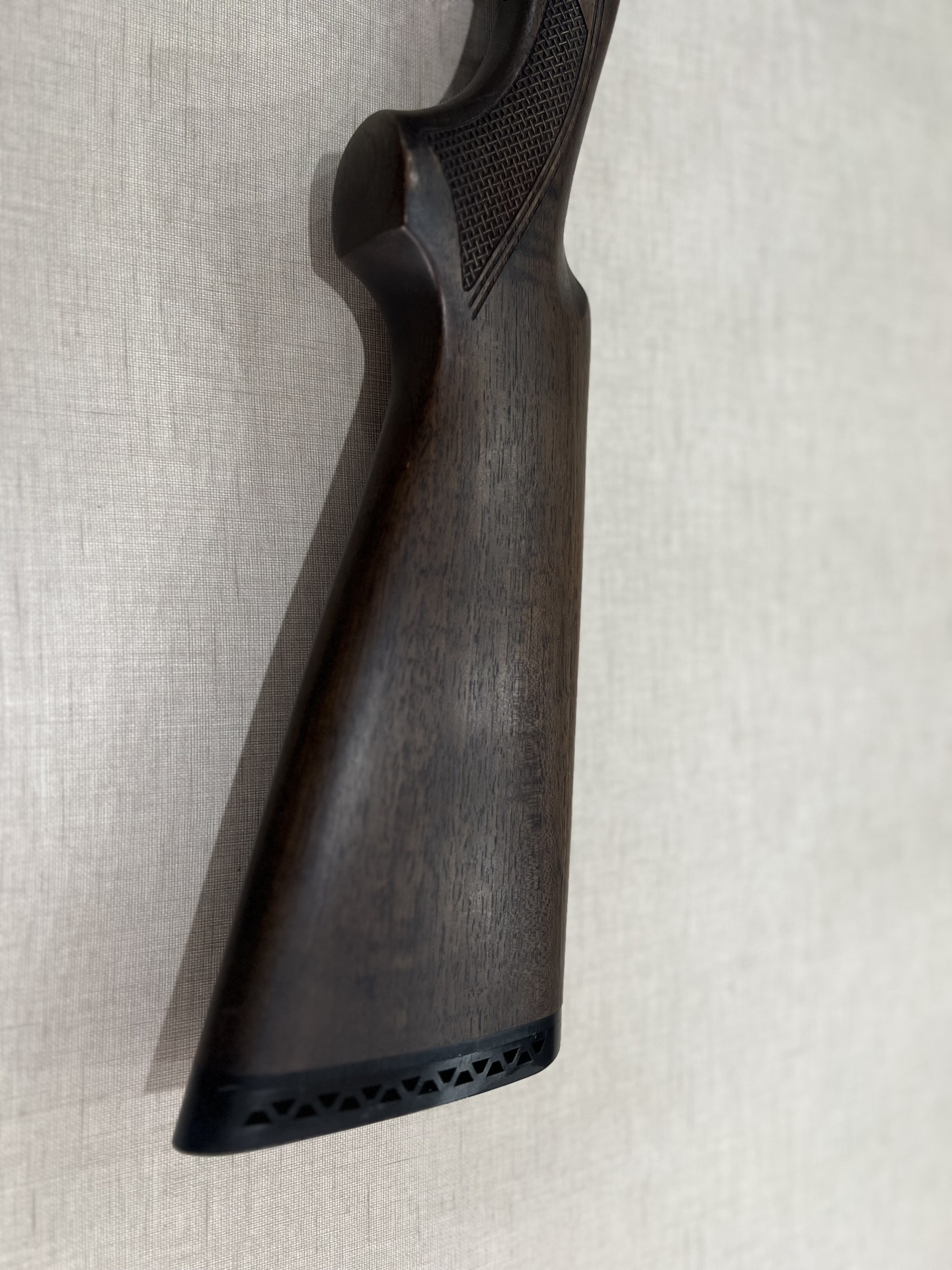 Coronha de arma de fogo em madeira escura com padrão quadriculado para aderência e calcanhar preto ventilado