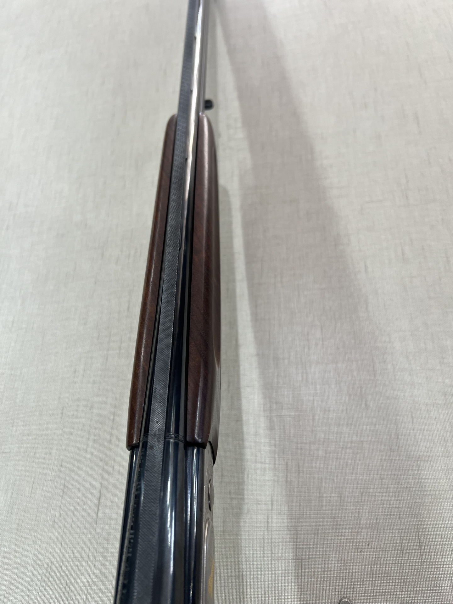 Espingarda vista de cima com madeira polida e metal escuro