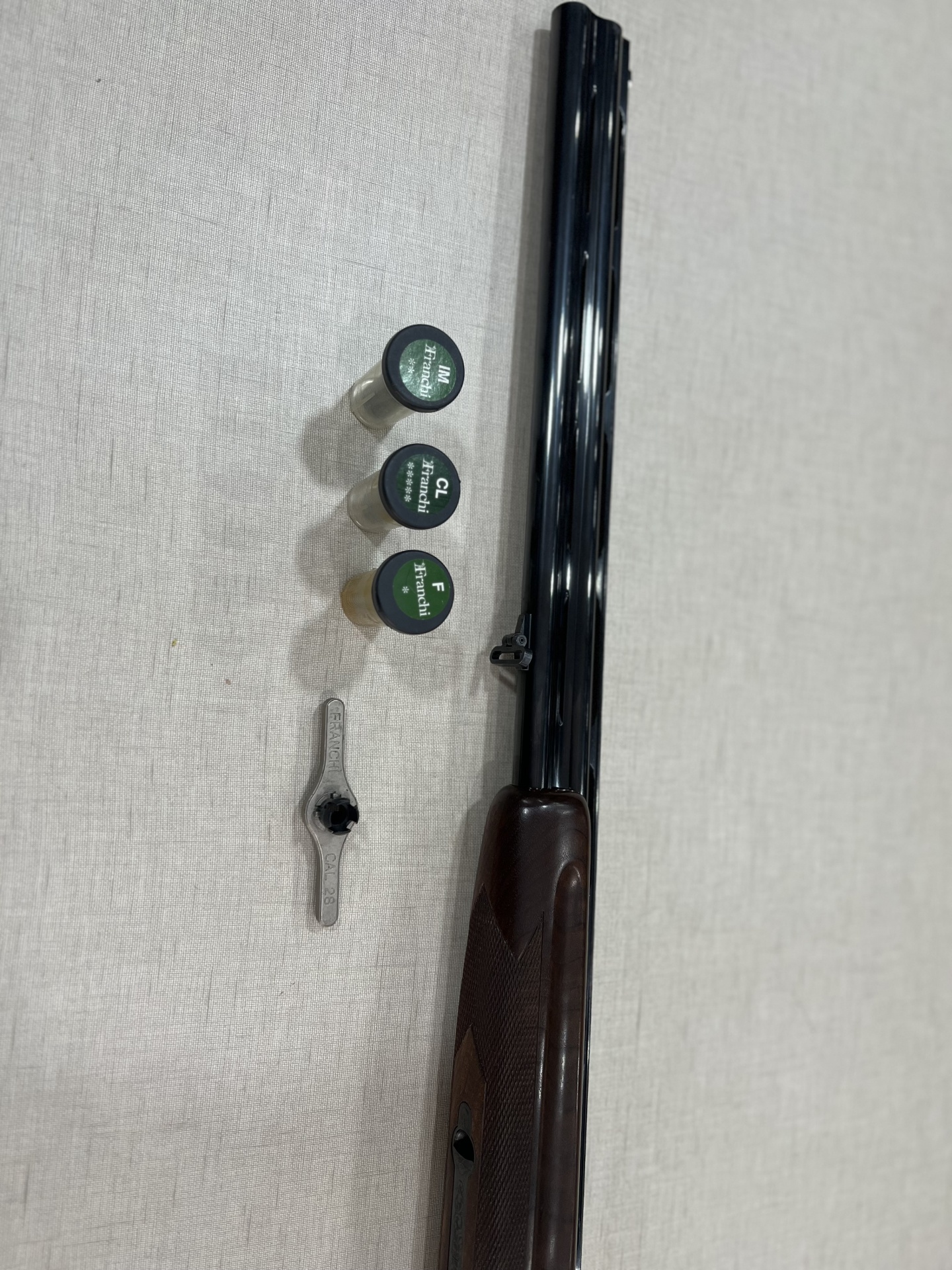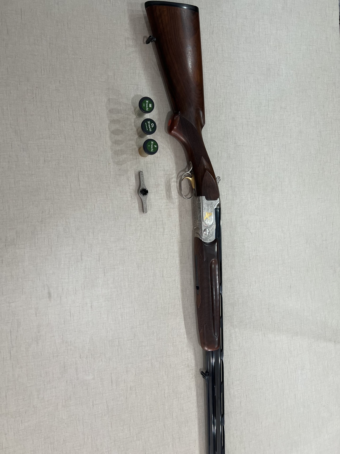 Espingarda de canos duplos com três cartuchos rotulados e uma ferramenta metálica sobre fundo claro