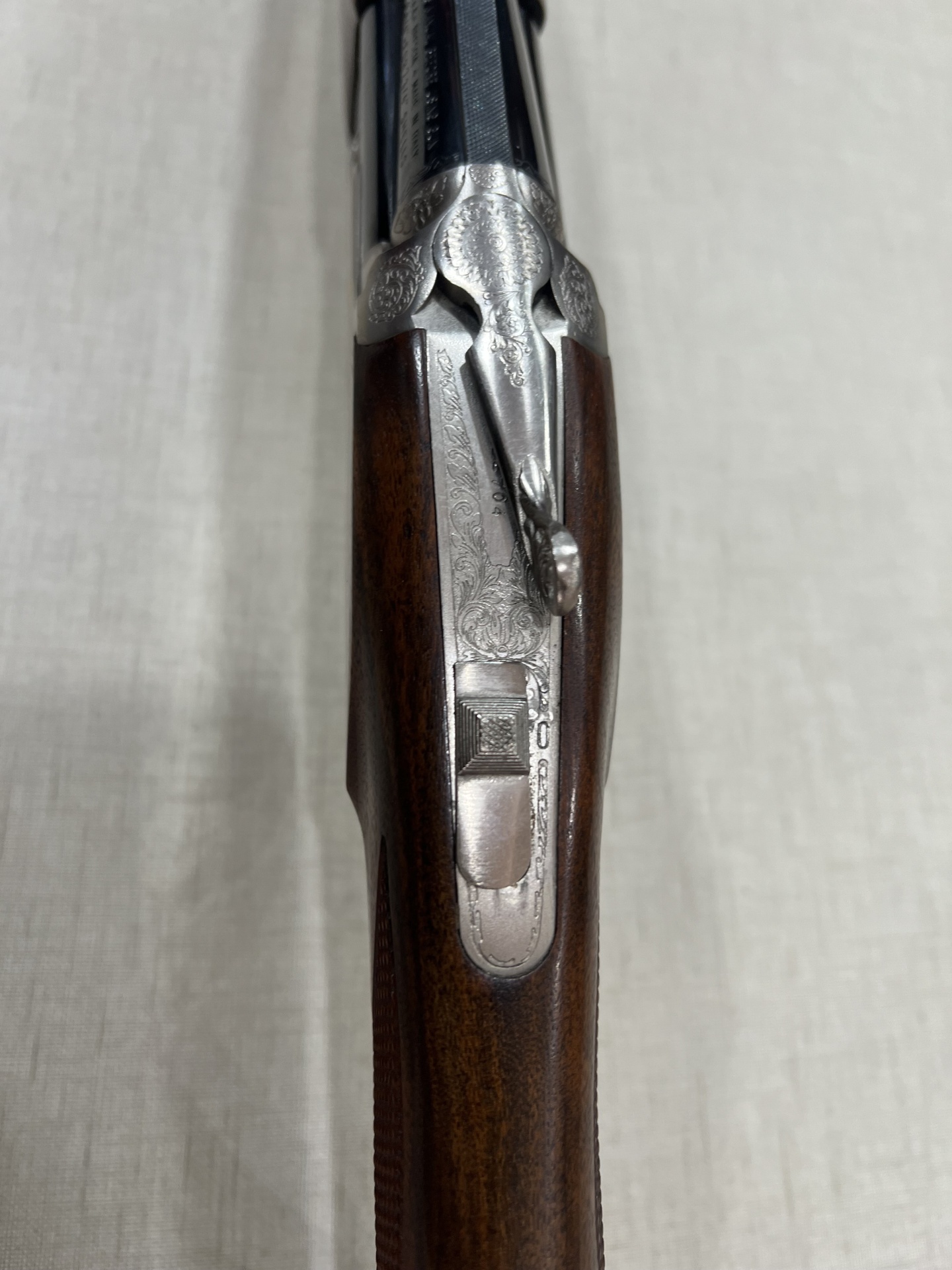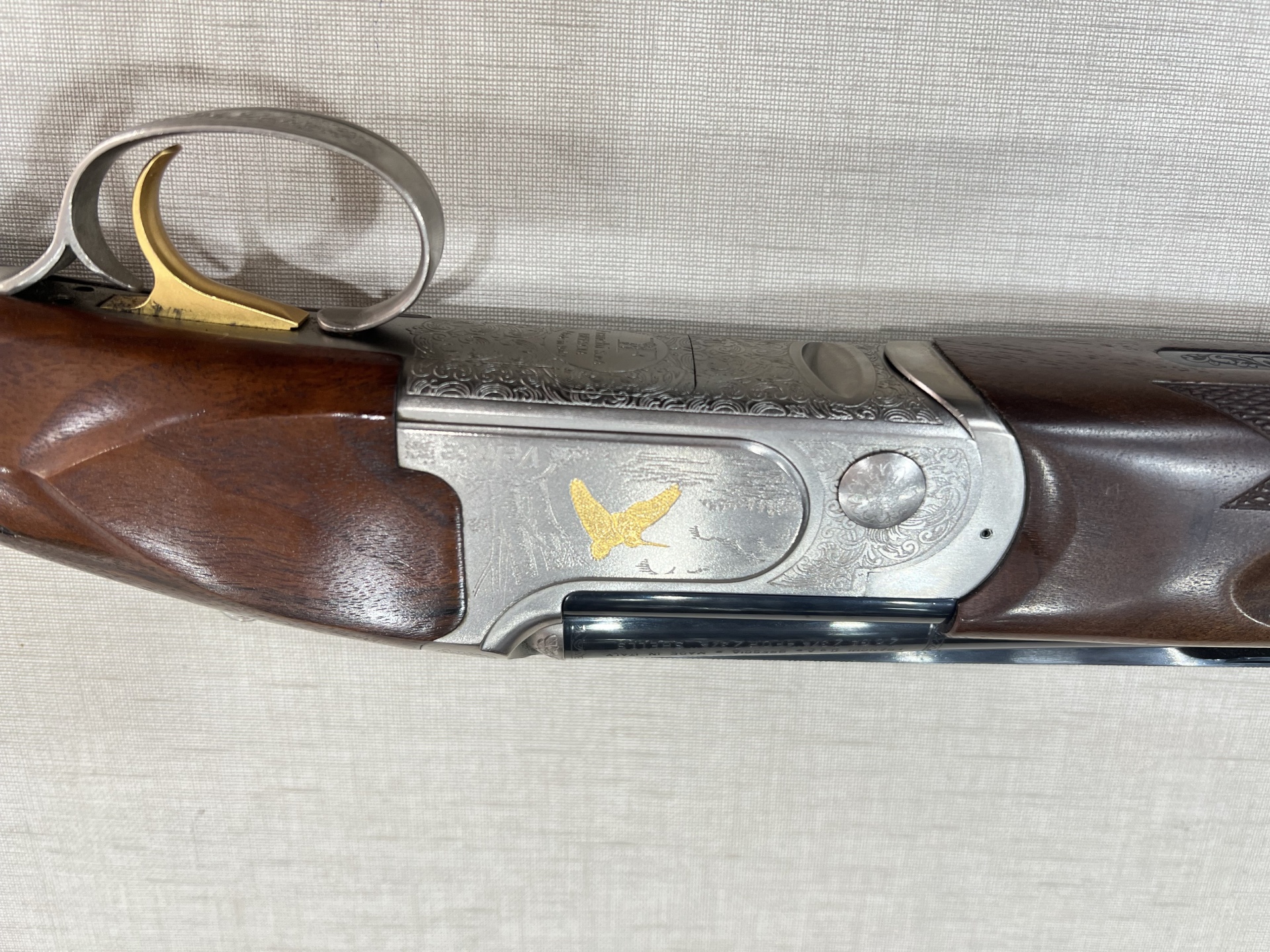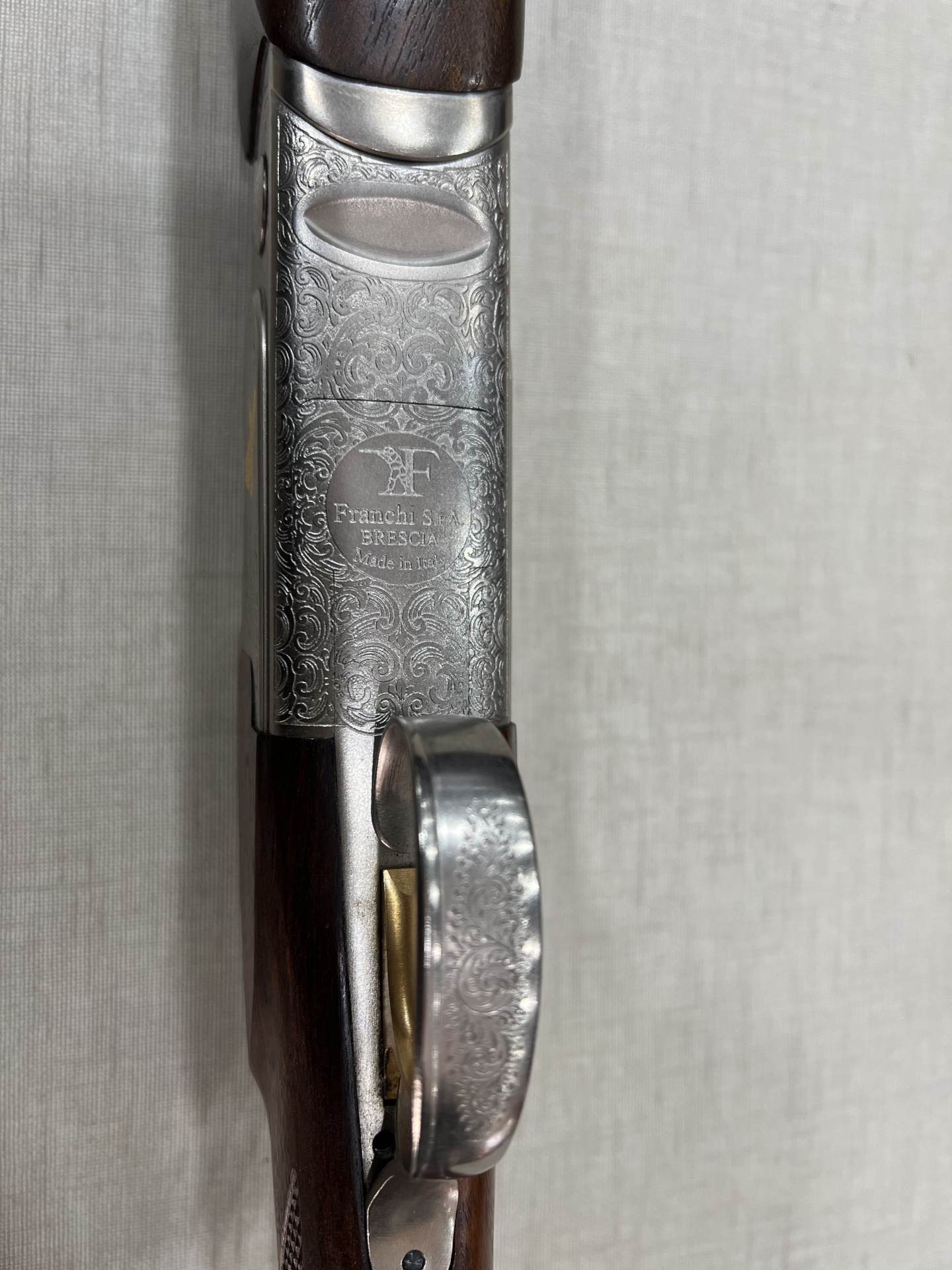 Espingarda com caixa metálica gravada e cabo de madeira sobre fundo cinza claro