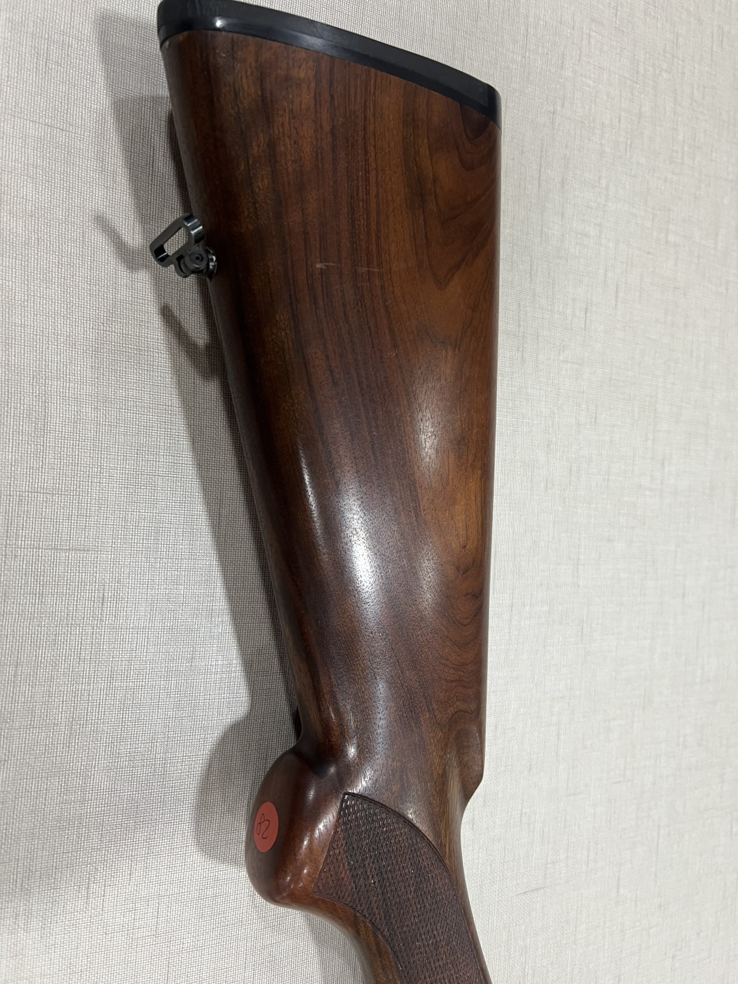 Coronha de arma de fogo em madeira castanha escura com textura e botão vermelho