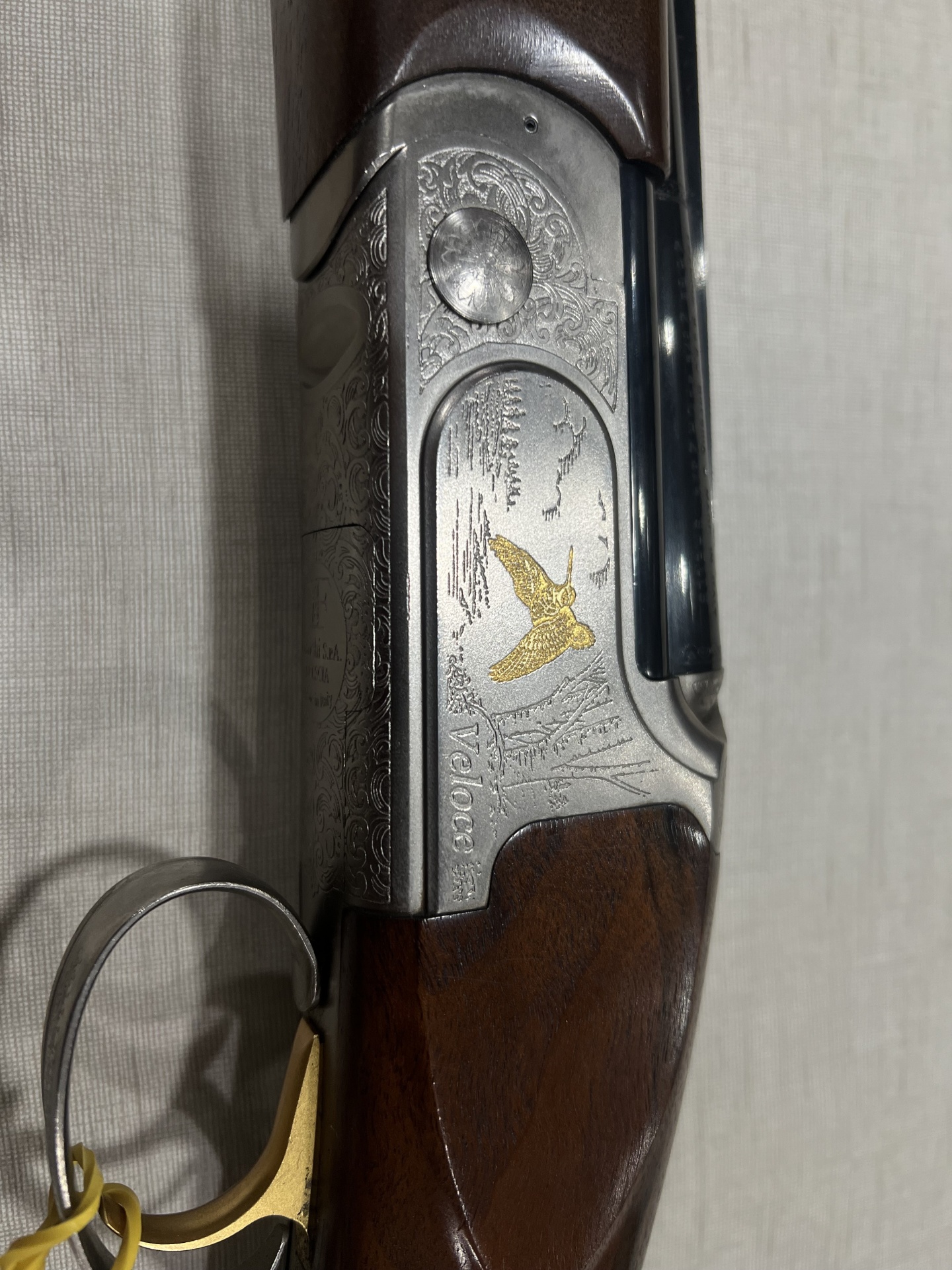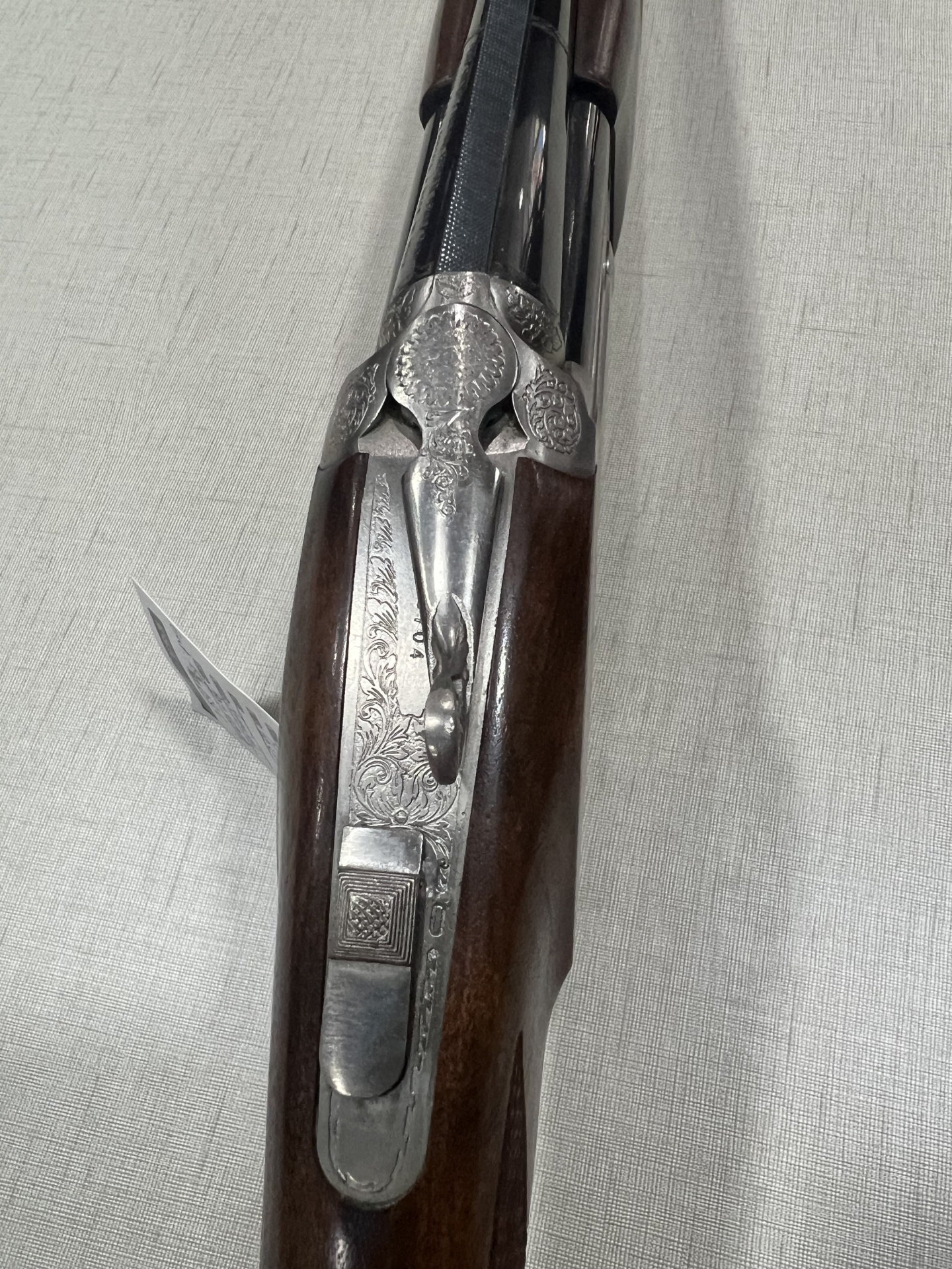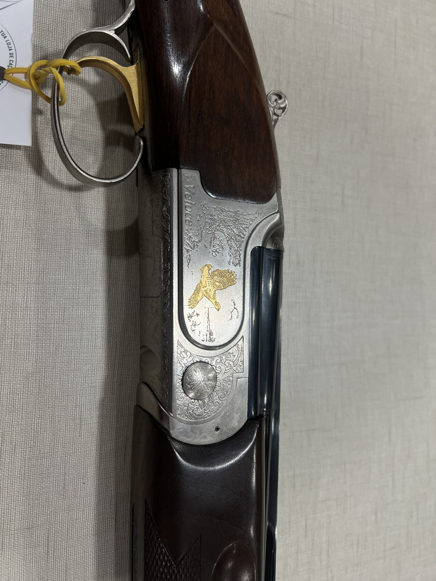 Arma de fogo com madeira escura e metal gravado sobre tecido cinzento claro