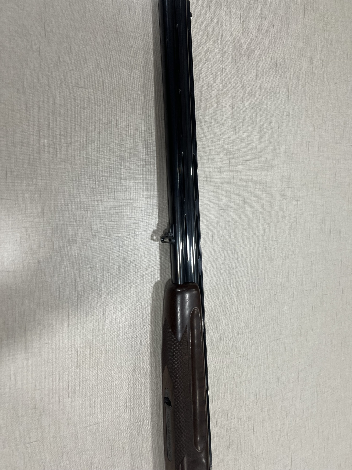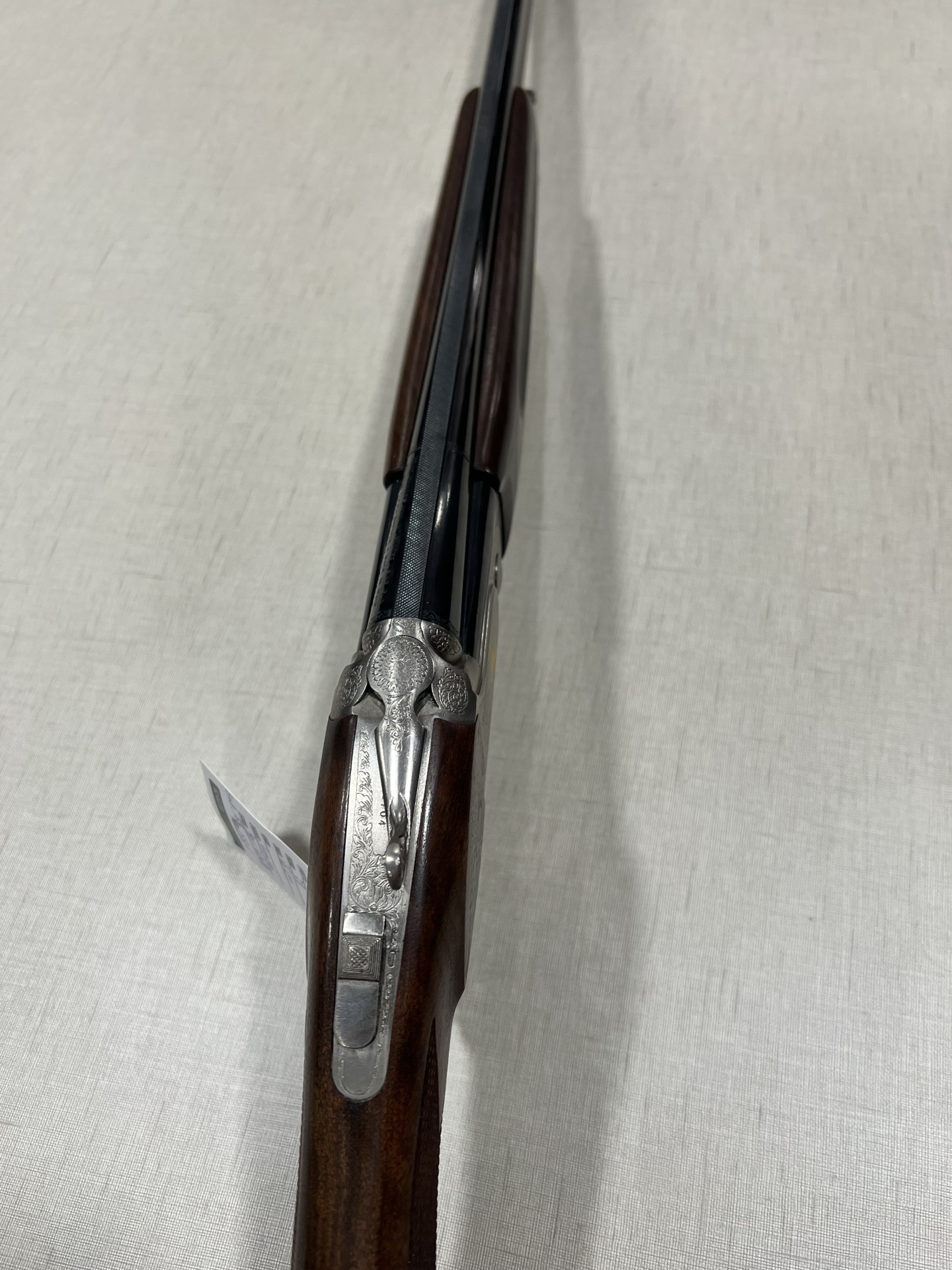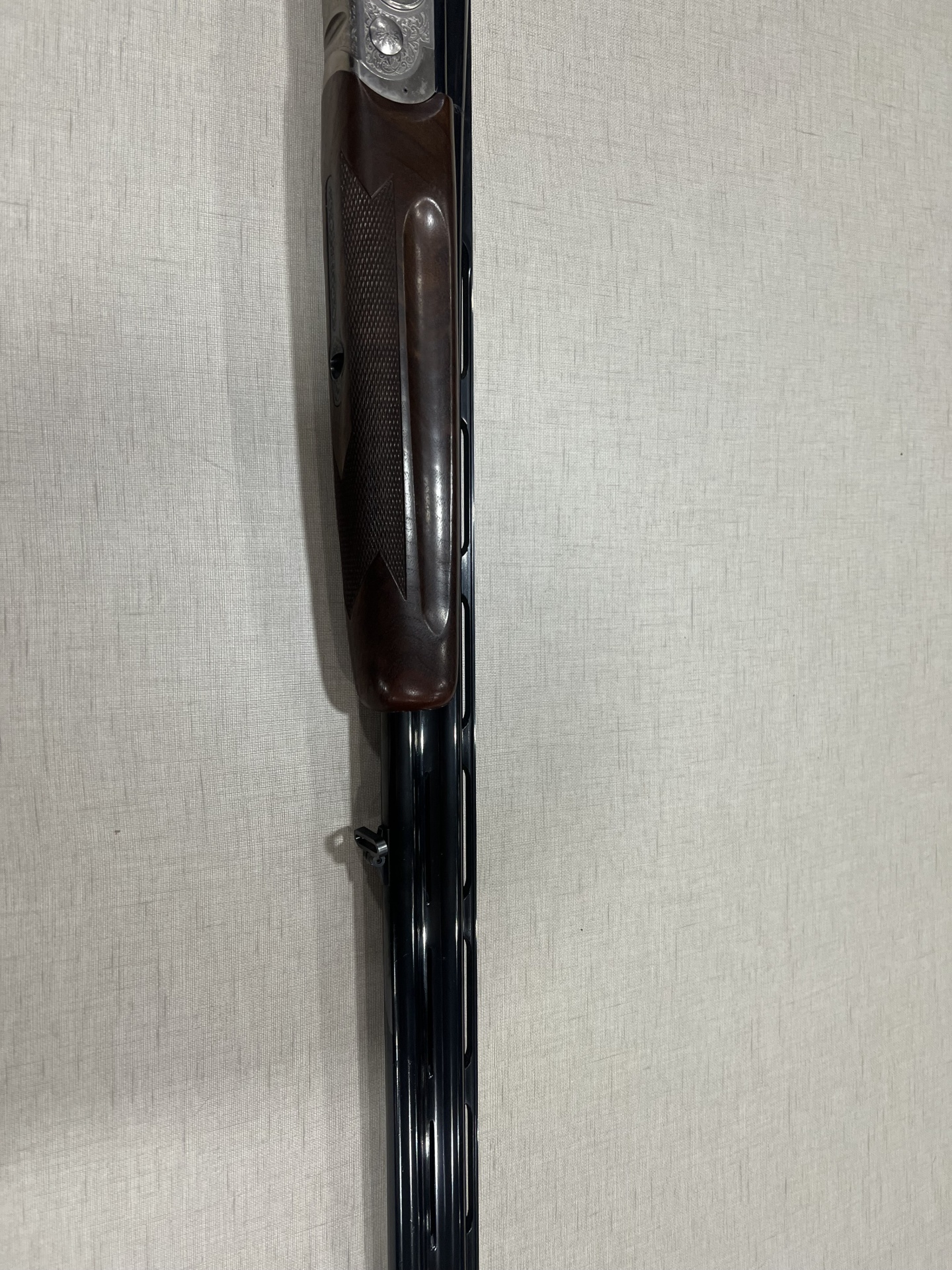 Arma de fogo com madeira escura e metal gravado sobre tecido cinzento claro