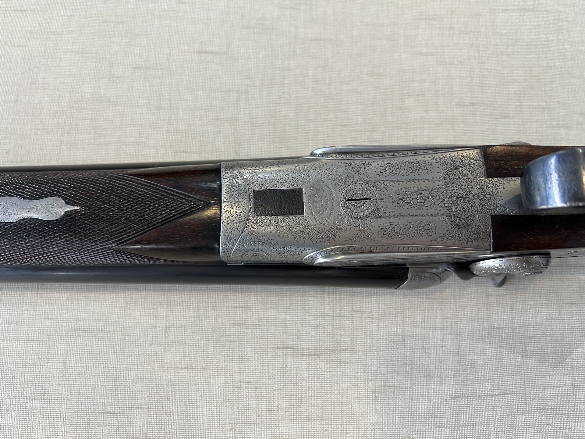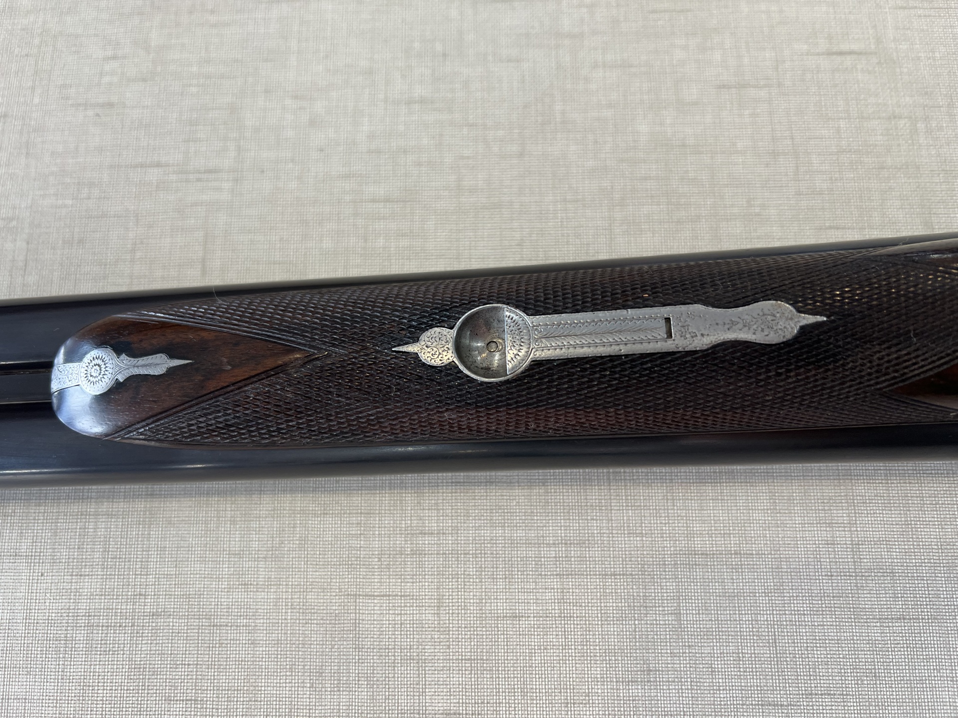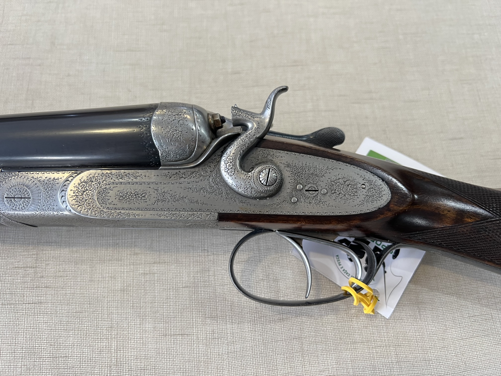 Espingarda de cano duplo com acabamento metálico gravado e empunhadura em madeira escura polida