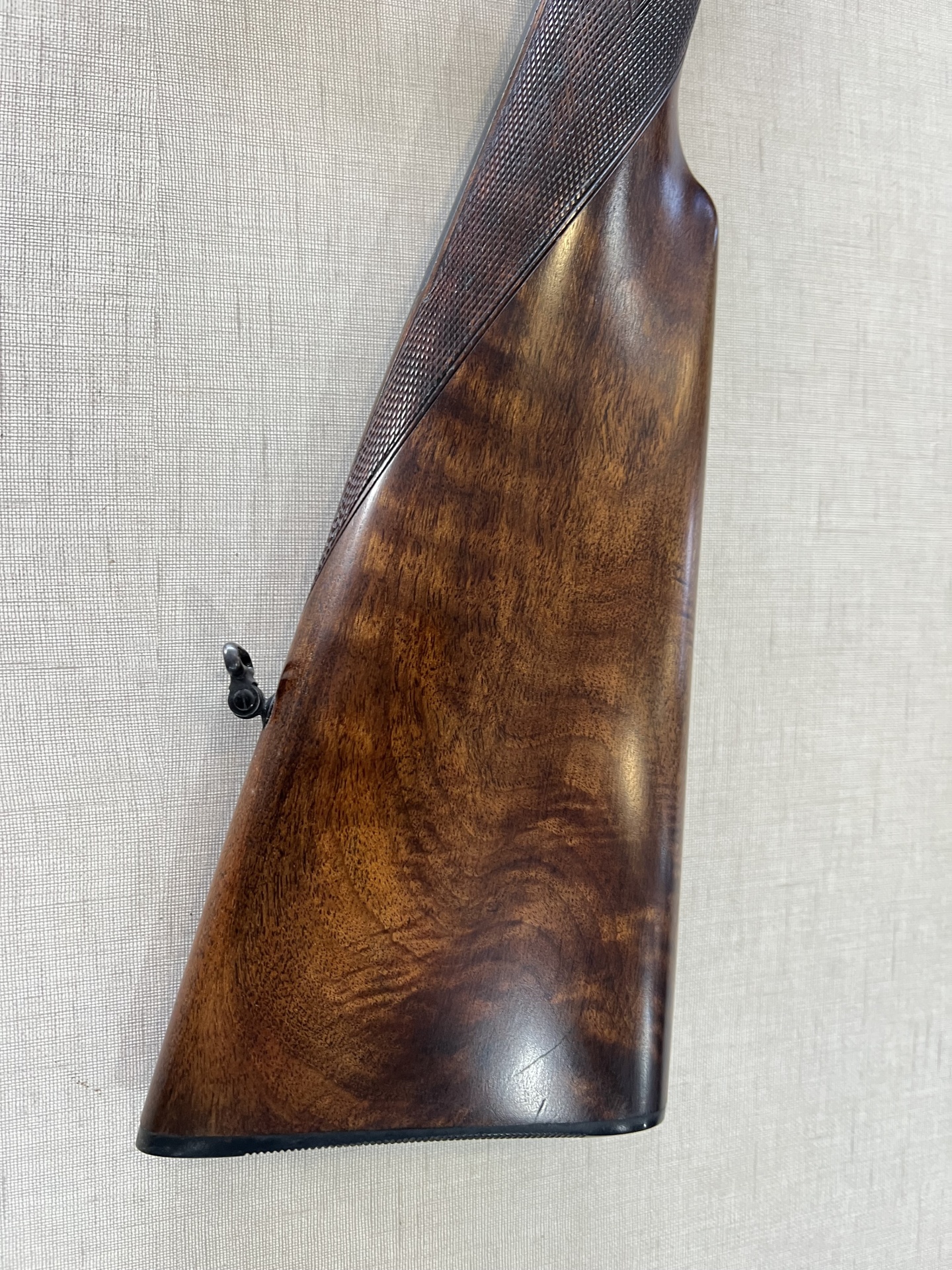 Parte superior de espingarda com madeira escura e metal gravado em fundo bege