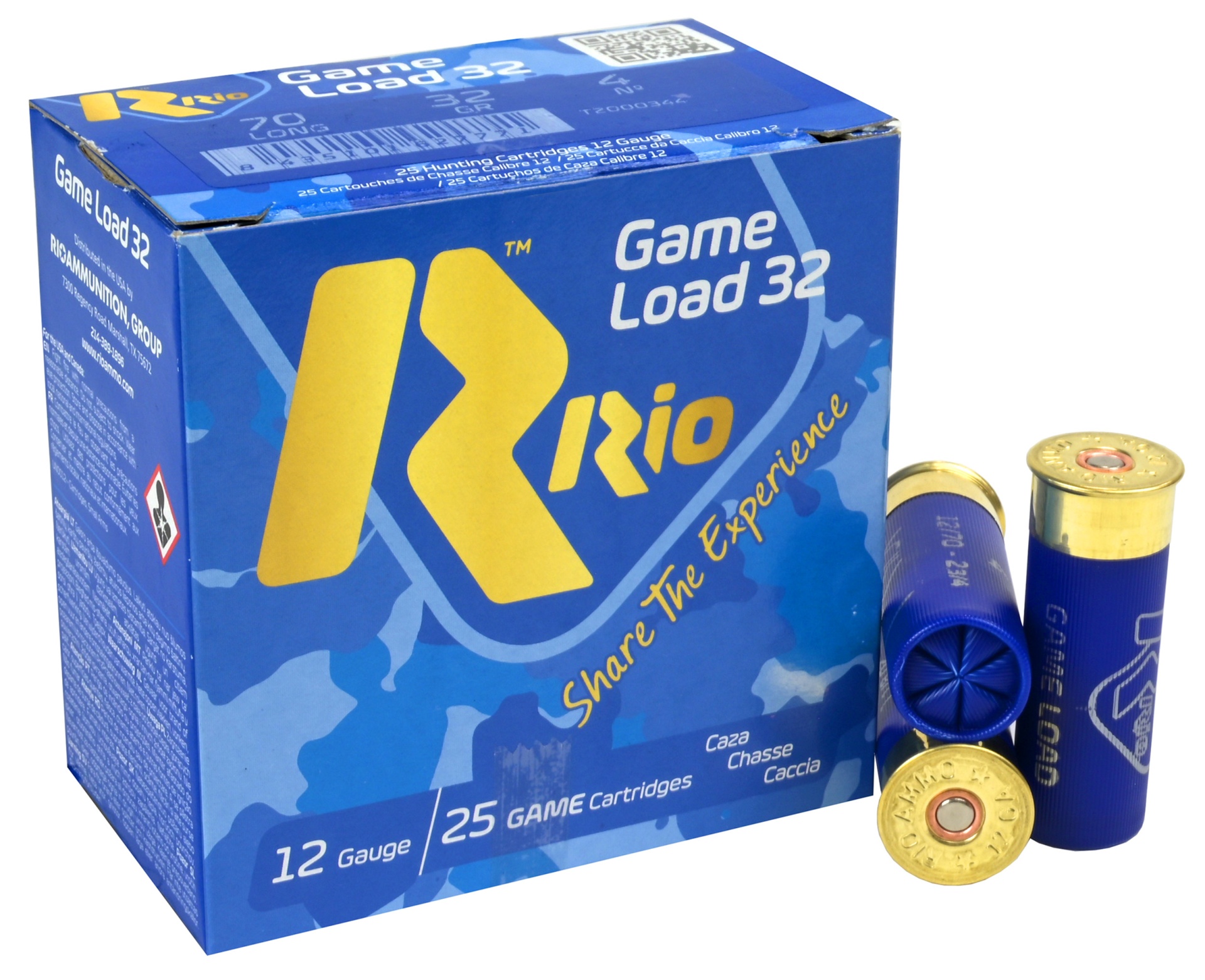 Caixa azul de cartuchos de caça Rio Game Load 32 calibre 12 e dois cartuchos ao lado