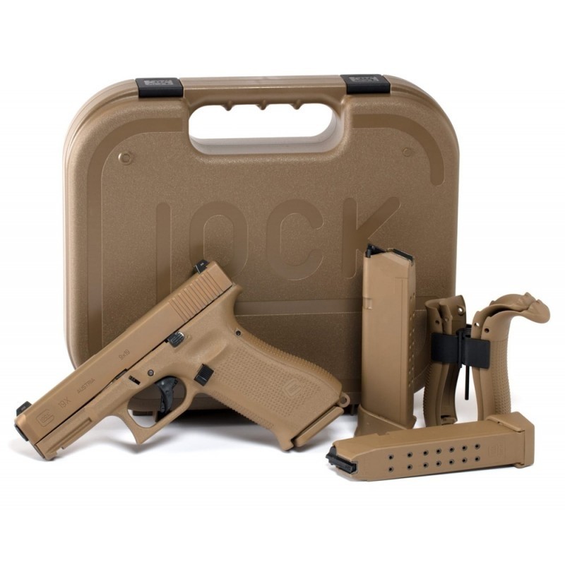 Pistola bege Glock com três carregadores e caixa rígida da mesma cor