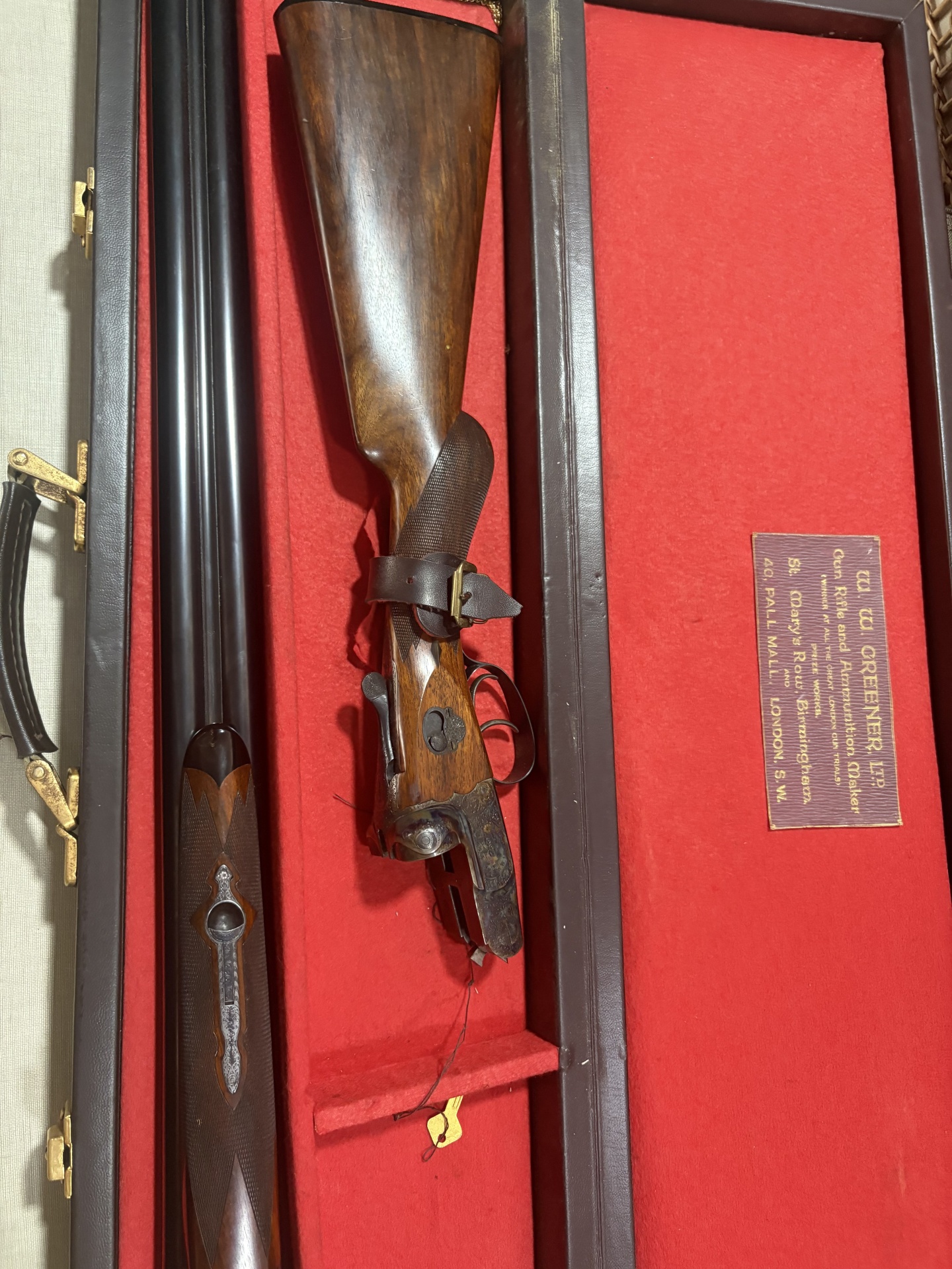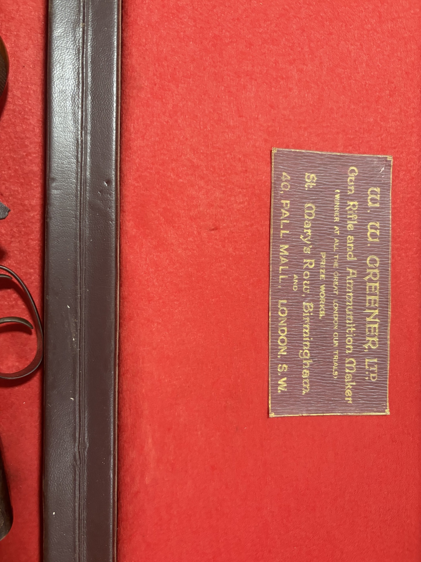 Estojo vermelho com etiqueta de fabricante e parte de arma de fogo com punho de madeira.