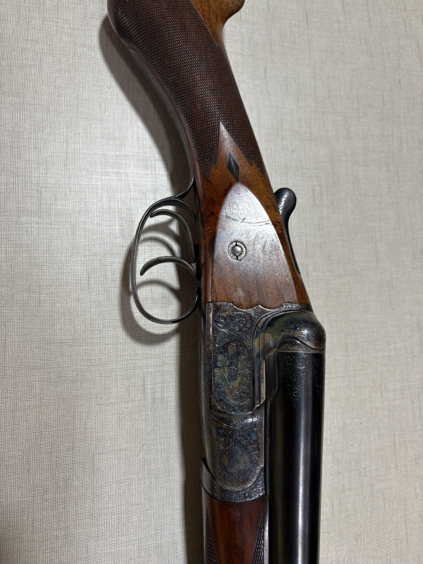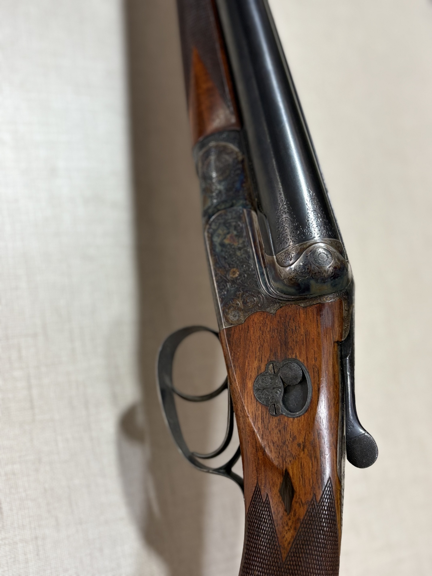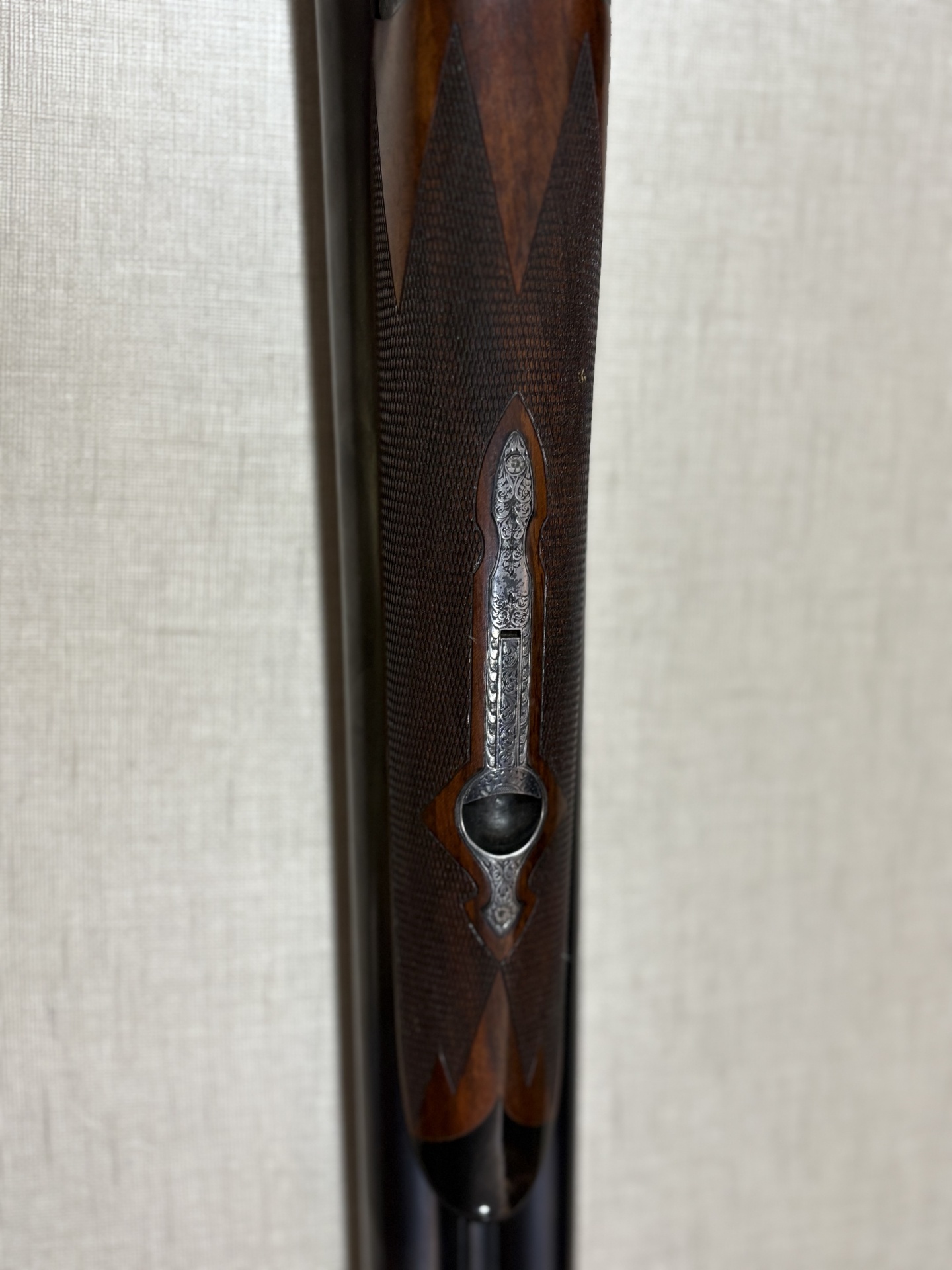 Espingarda em madeira escura com metal gravado e fundo bege texturizado