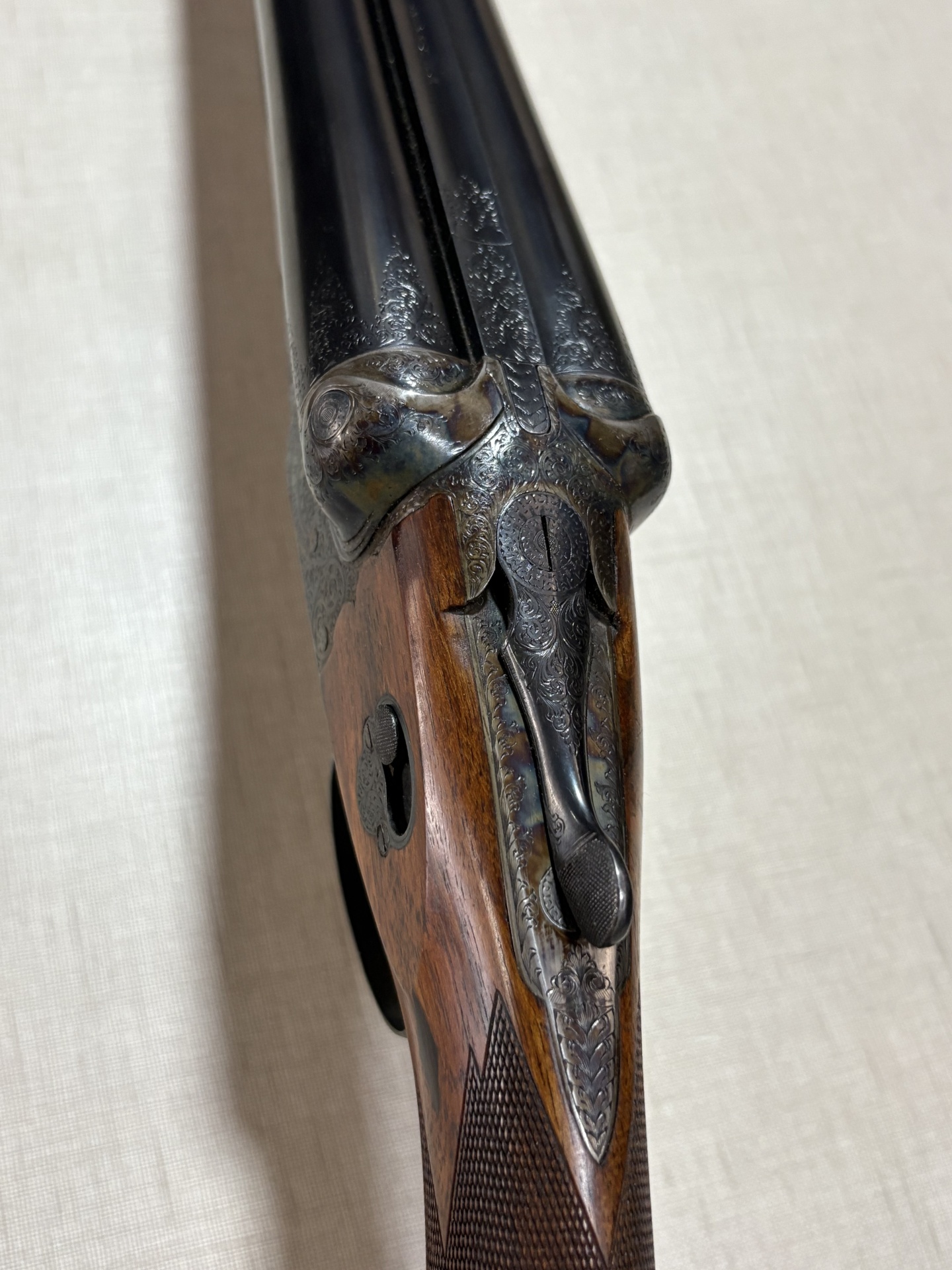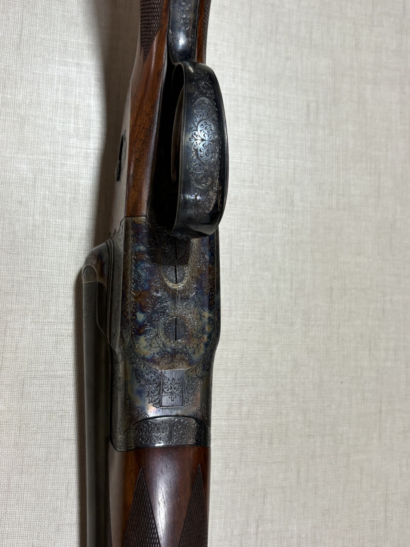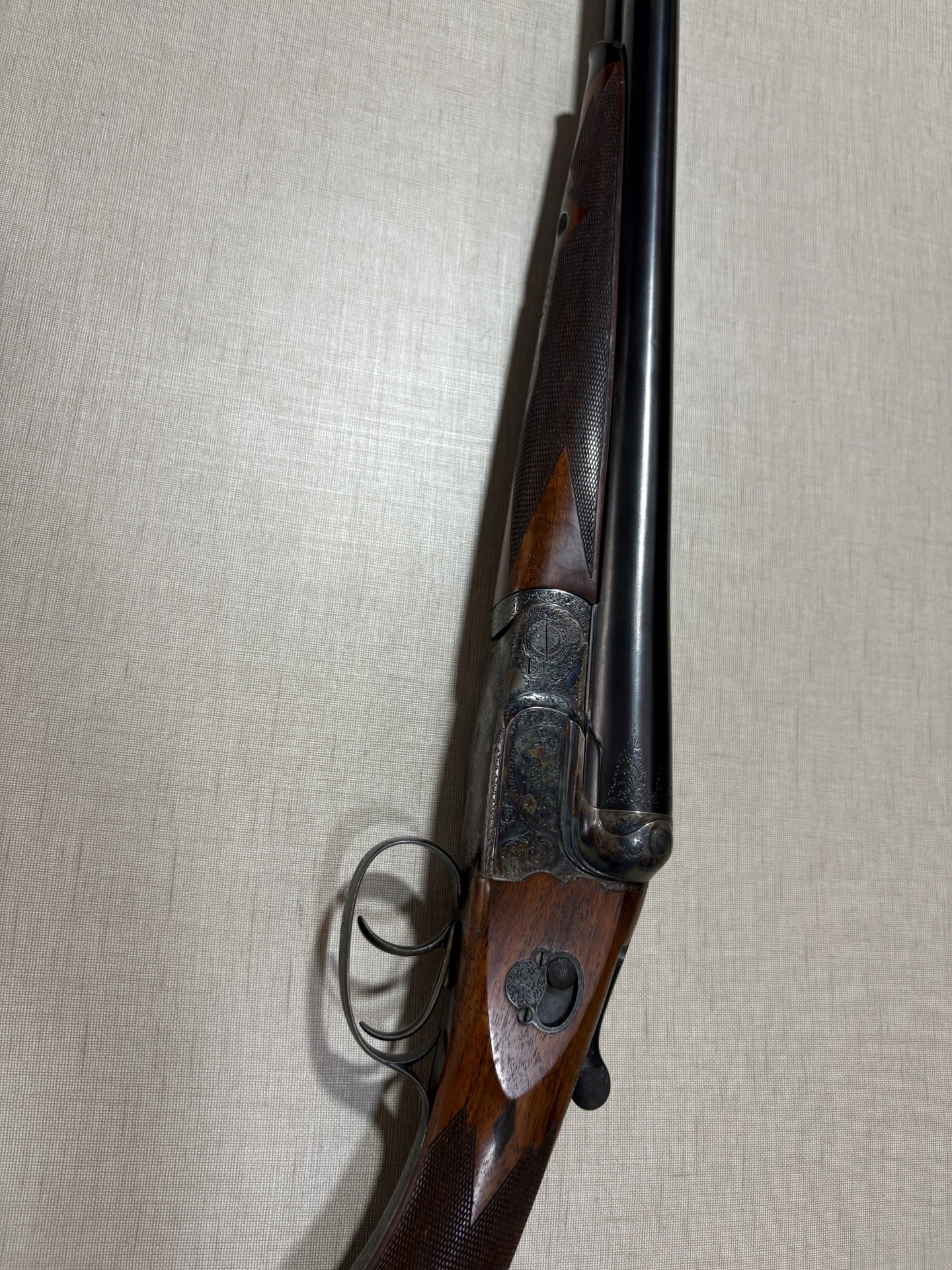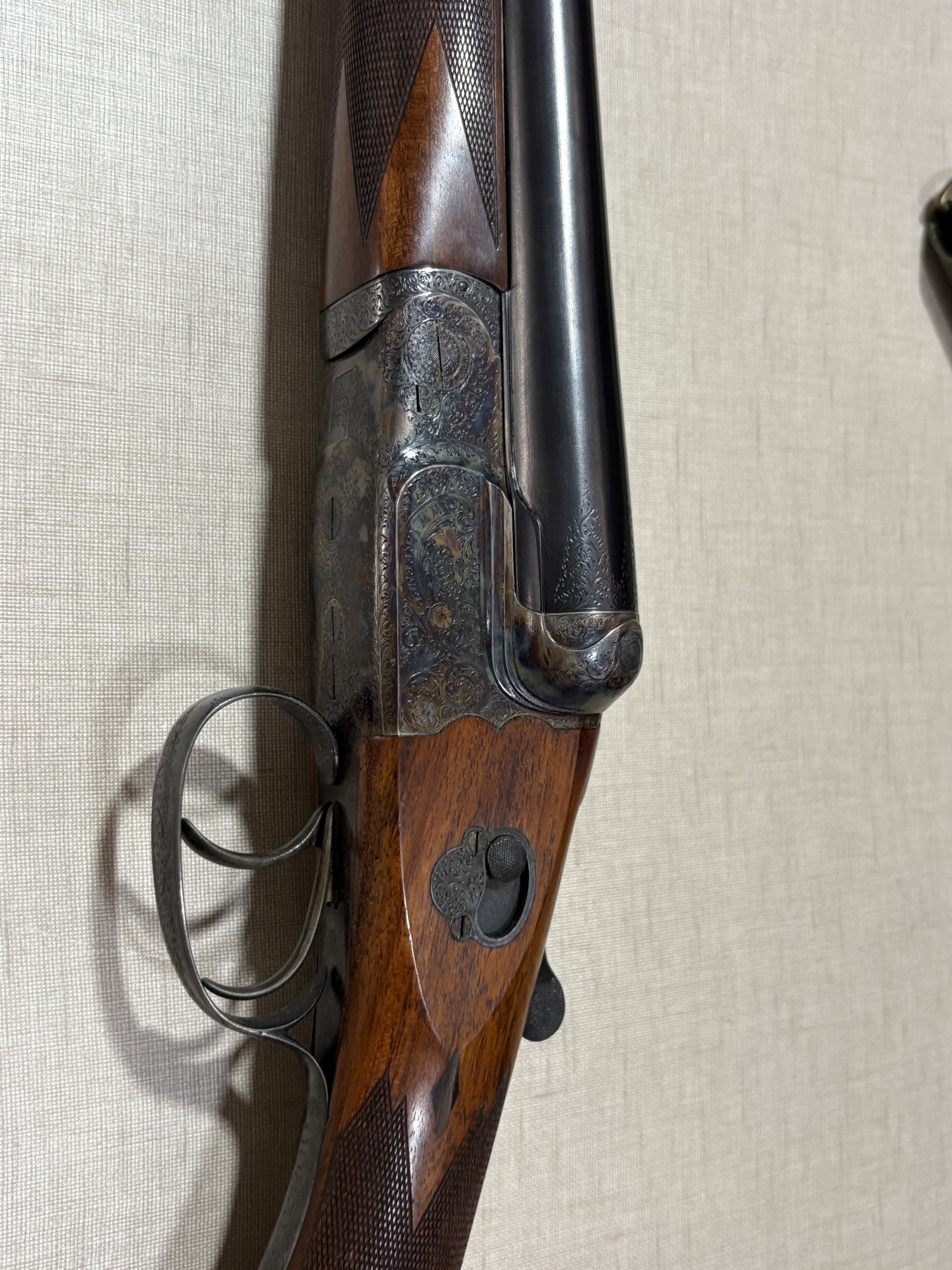 Espingarda em madeira escura com metal gravado e fundo bege texturizado