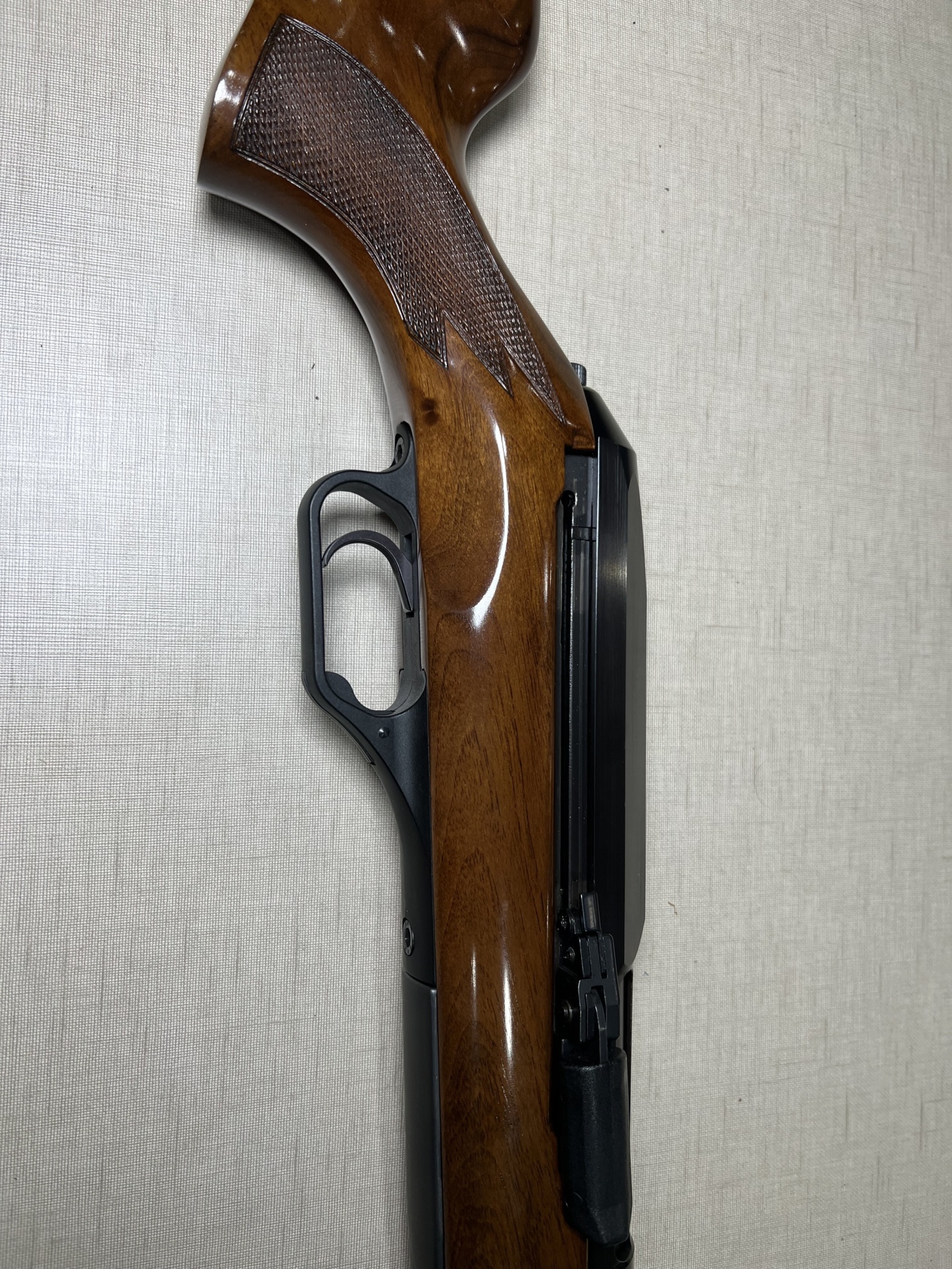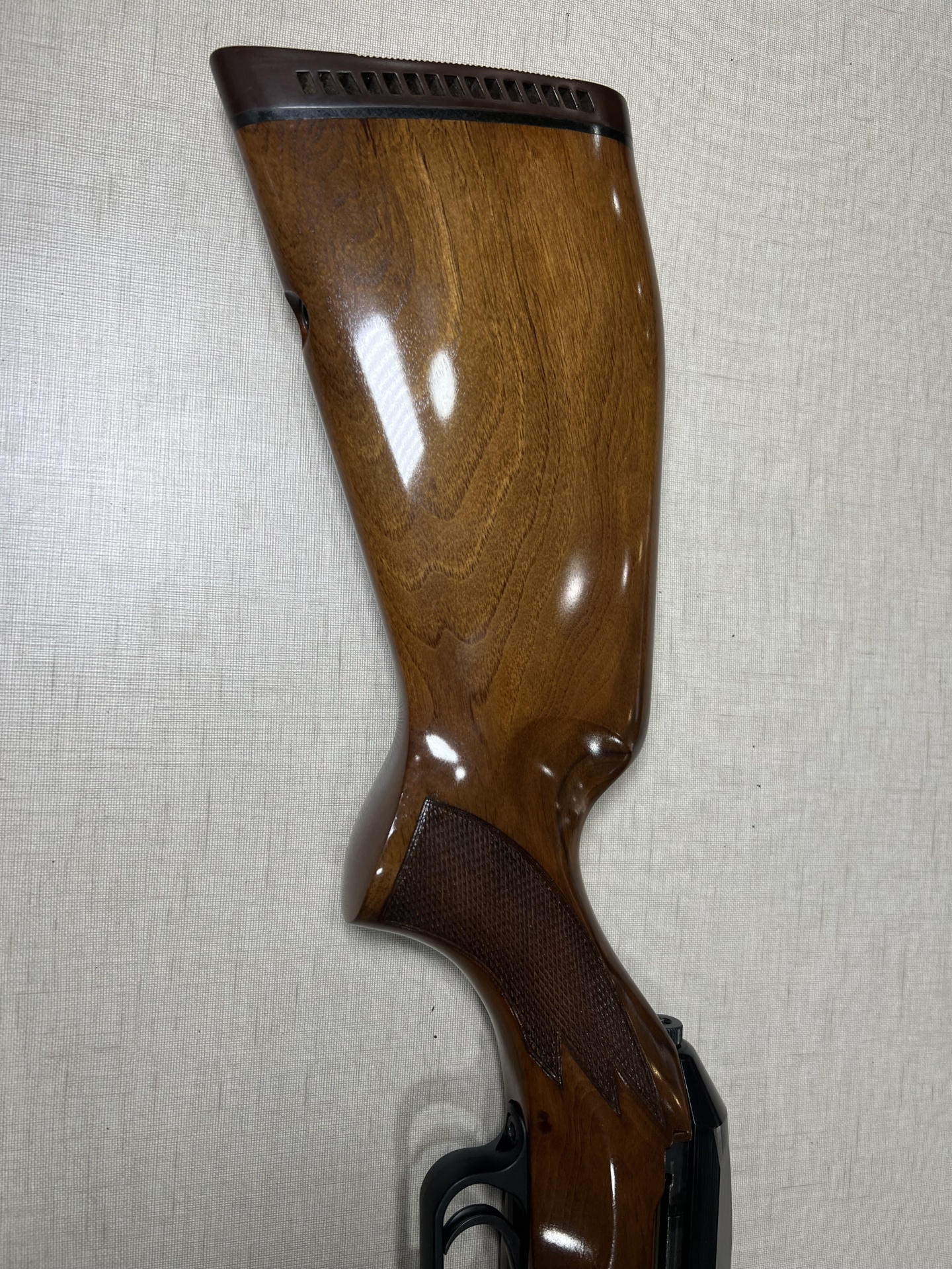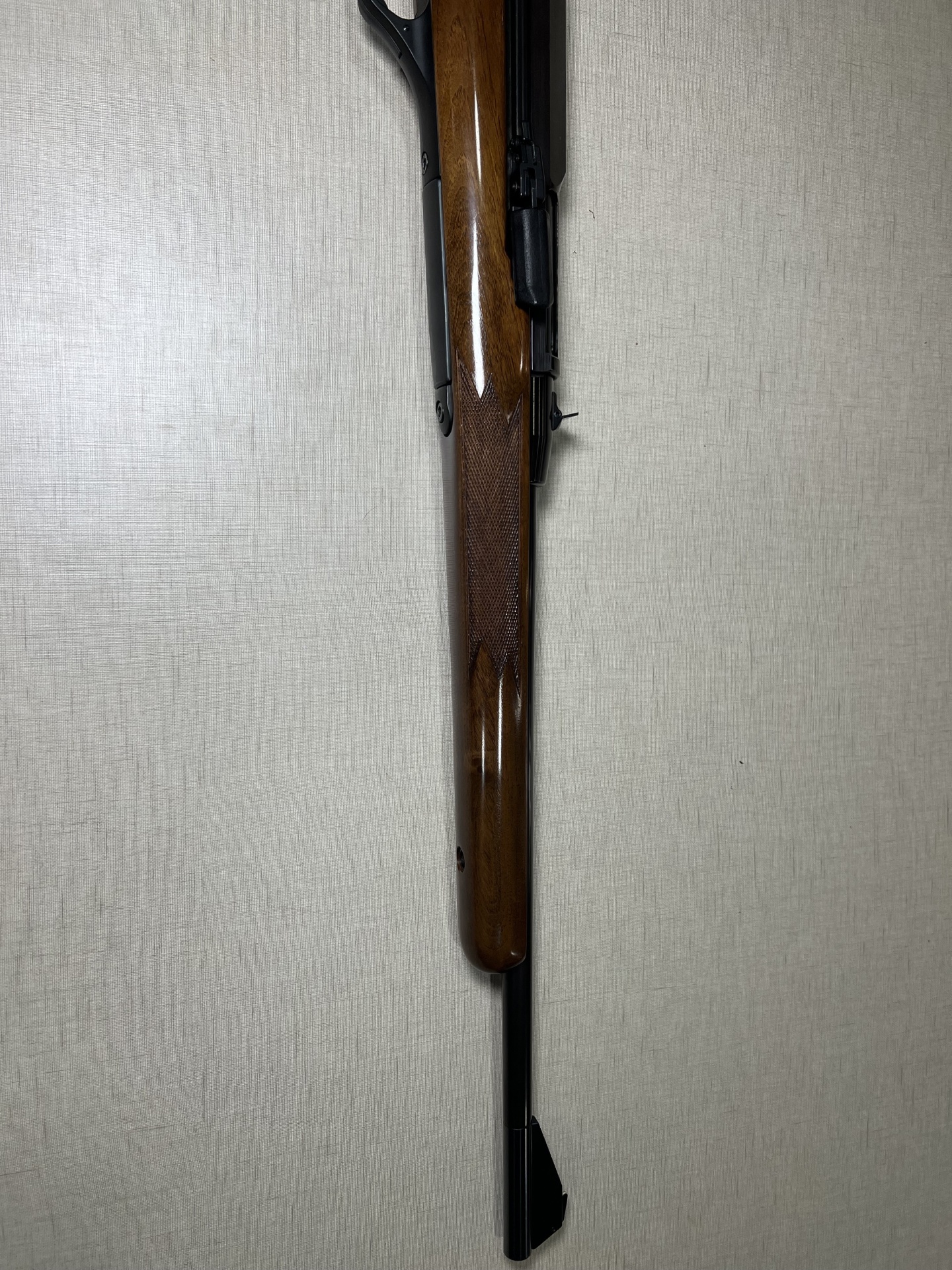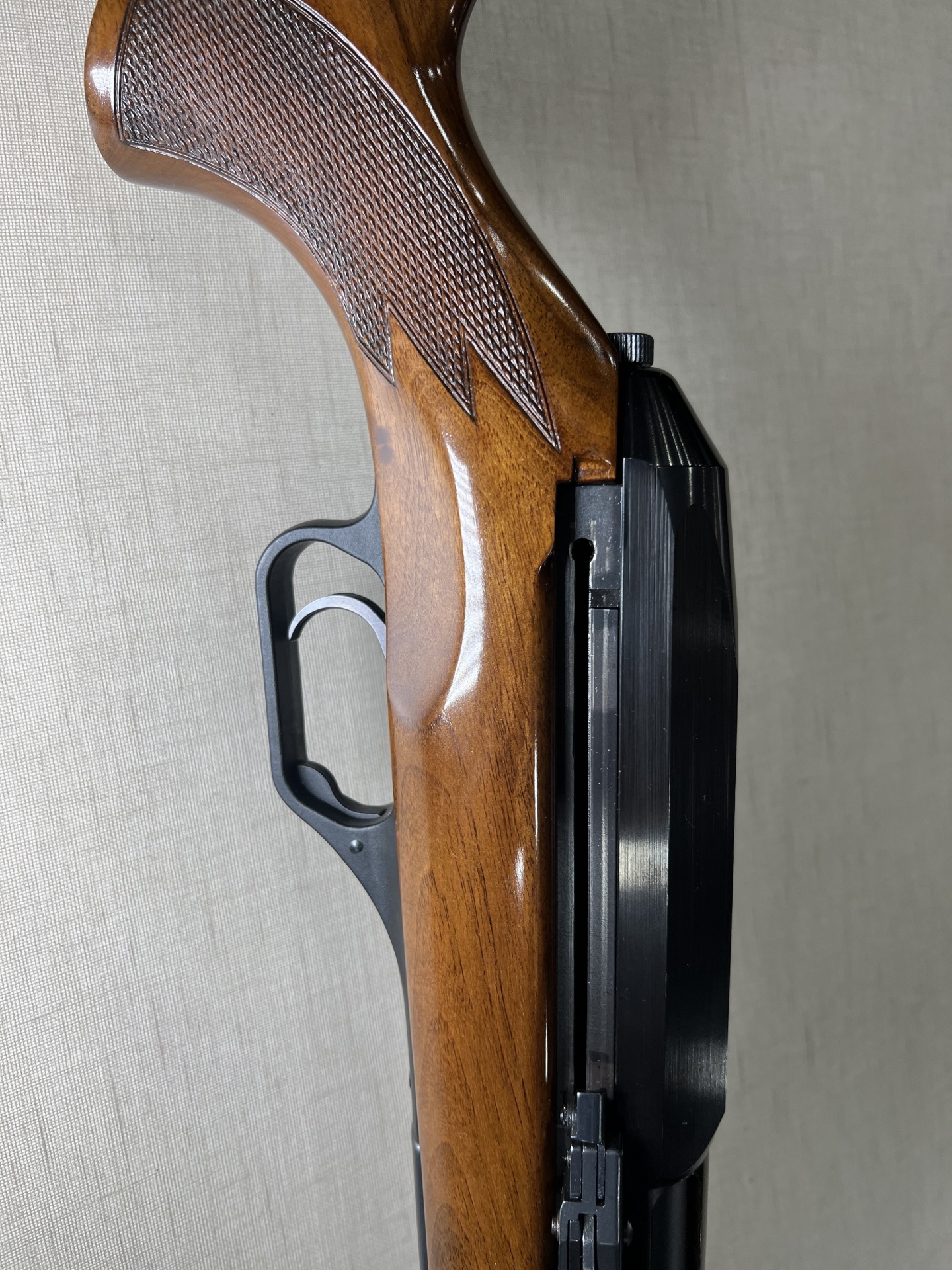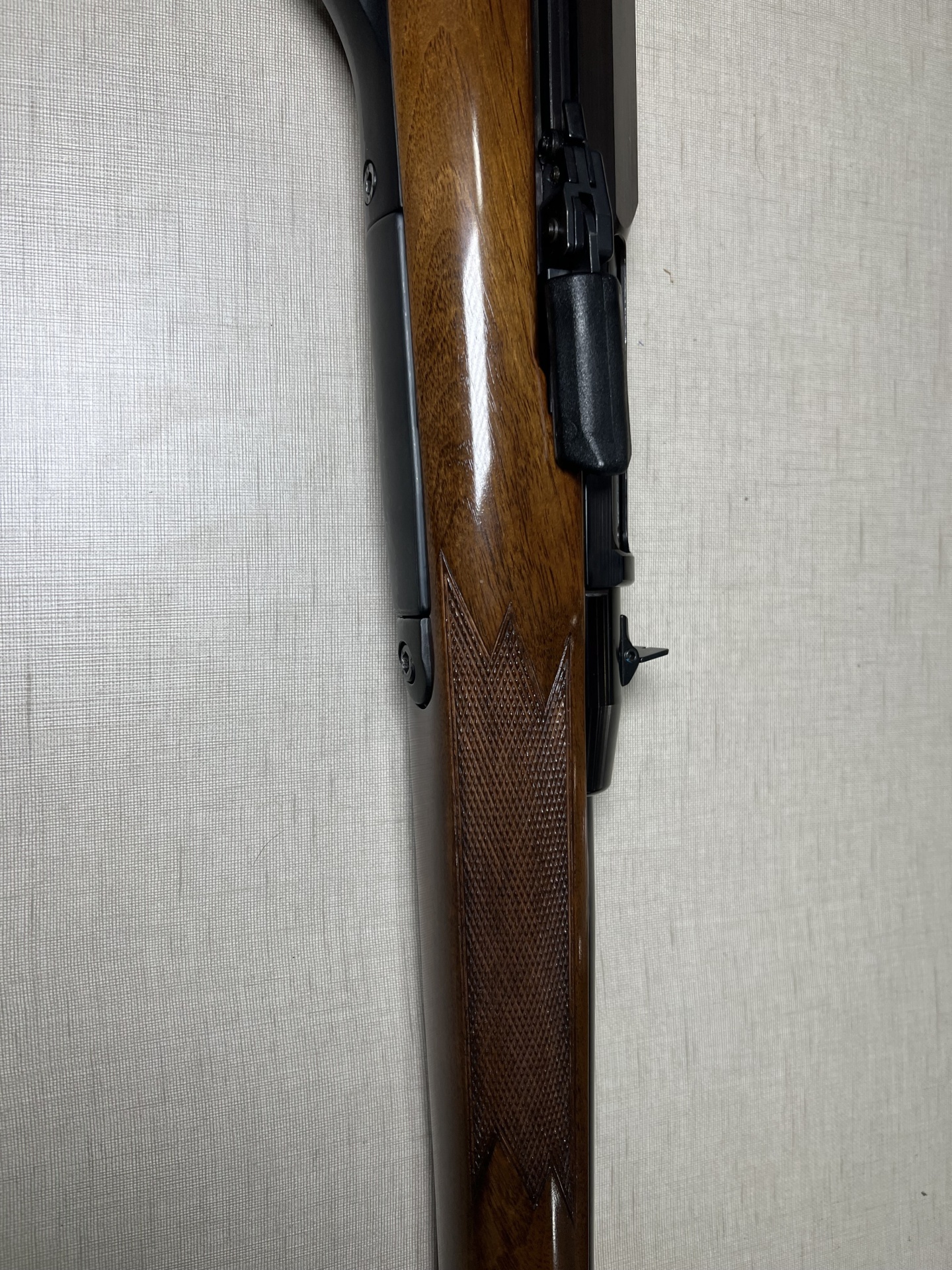 Carabina de madeira polida com detalhes em metal preto encostada numa parede clara