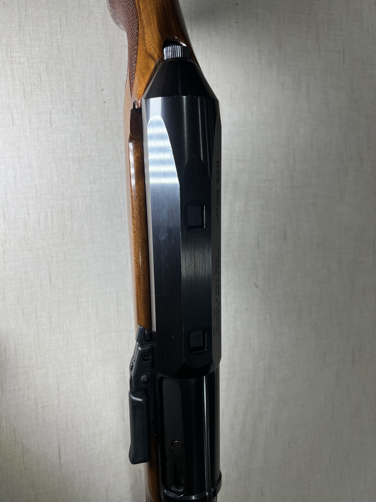 Espingarda com madeira polida e detalhes pretos