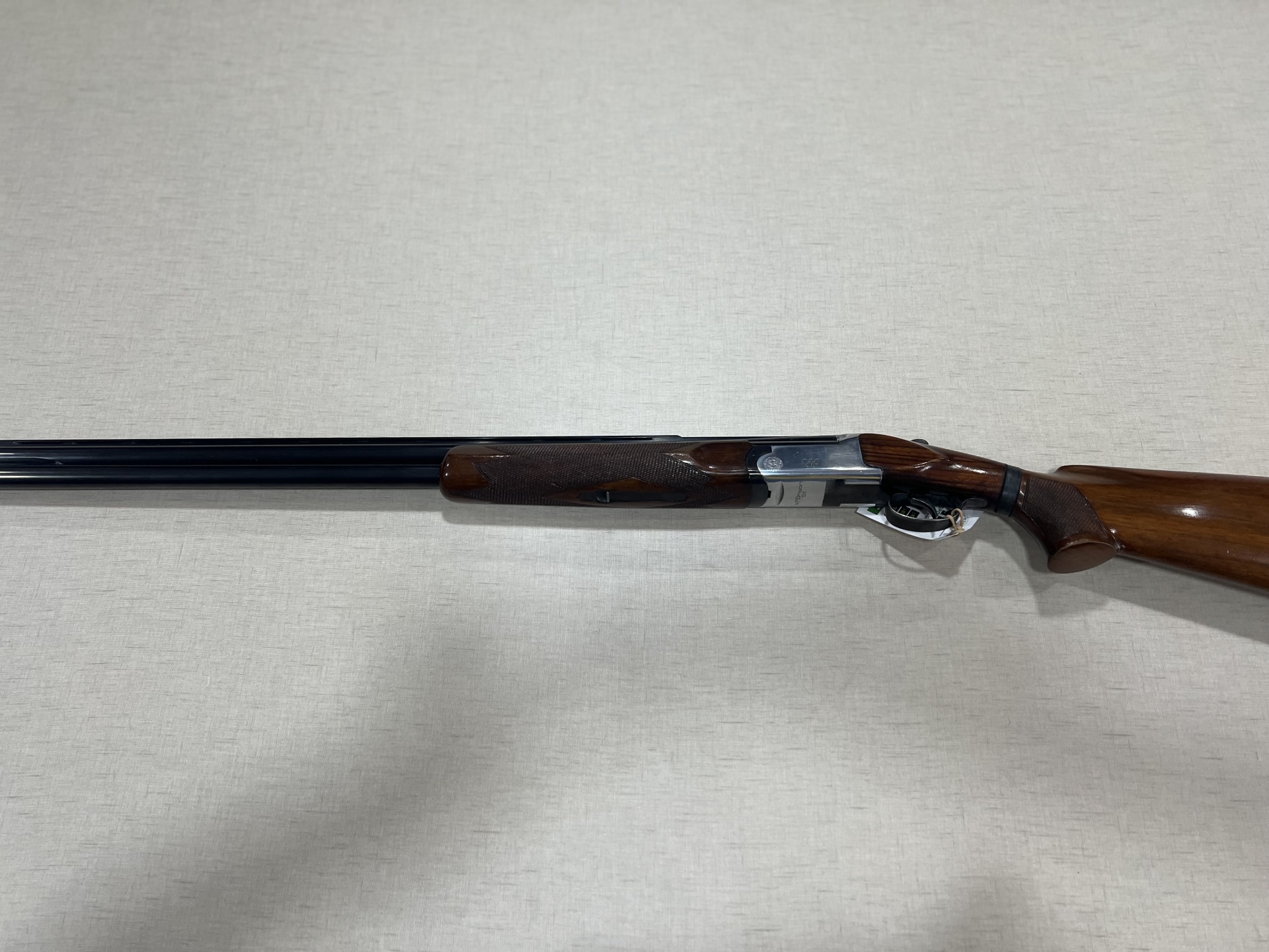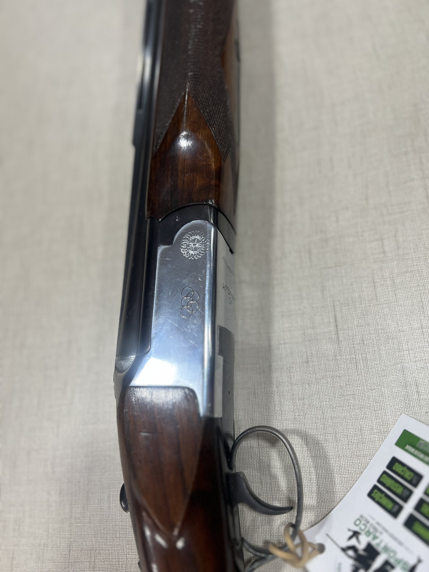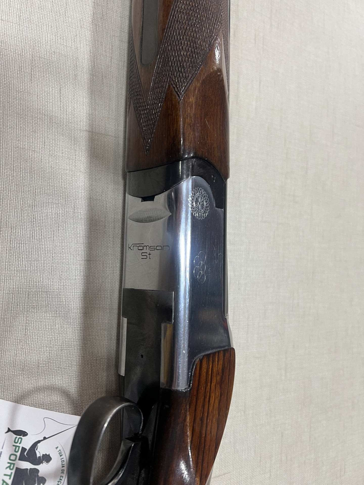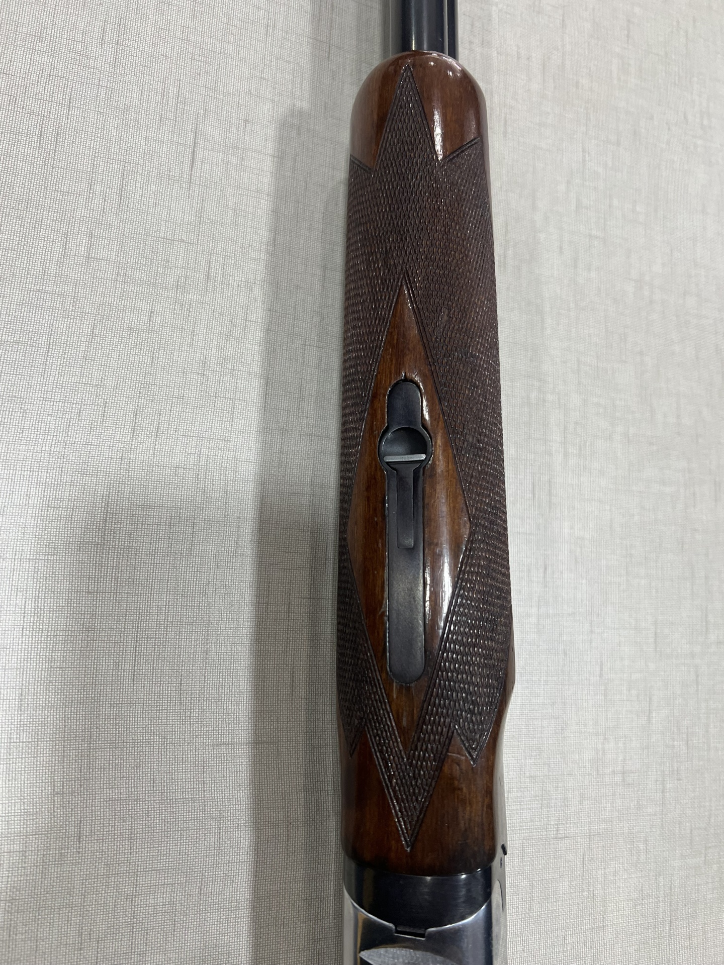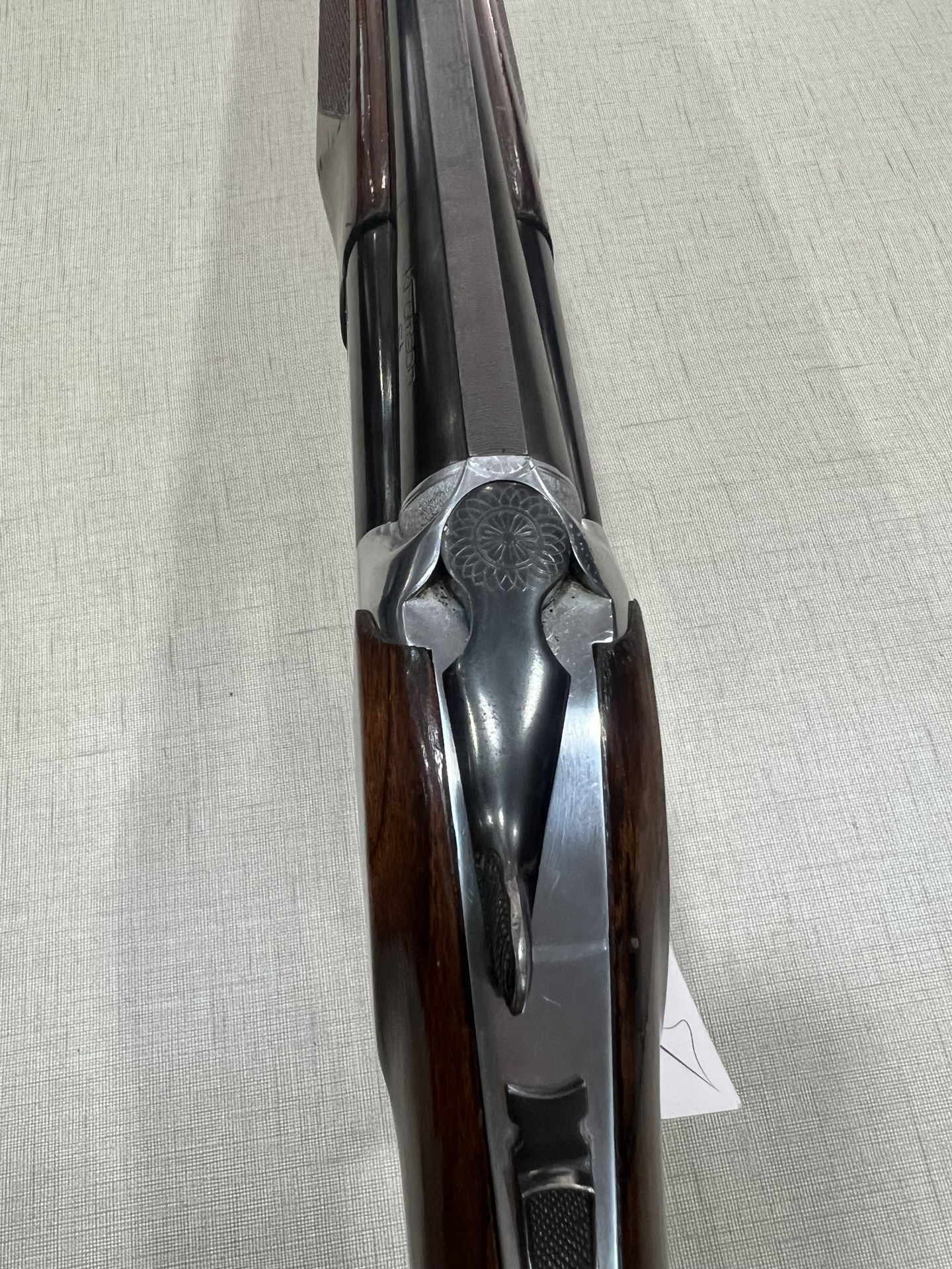 Espingarda de canos paralelos com madeira escura e metal gravado