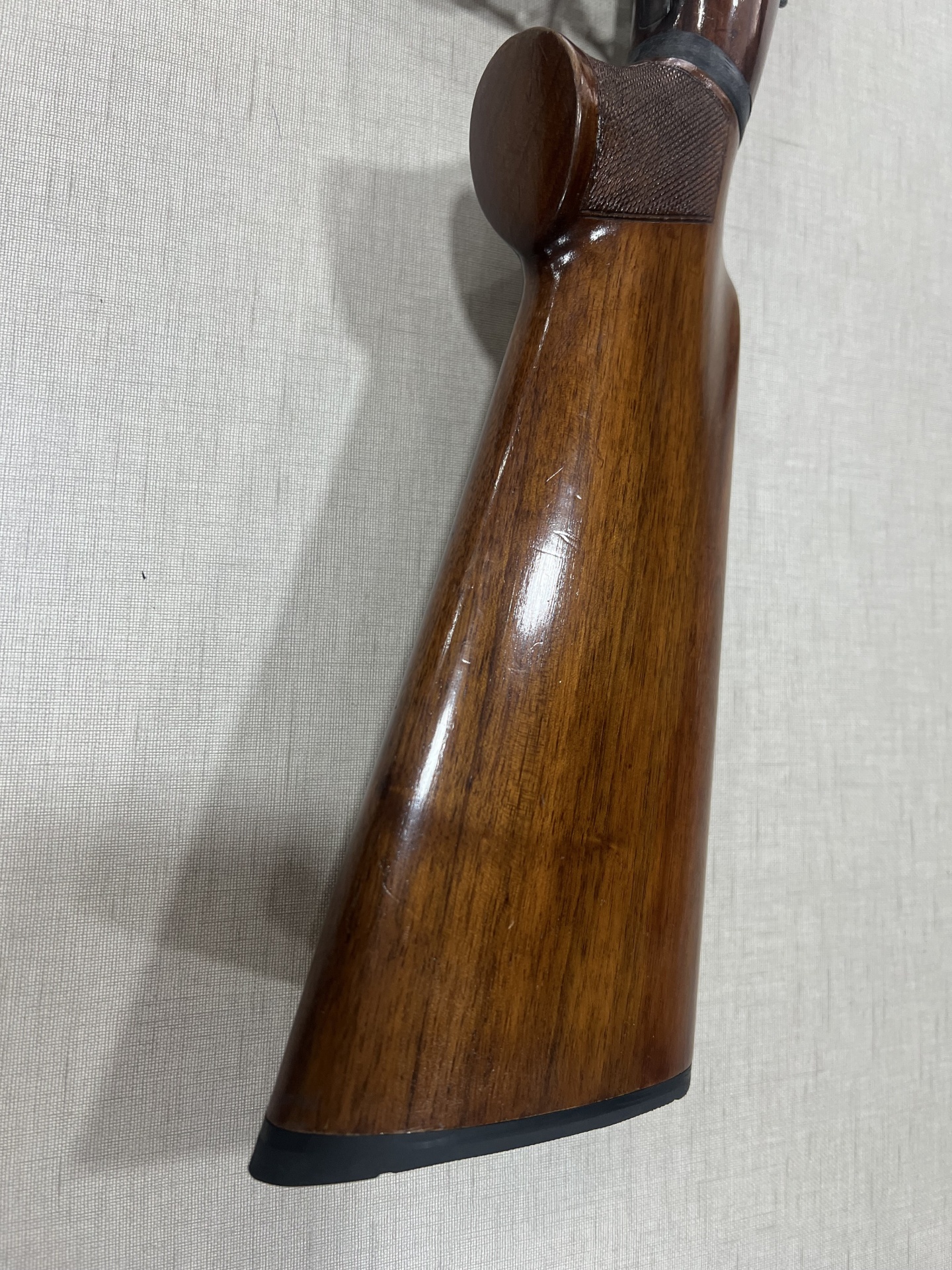Parte de arma com empunhadura em madeira texturada e metal preto
