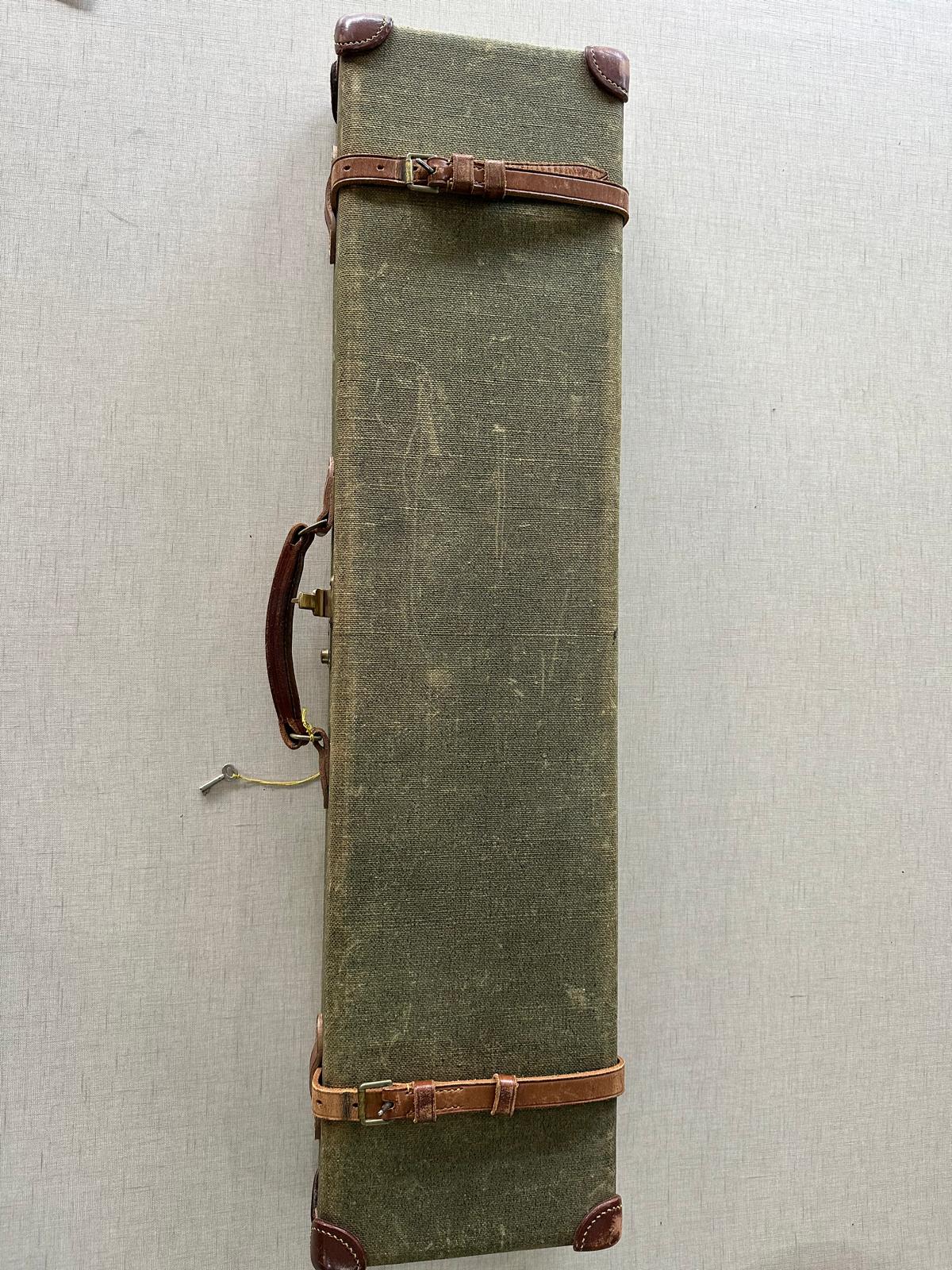 Estojo retangular verde com cantos em couro castanho e alça lateral