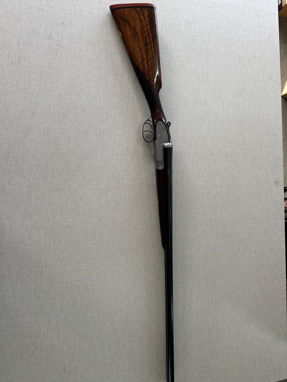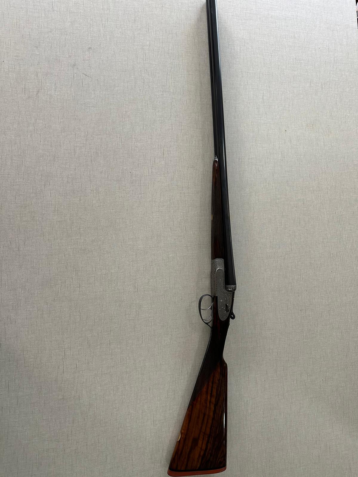 Espingarda de cano duplo com coronha castanha e detalhes metálicos prateados