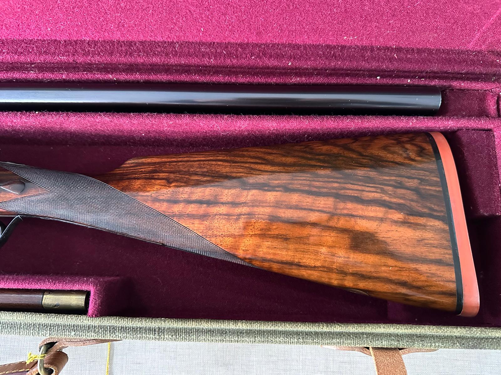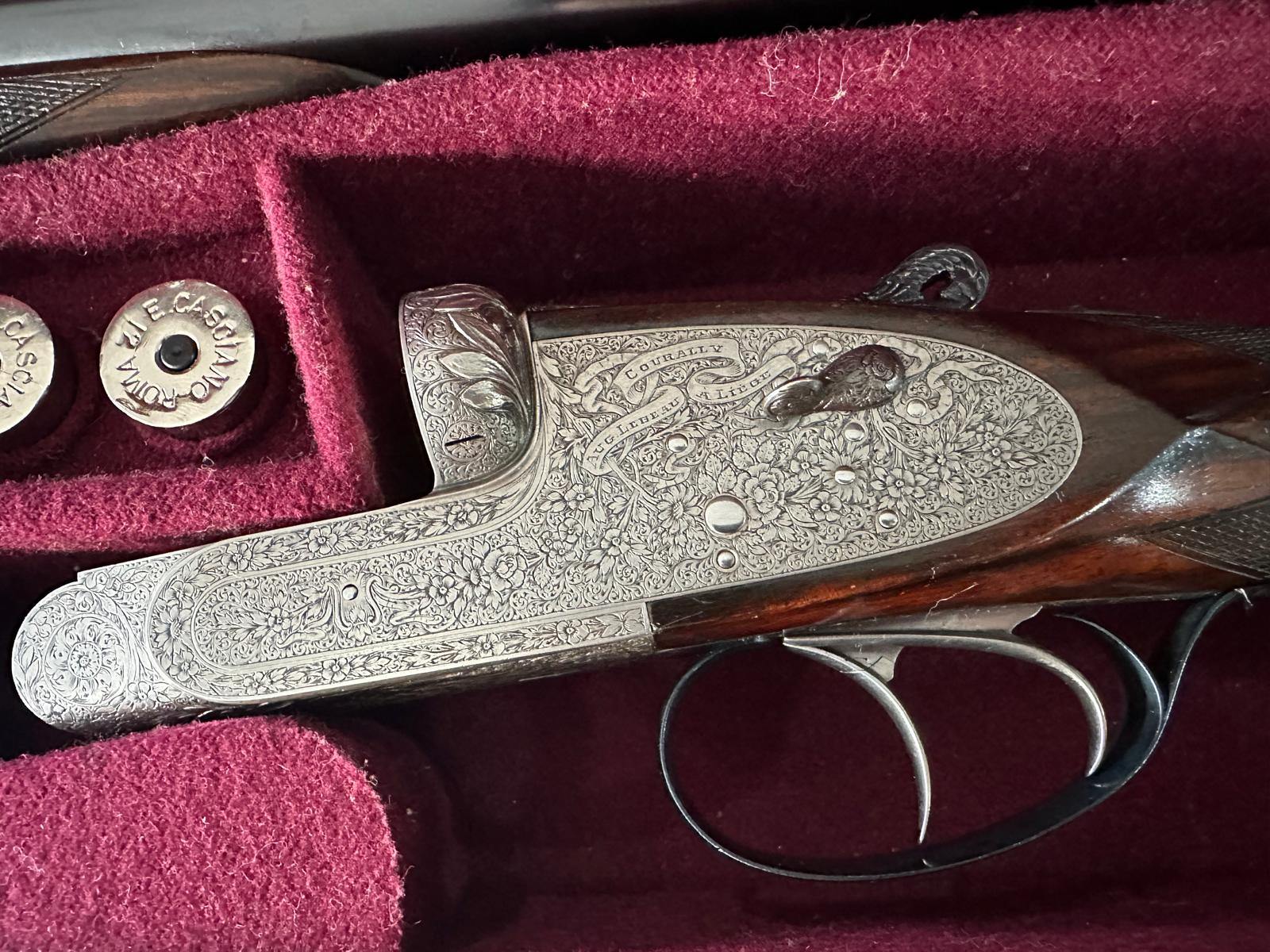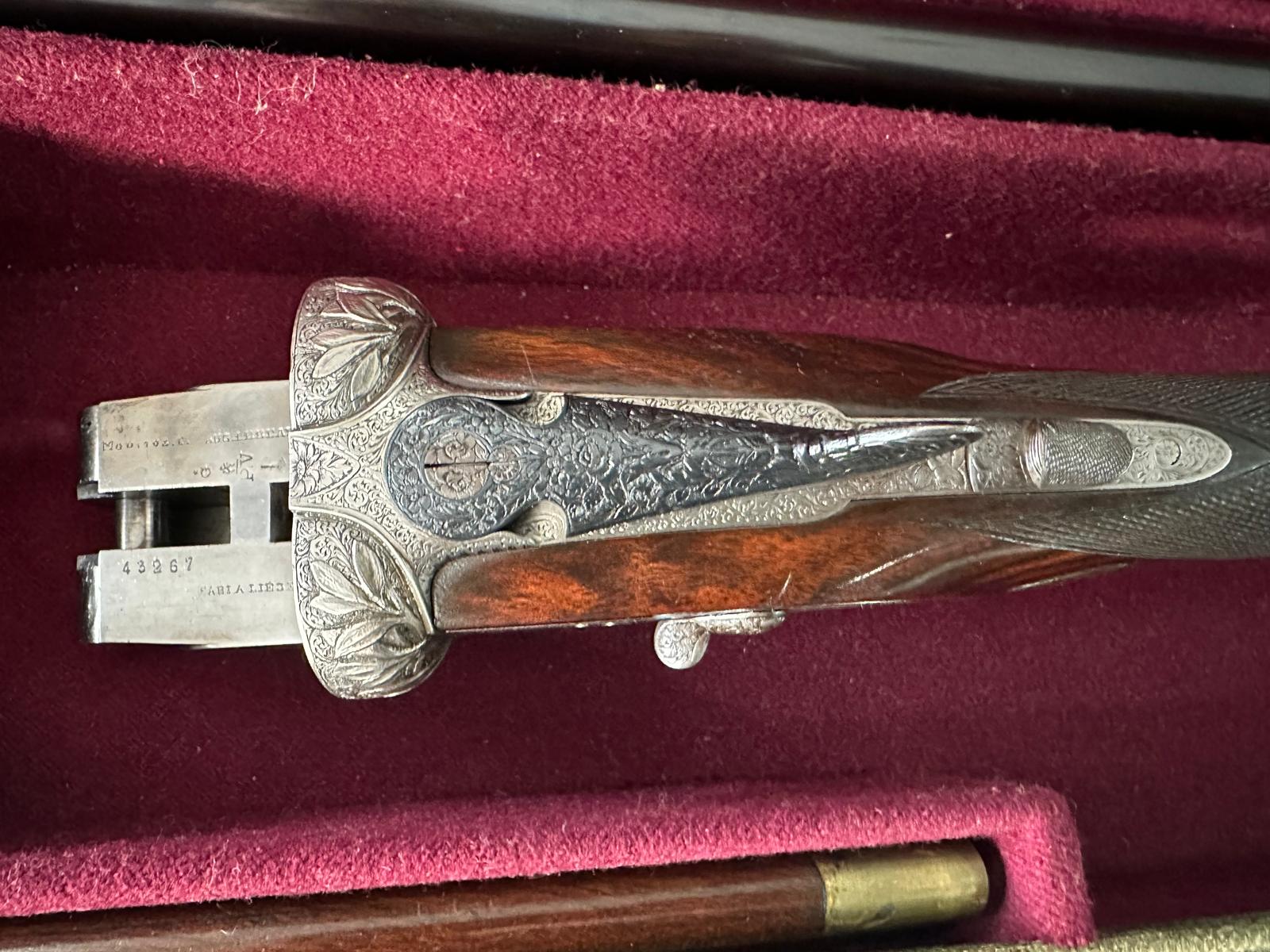 Arma de fogo de cano duplo com decoração em metal e coronha de madeira em caixa de veludo.