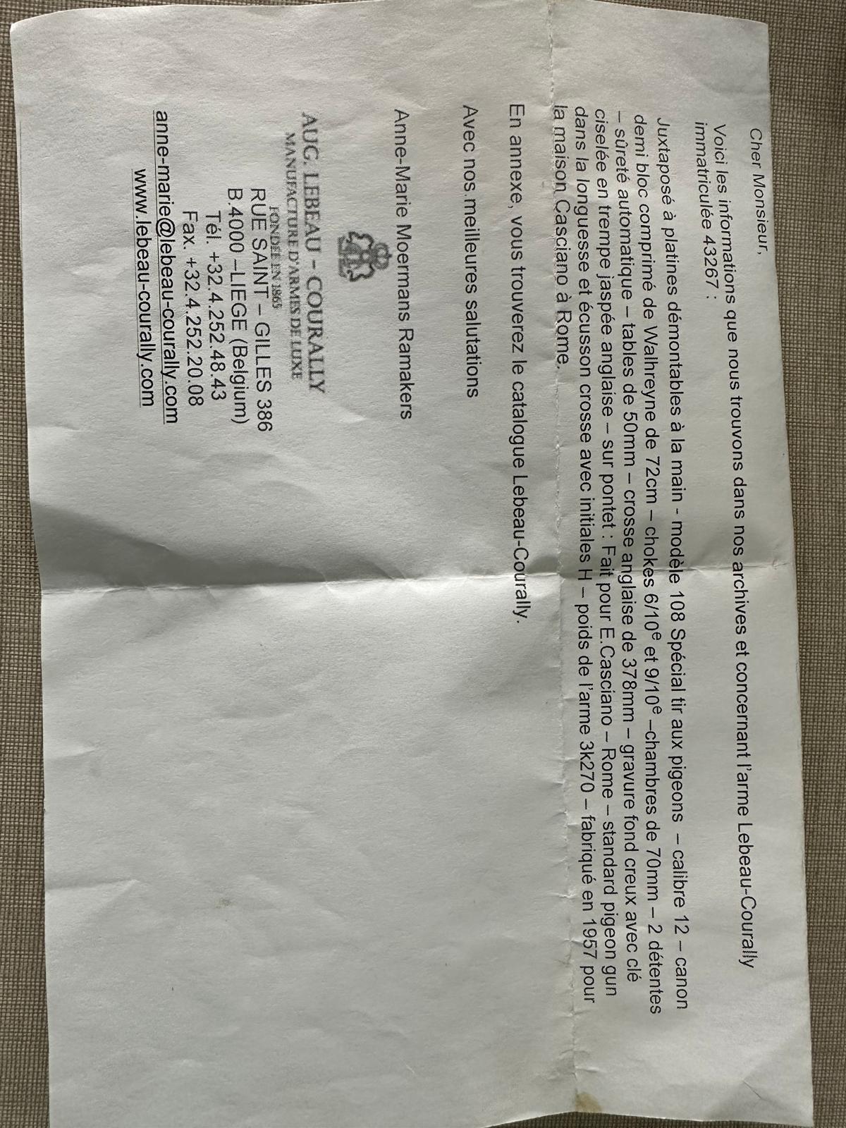 Folha de papel branca com texto impresso em francês, informações de contacto e detalhes técnicos de rifles