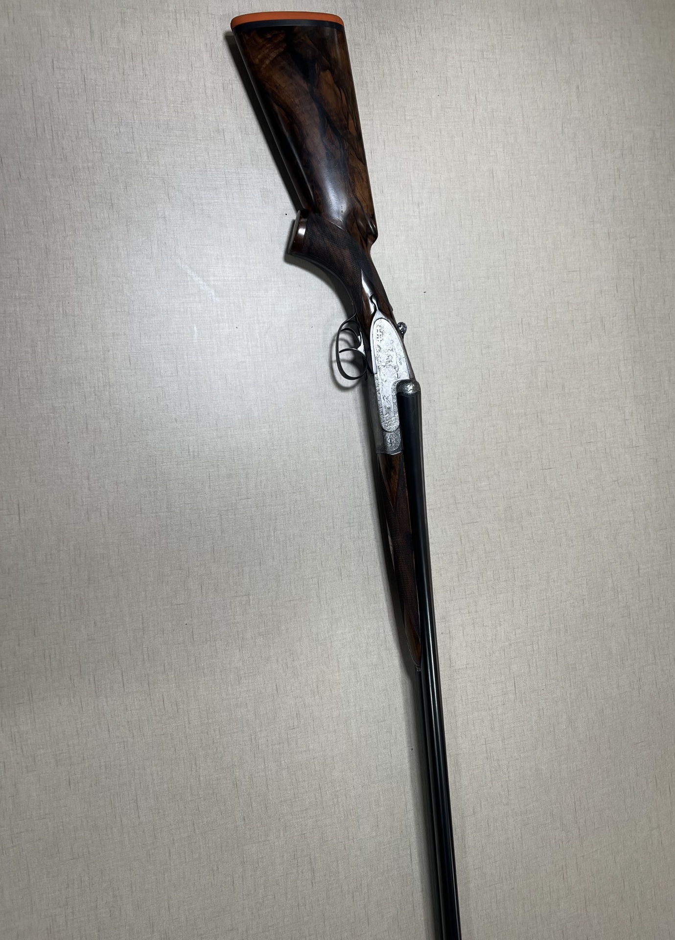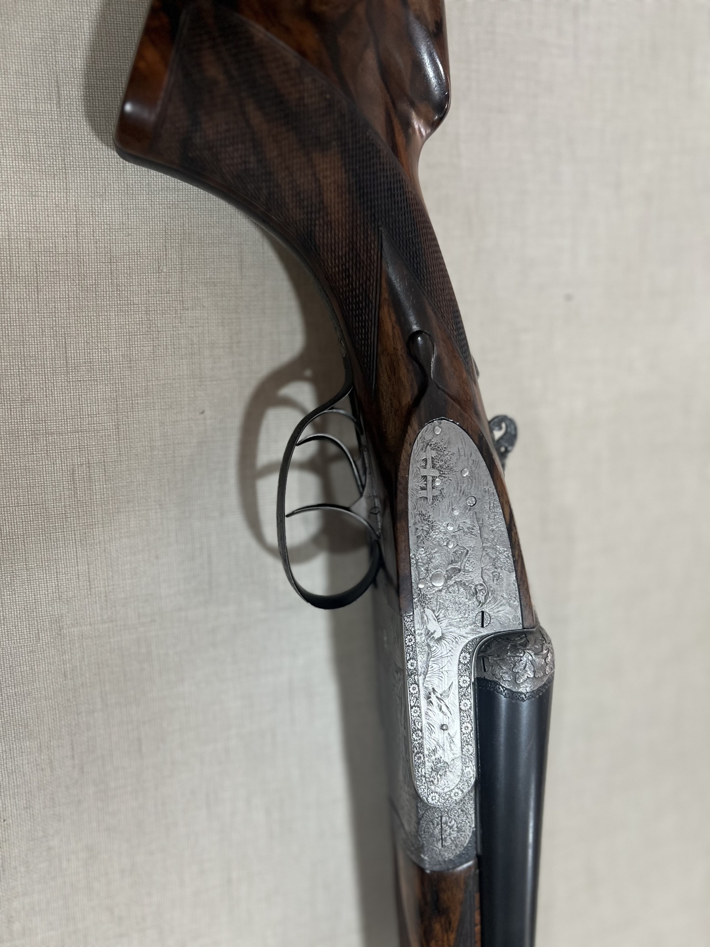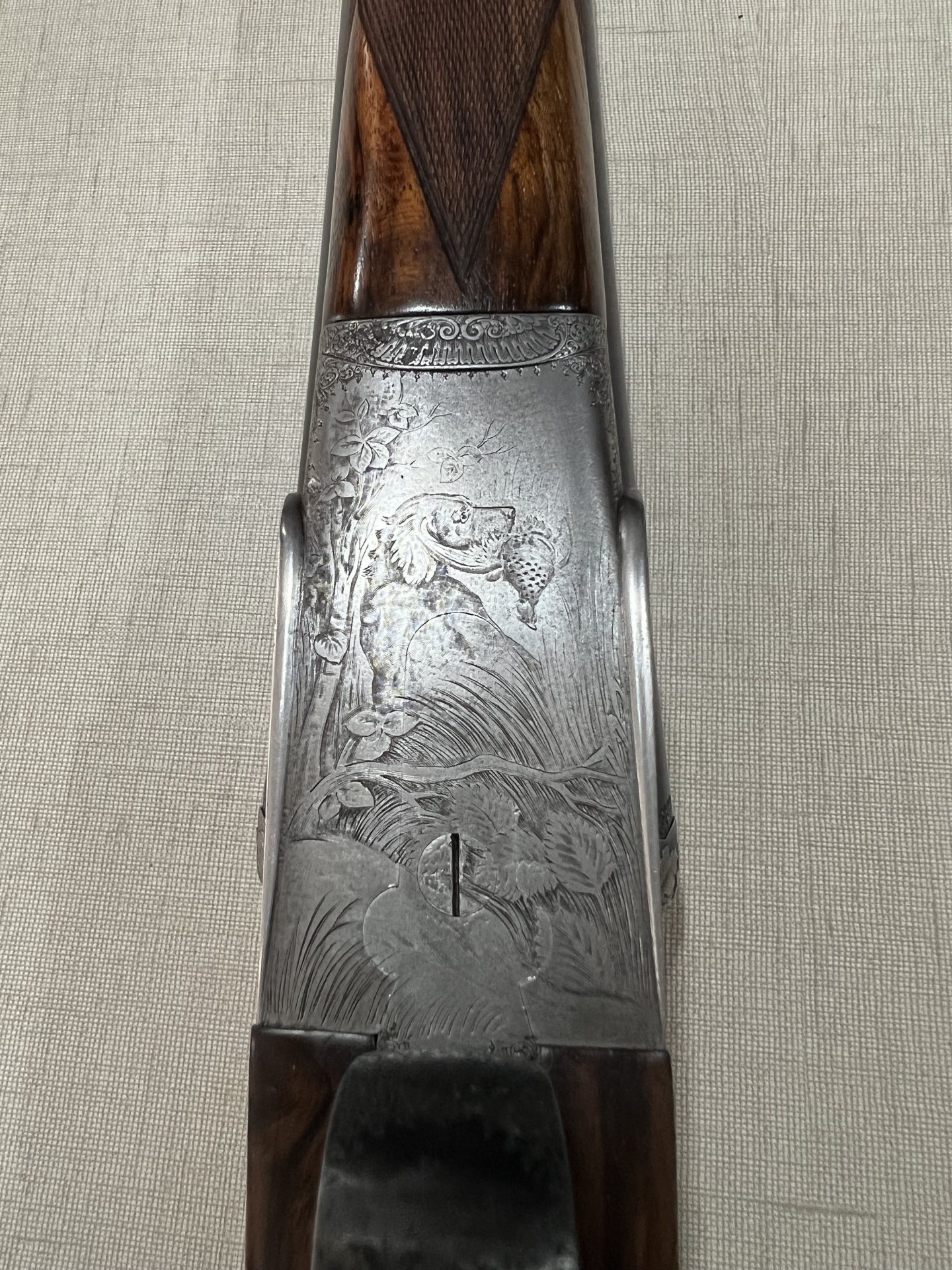 Espingarda com coronha em madeira escura e acabamento metálico gravado, com dois gatilhos e canos duplos.