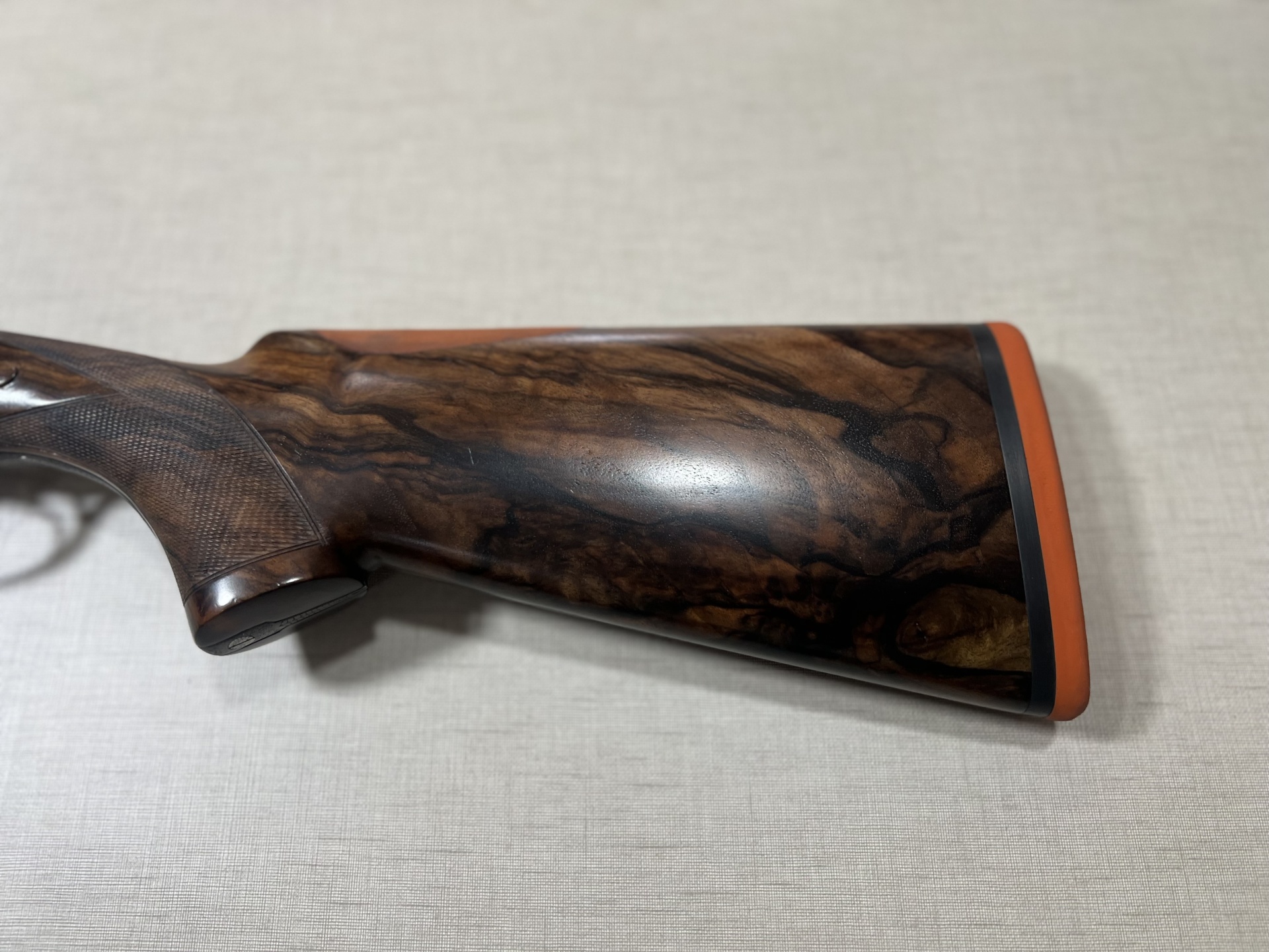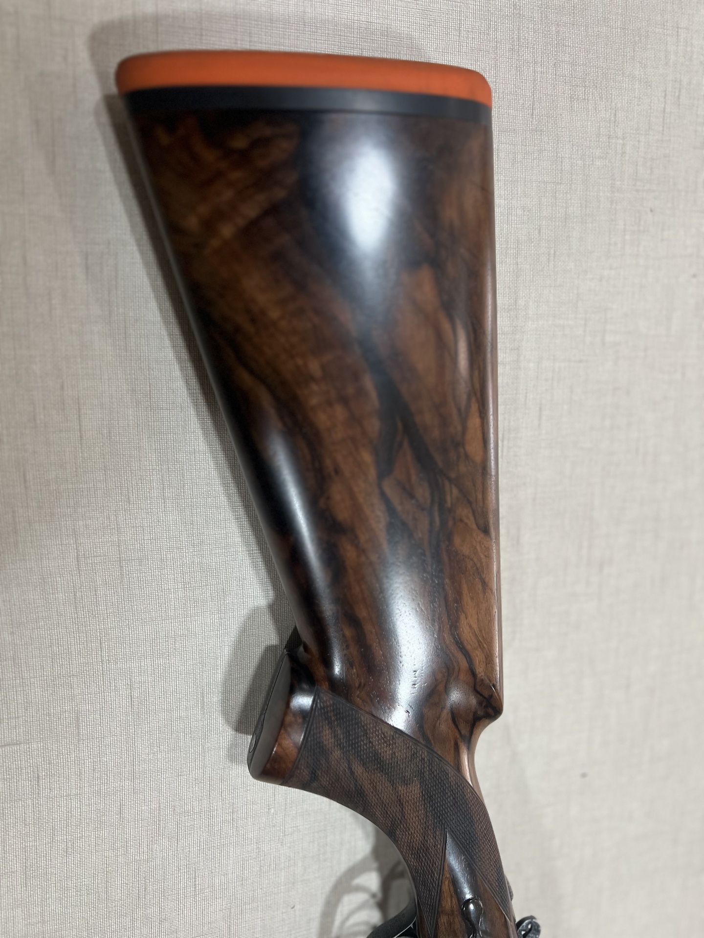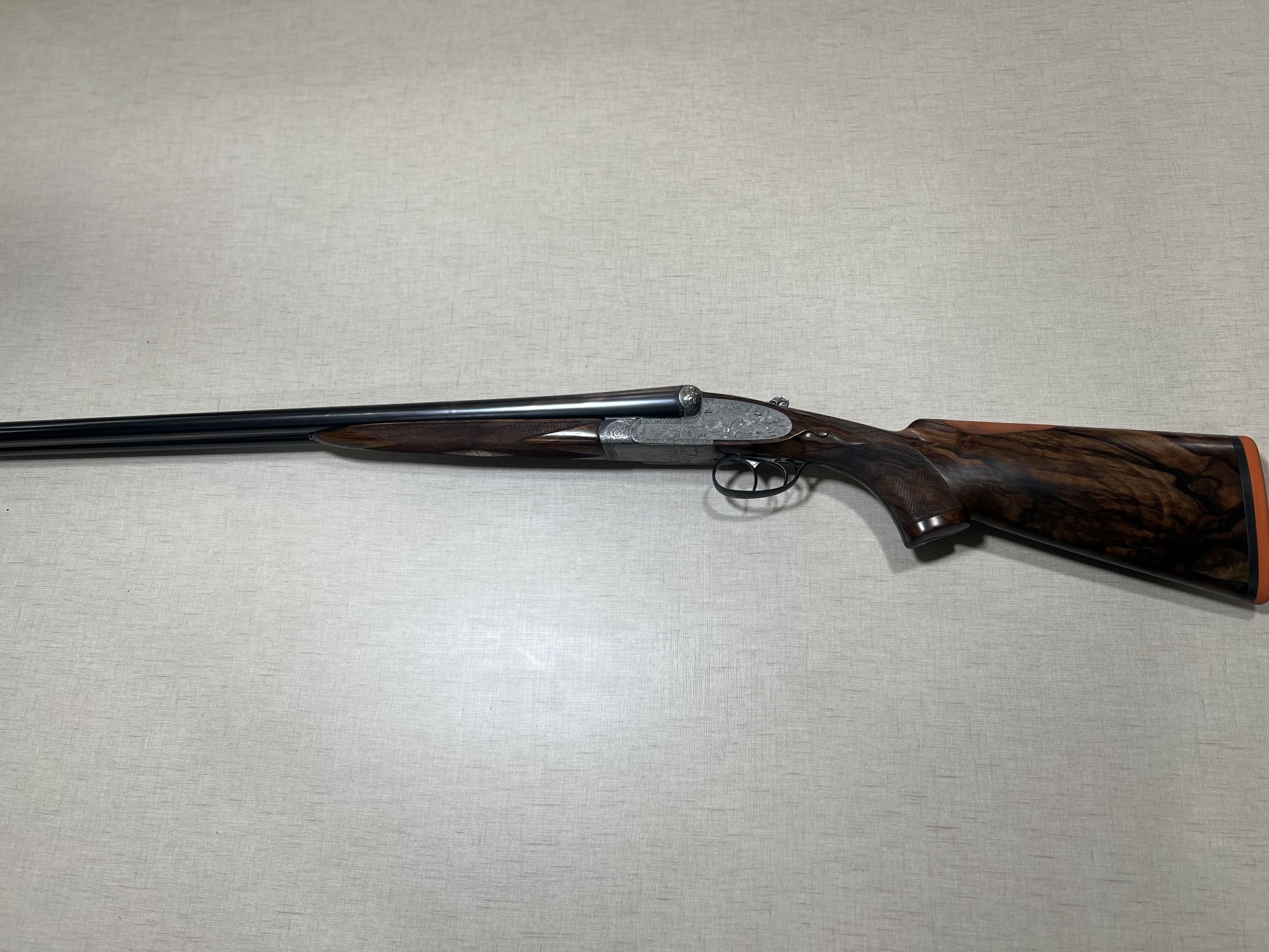 Espingarda com coronha em madeira escura e acabamento metálico gravado, com dois gatilhos e canos duplos.