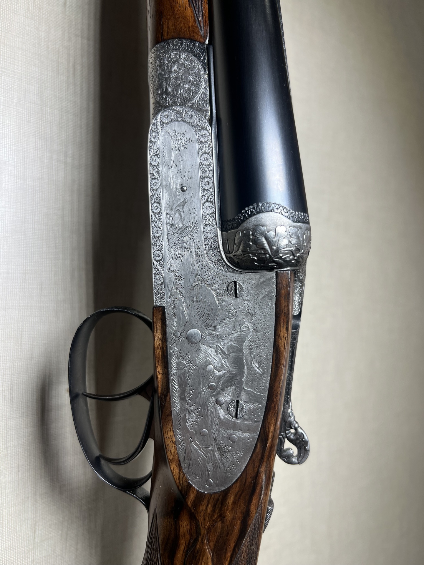 Espingarda de canos duplos com madeira escura e acabamentos metálicos gravados