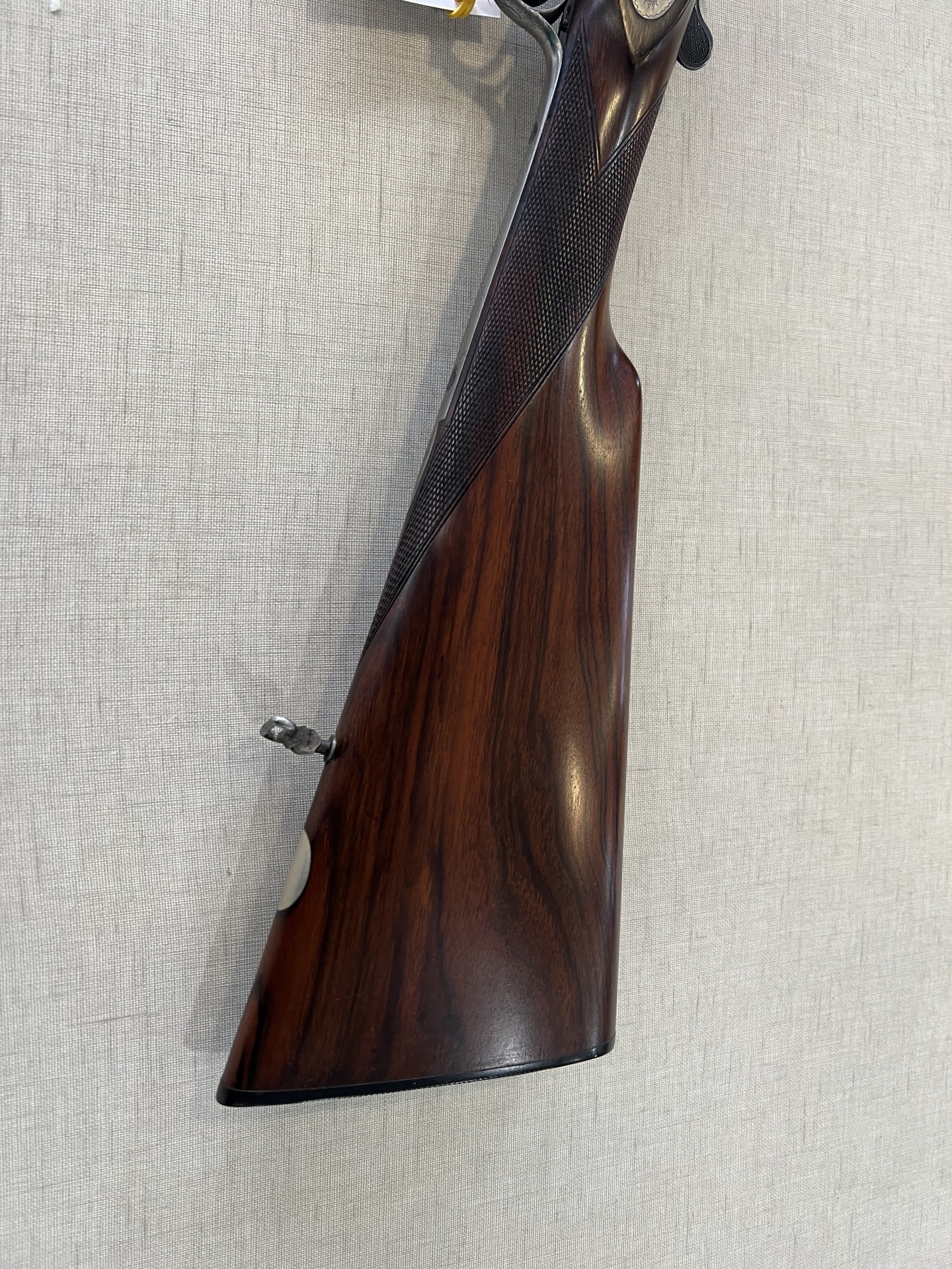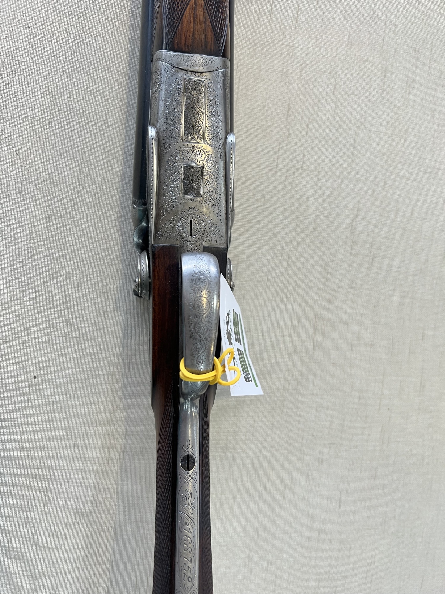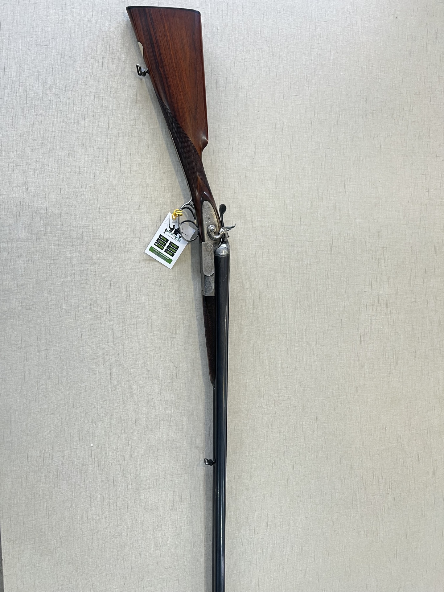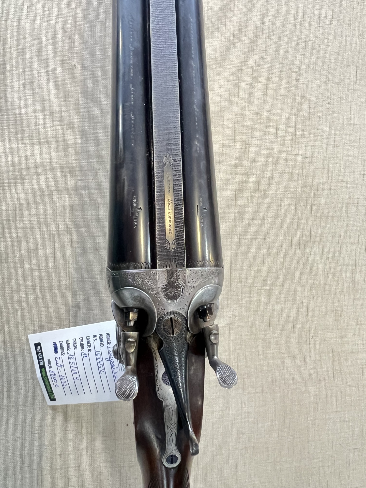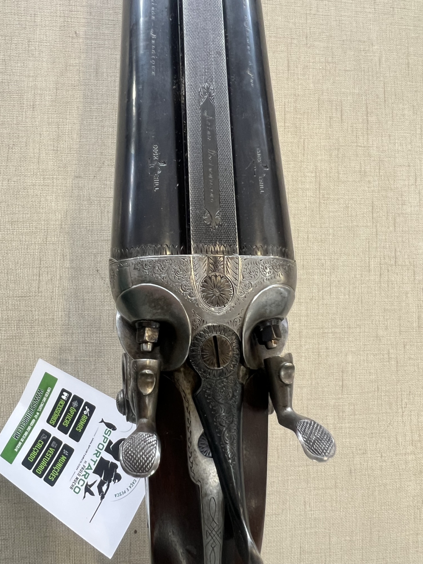 Espingarda de canos lado a lado com detalhes gravados prateados e alavancas