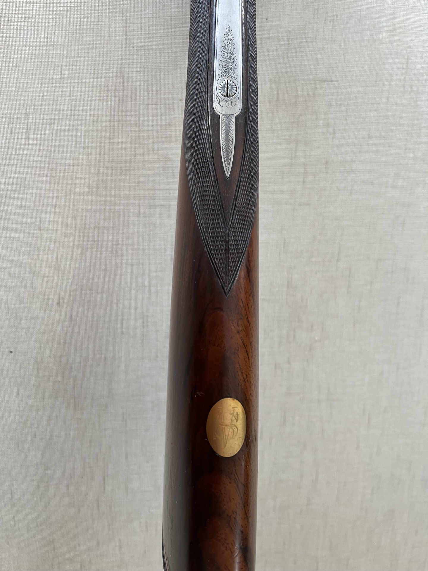 Espingarda de cano duplo com detalhes metálicos gravados e madeira escura
