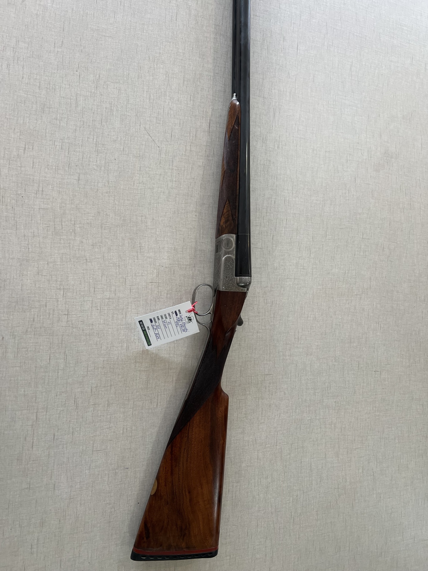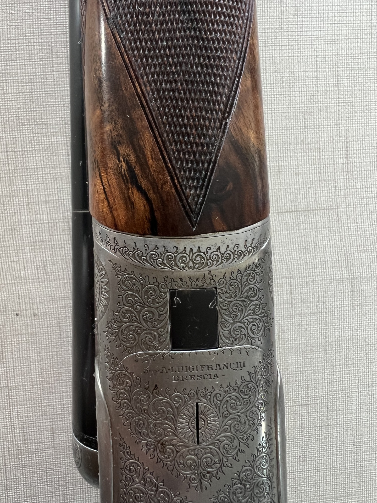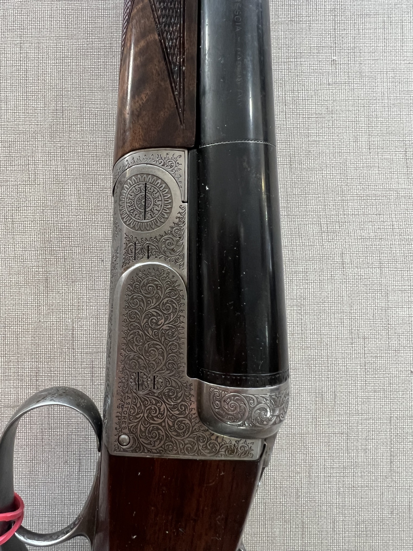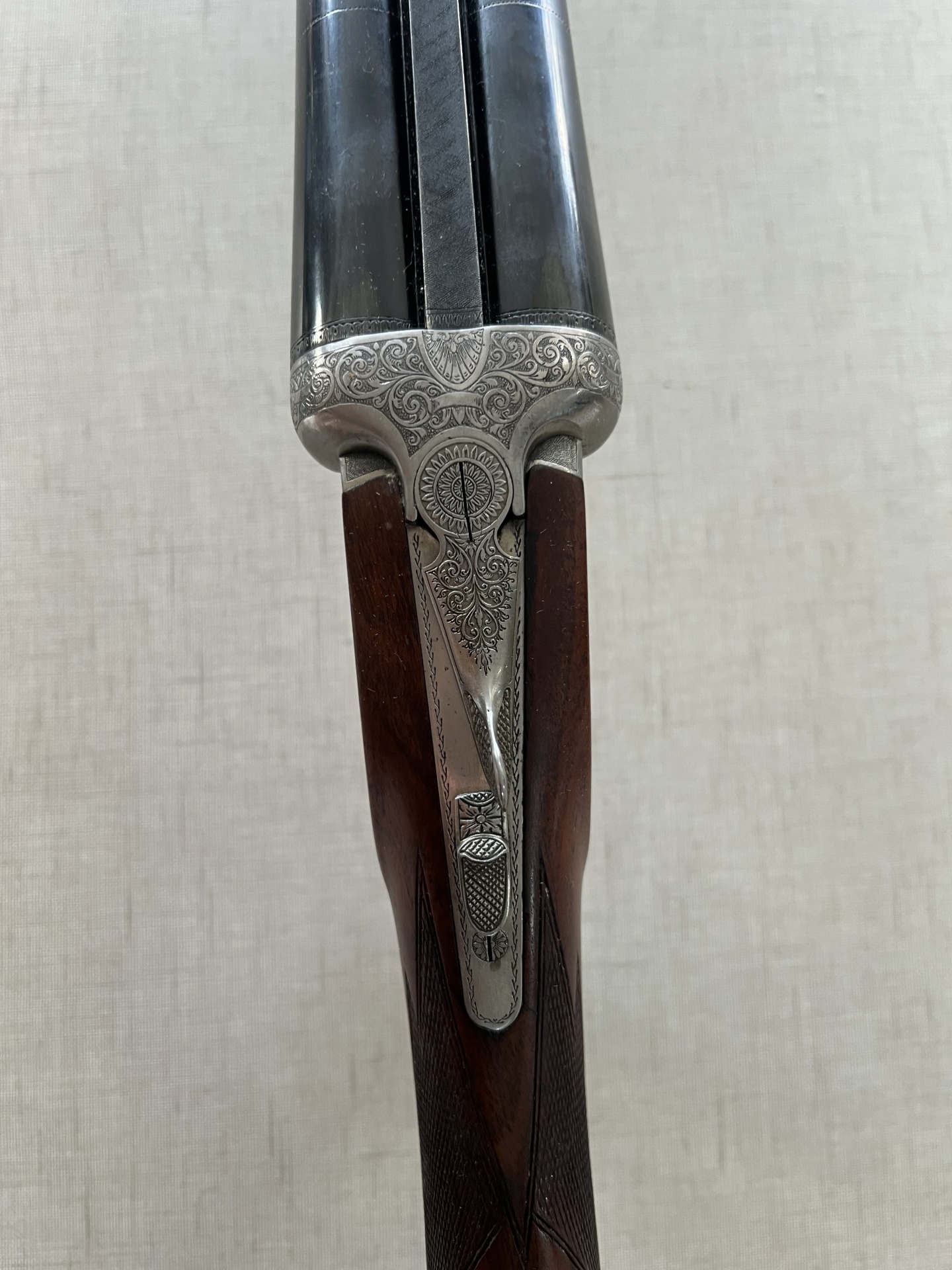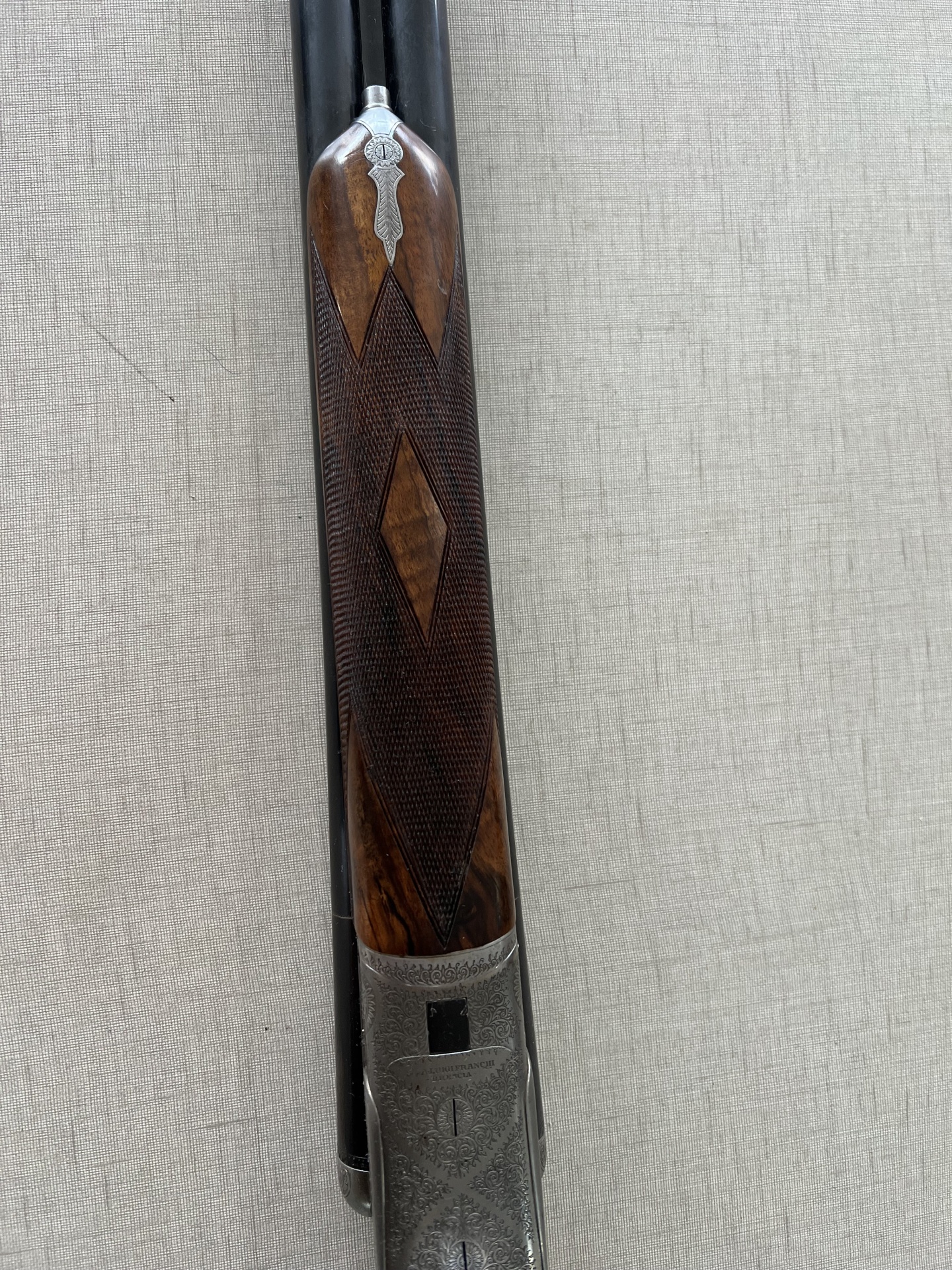 Espingarda de canos duplos com punho em madeira e detalhes metálicos sobre tecido cinzento