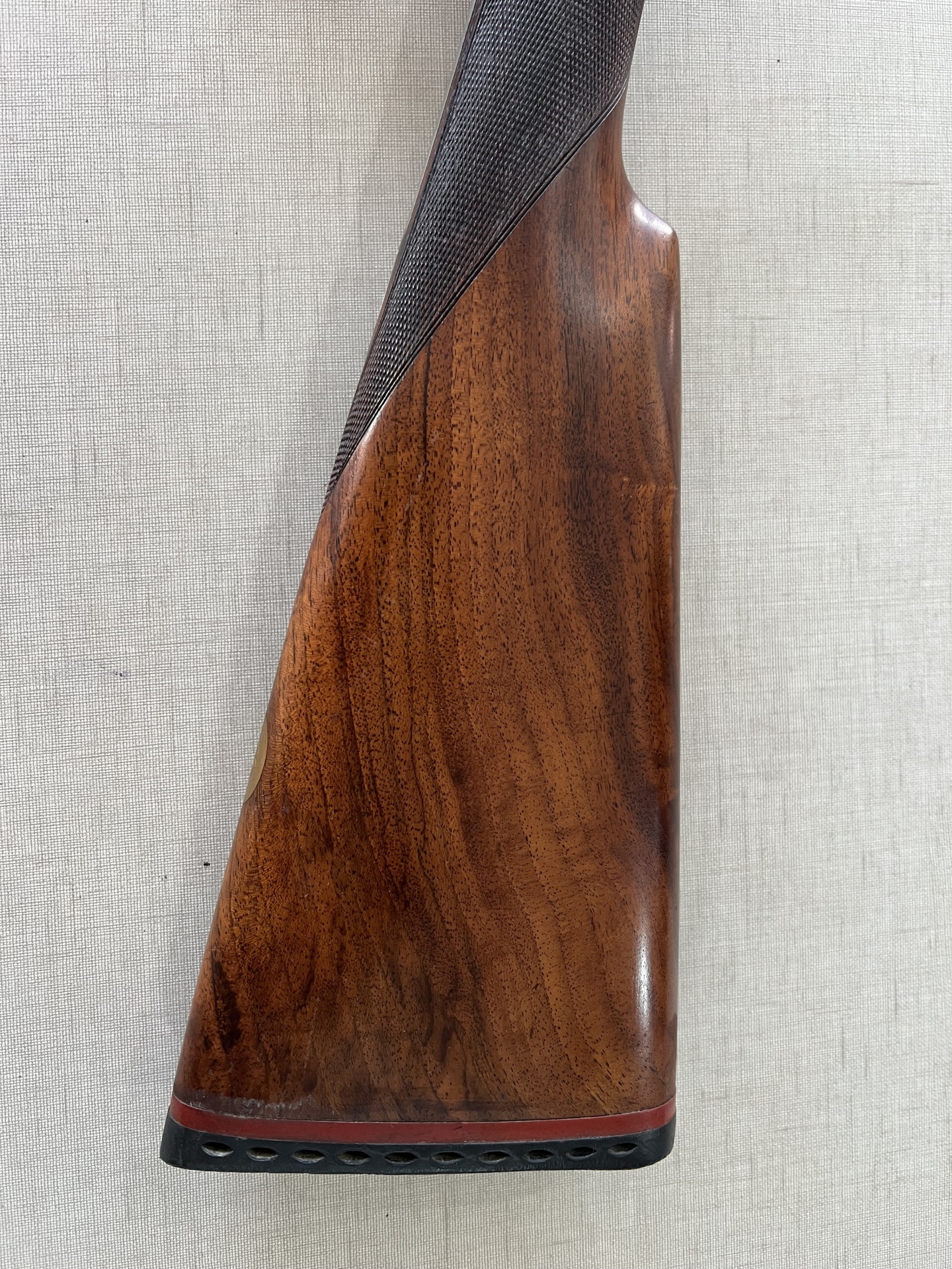 Cabo de espingarda em madeira com metal prateado e etiqueta dourada