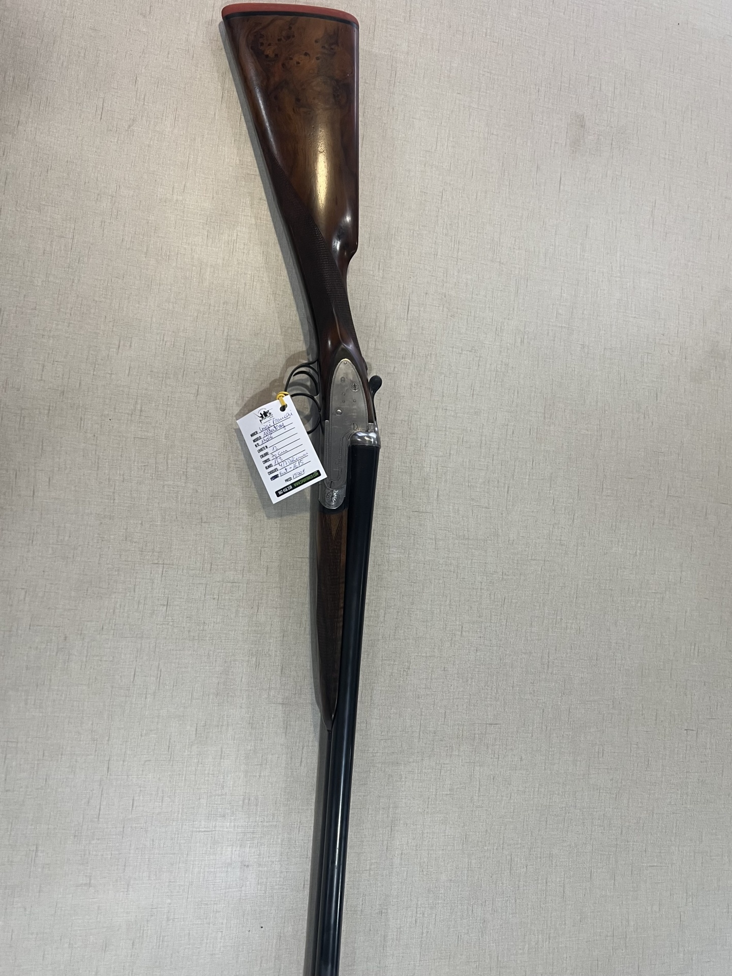 Espingarda com coronha de madeira castanha e canos pretos pendurada na parede
