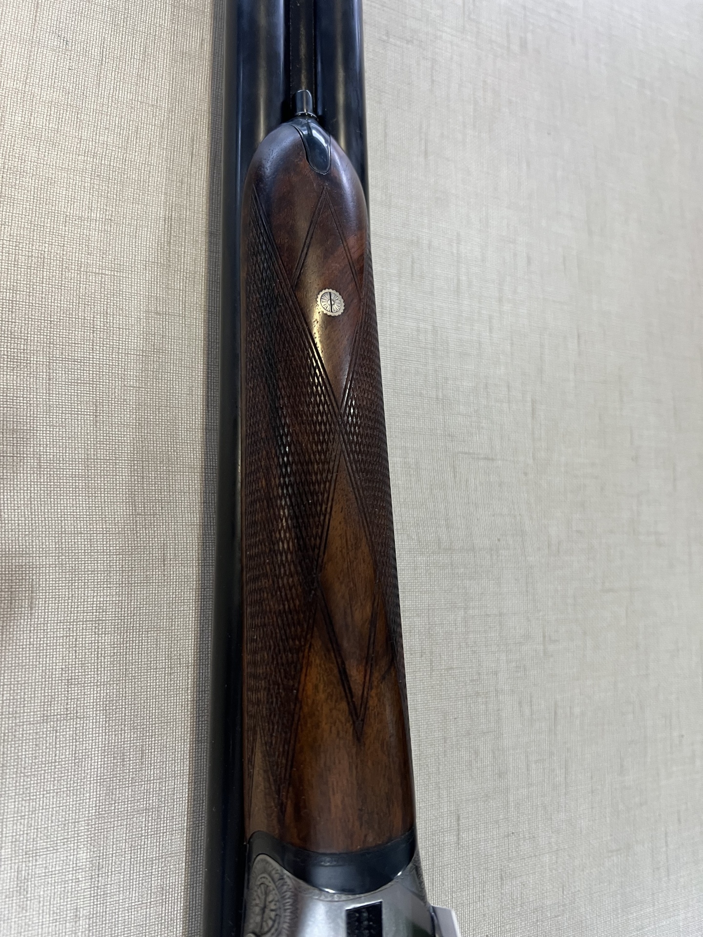 Arma de caça com cabo em madeira castanha e metal prateado sobre tecido bege