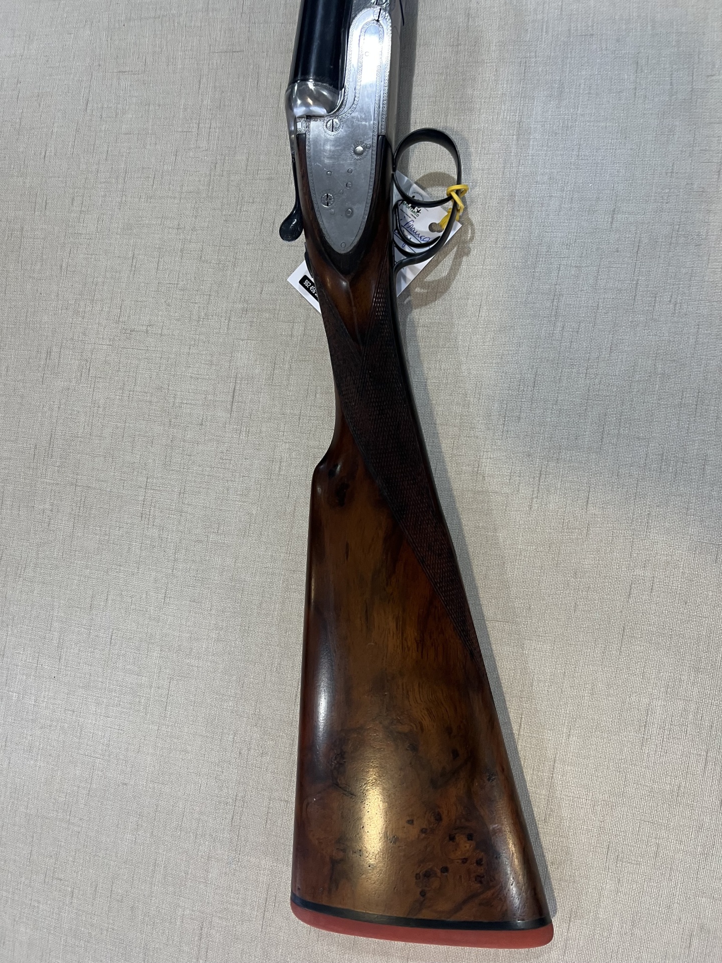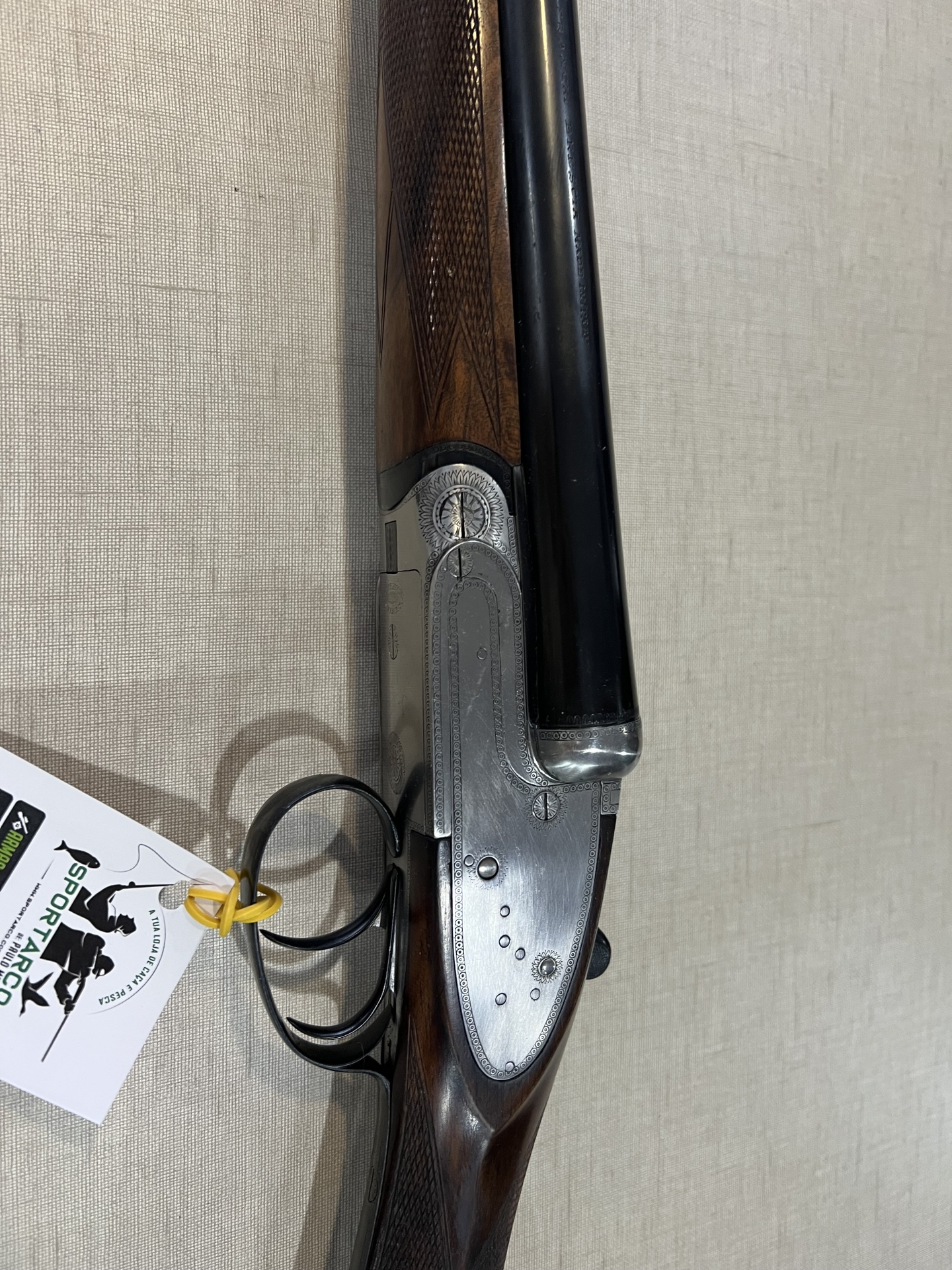 Espingarda com canos pretos e coronha de madeira trabalhada