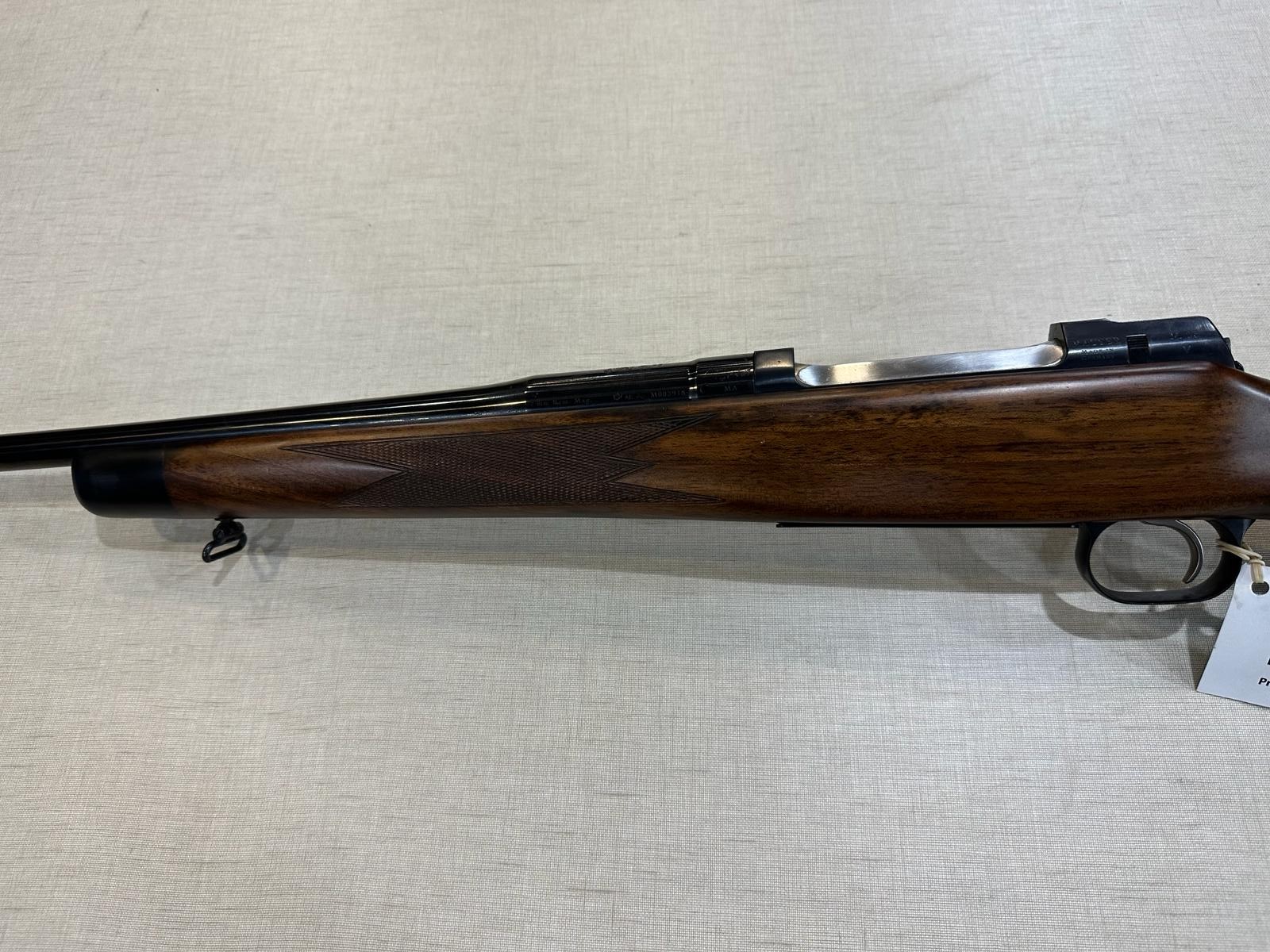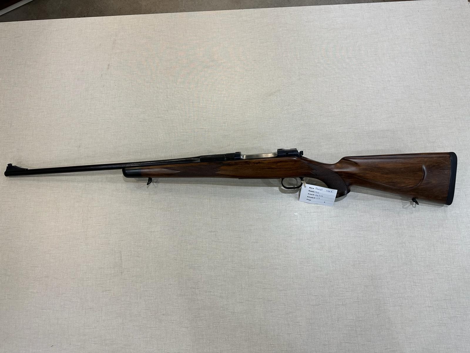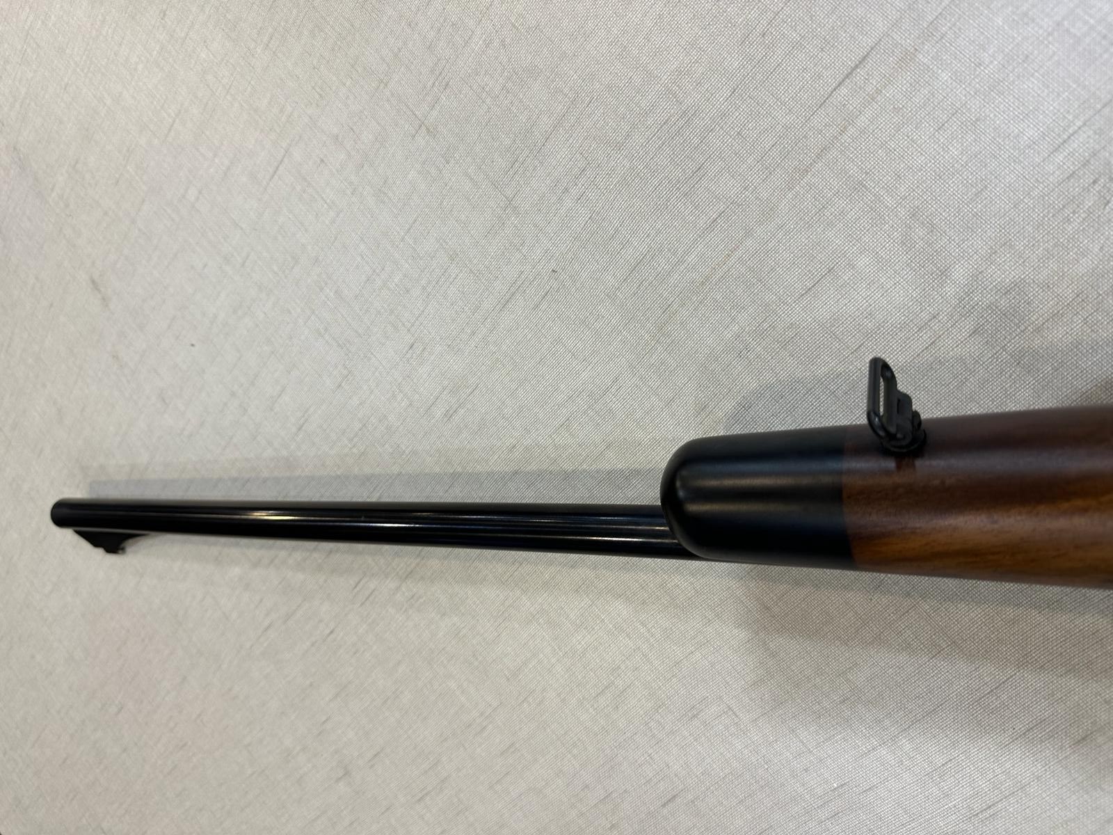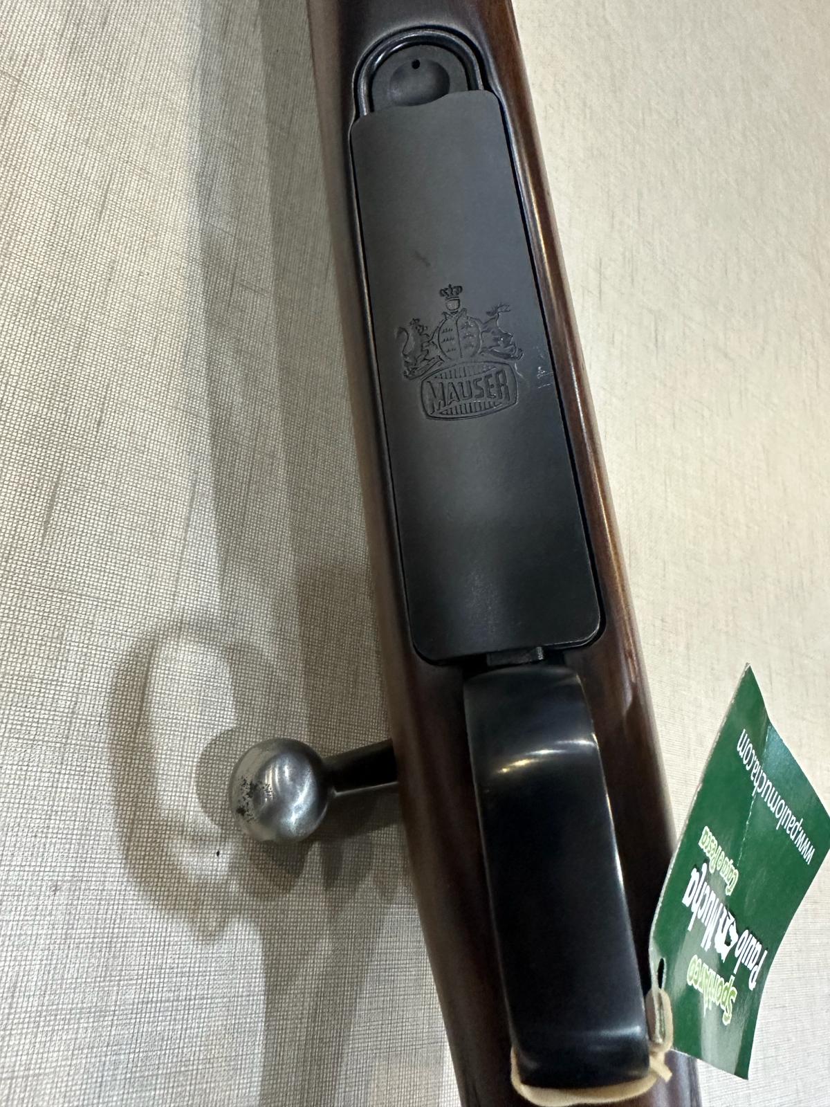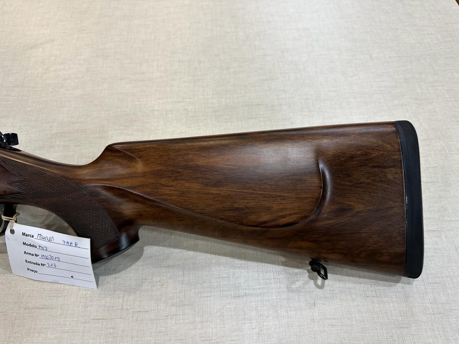 Espingarda com coronha de madeira escura e etiqueta pendurada