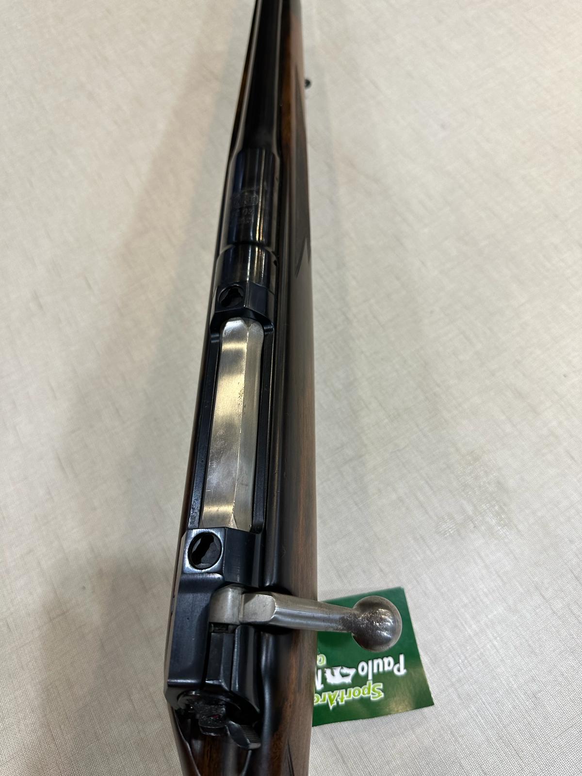 carabina com coronha de madeira e mecanismos metálicos em bancada clara