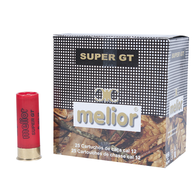 Cartucho de caça calibre 12 Melior Super GT e embalagem preta com padrão quadriculado