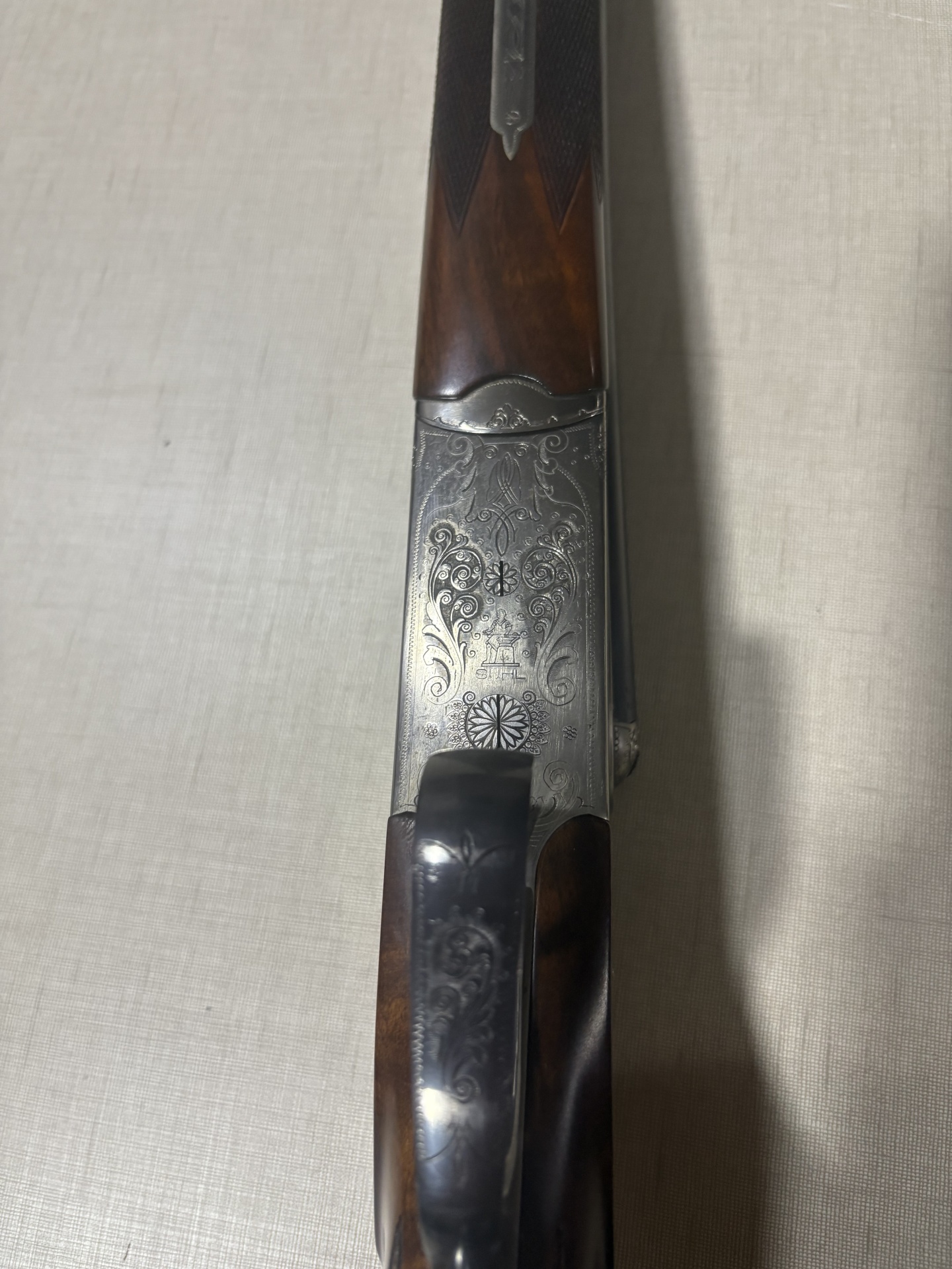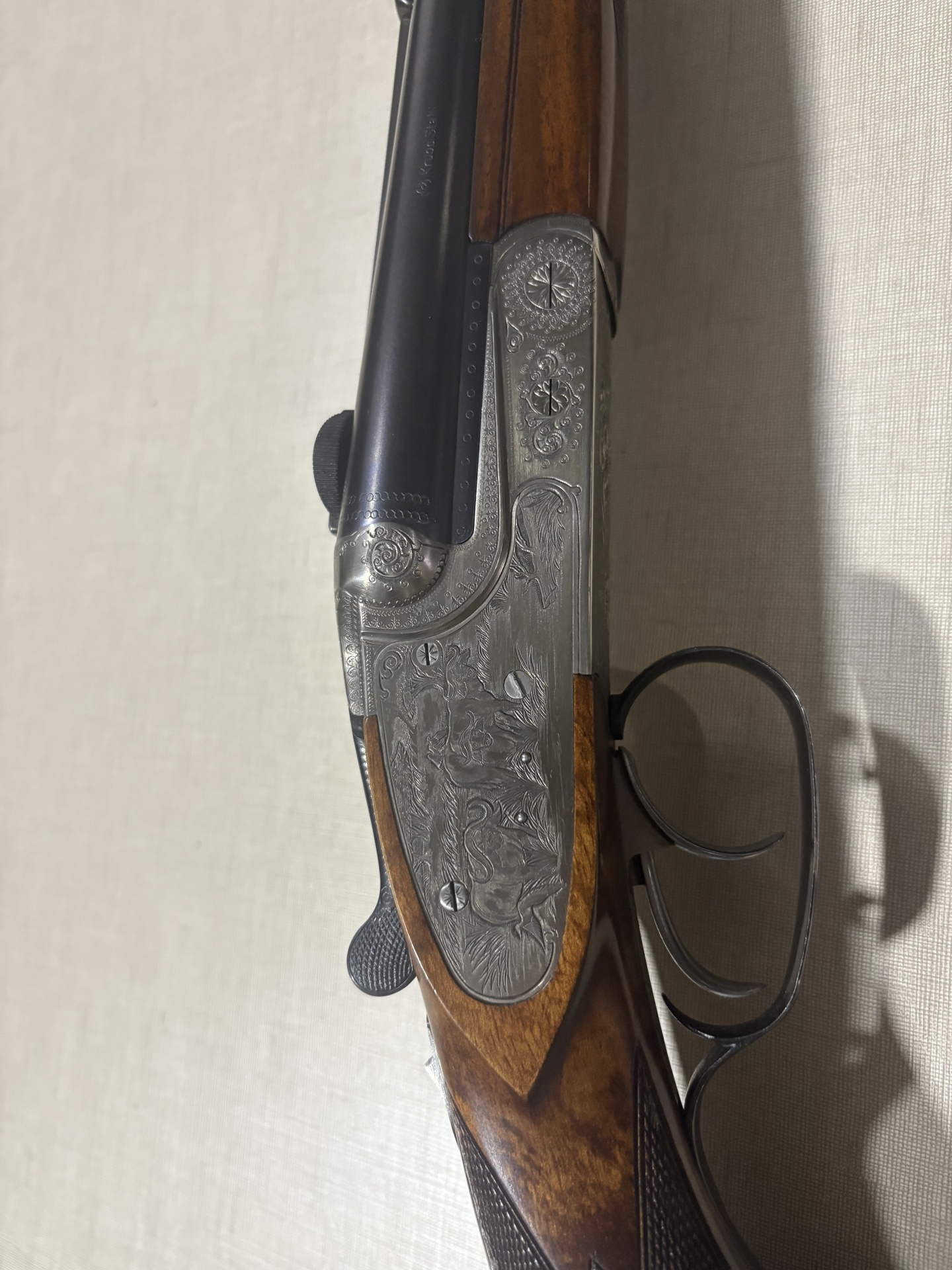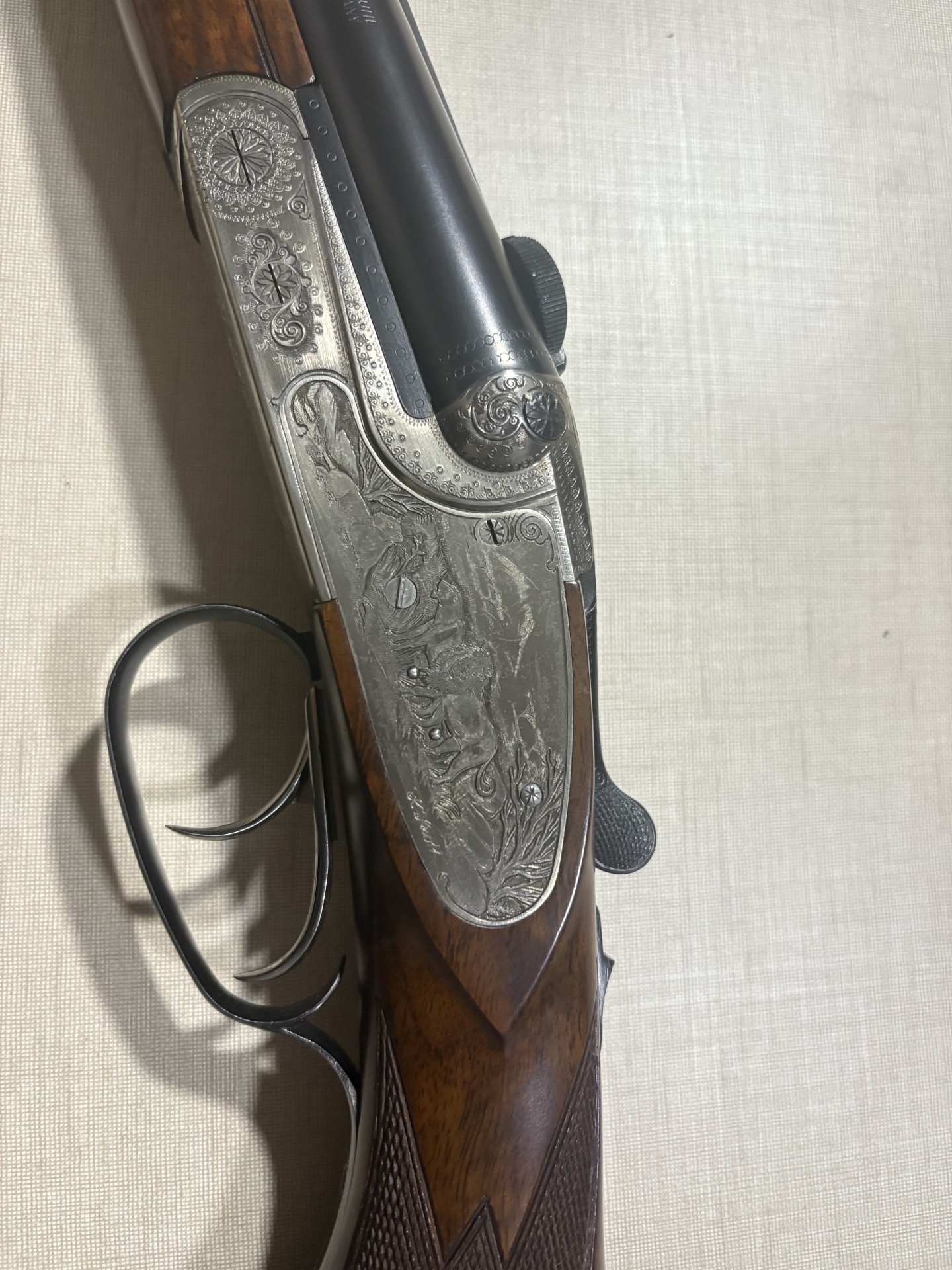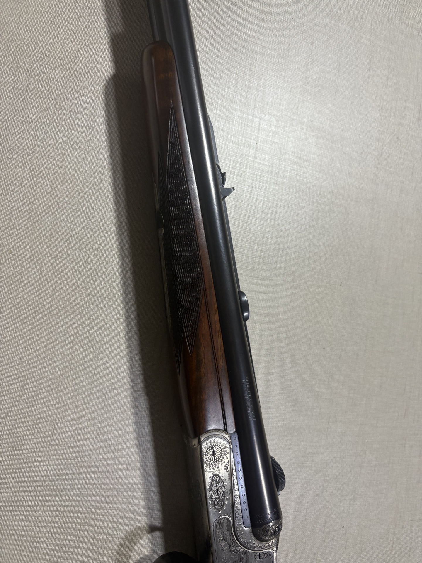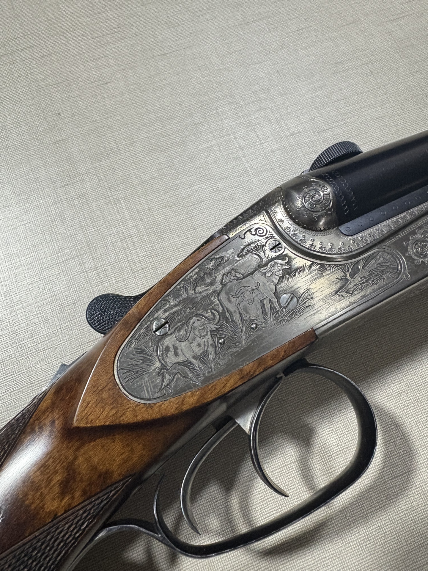 Espingarda de canos duplos com gravações em metal e empunhadura em madeira castanha.